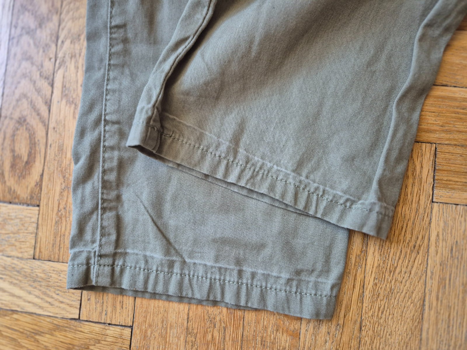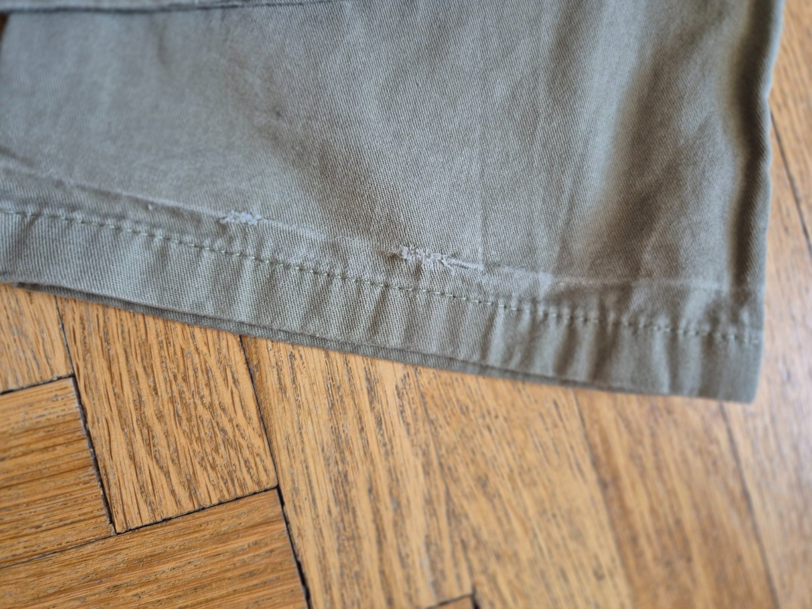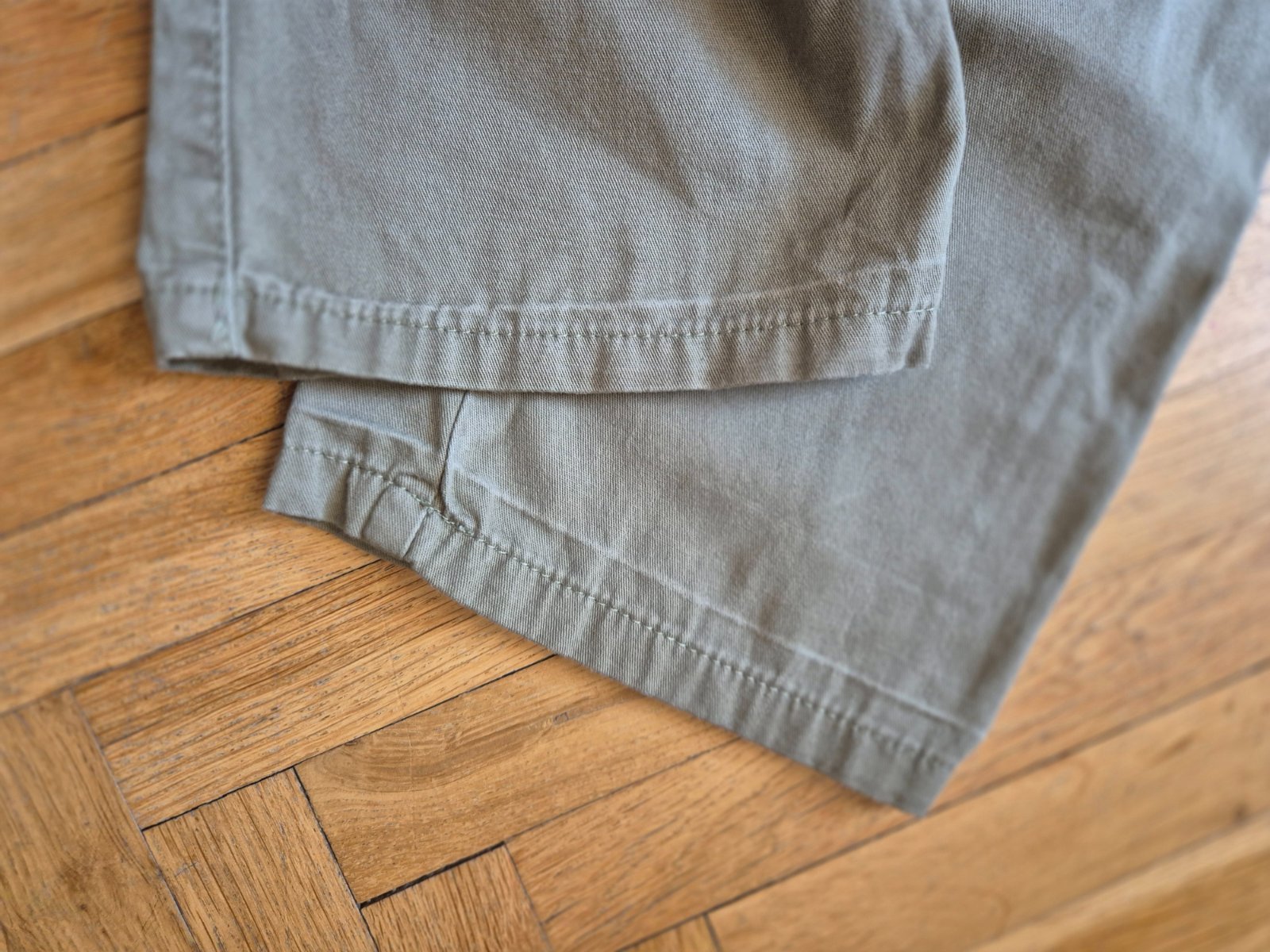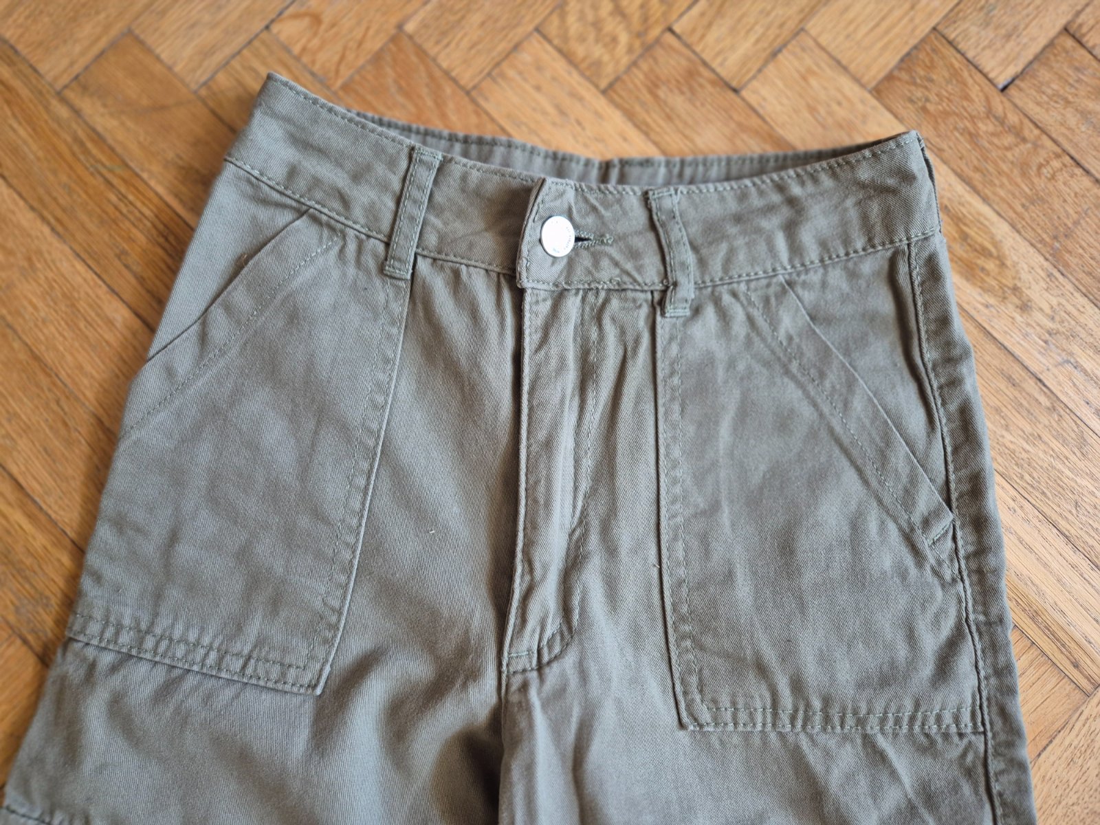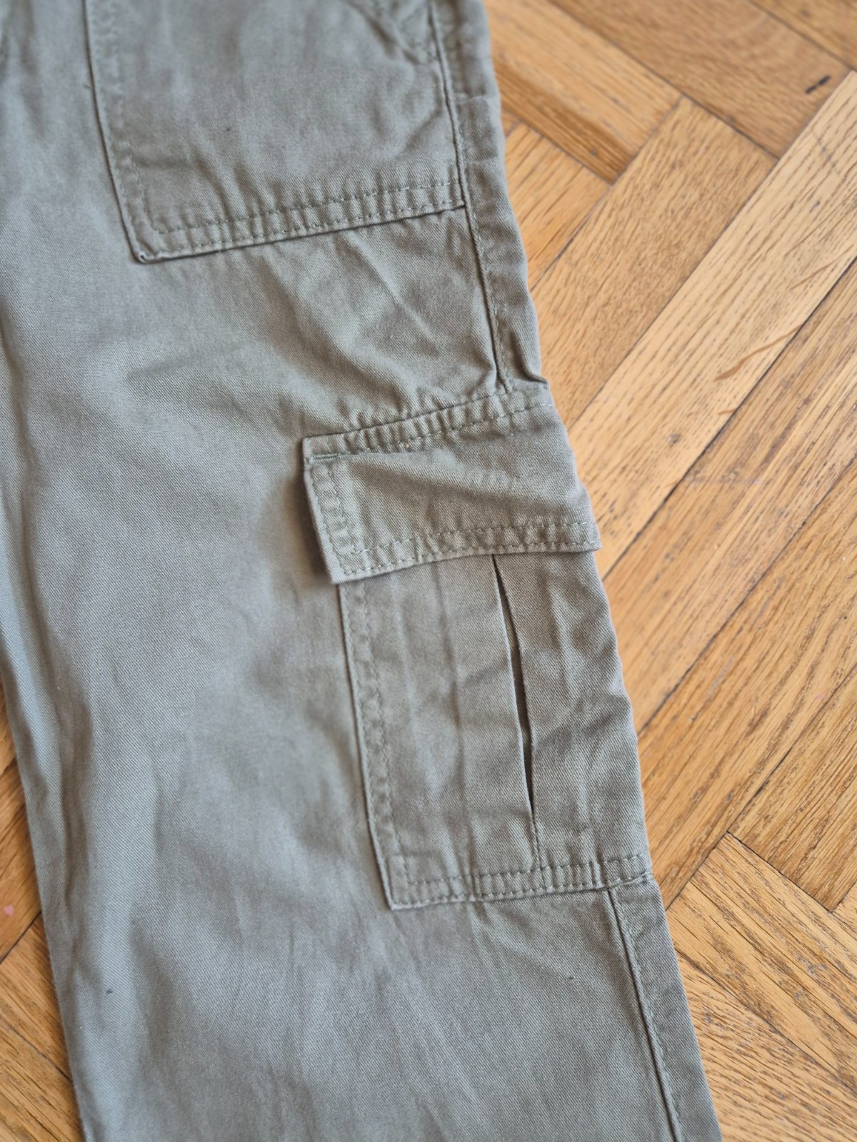 Kupované nové, zkracovala jsem nohavice a pak znovu popouštěla, je to na nich vidět (světlý vodorovný proužek asi 3 cm nad spodním lemem), na jedněch kalhotách prodřené (a zašité) viz foto, jinak ale stále moc pěkné