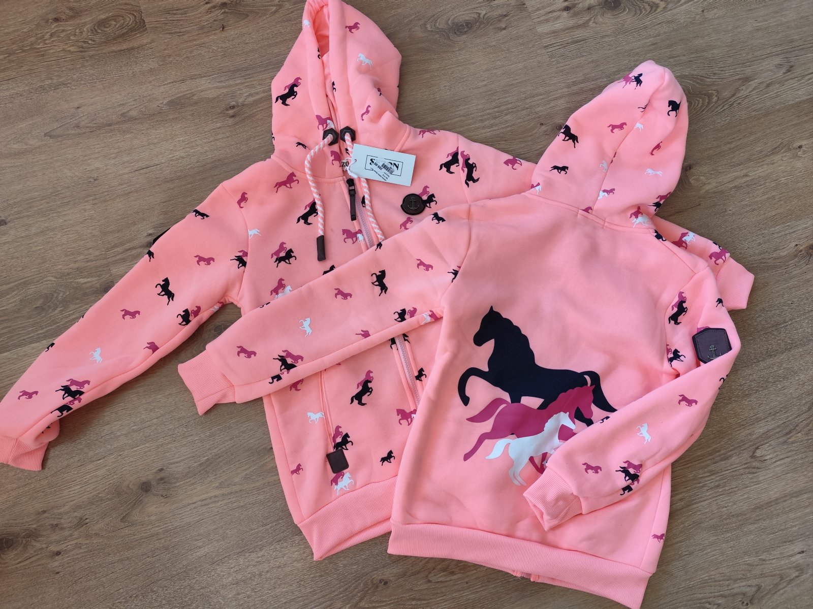 Nenošené mikiny, holky mi nechtějí nosit růžovou barvu a mikiny s potiskem, kupovala babička jako lososovou barvu, ale je taková lososovo - růžová svítivá.