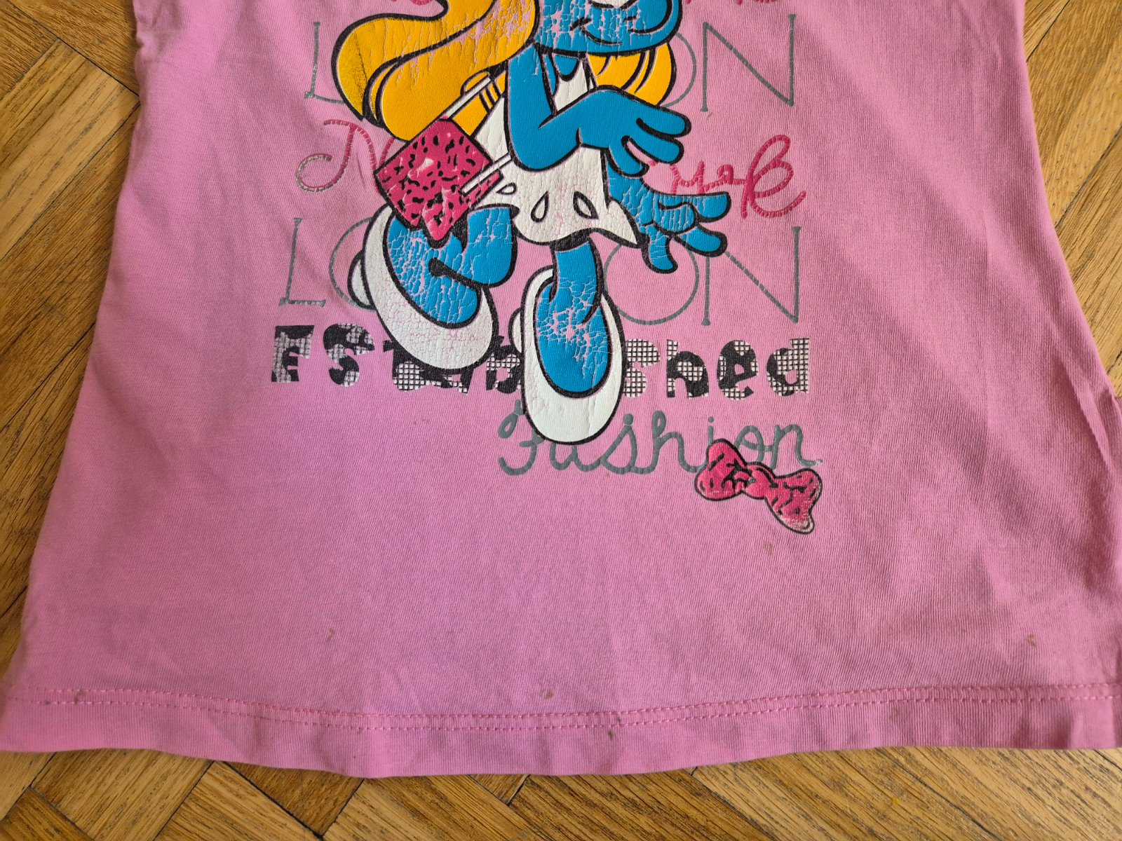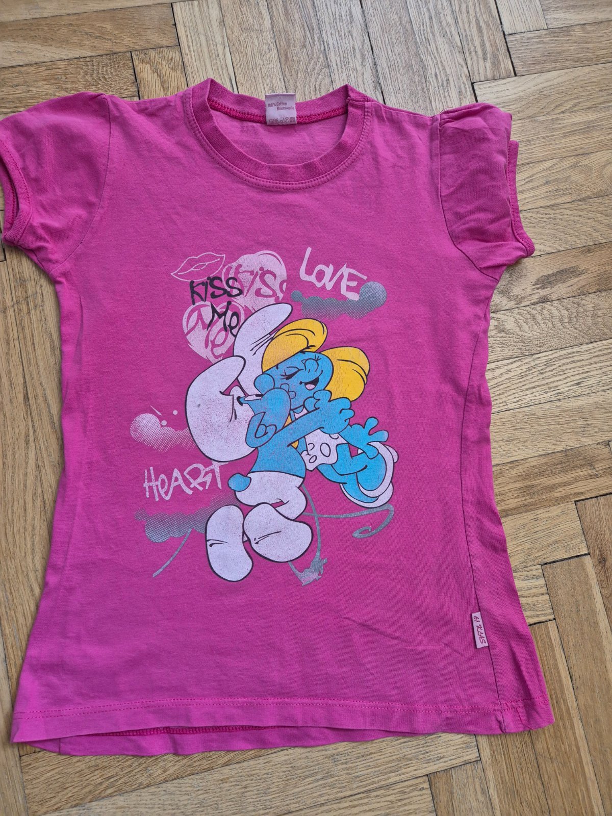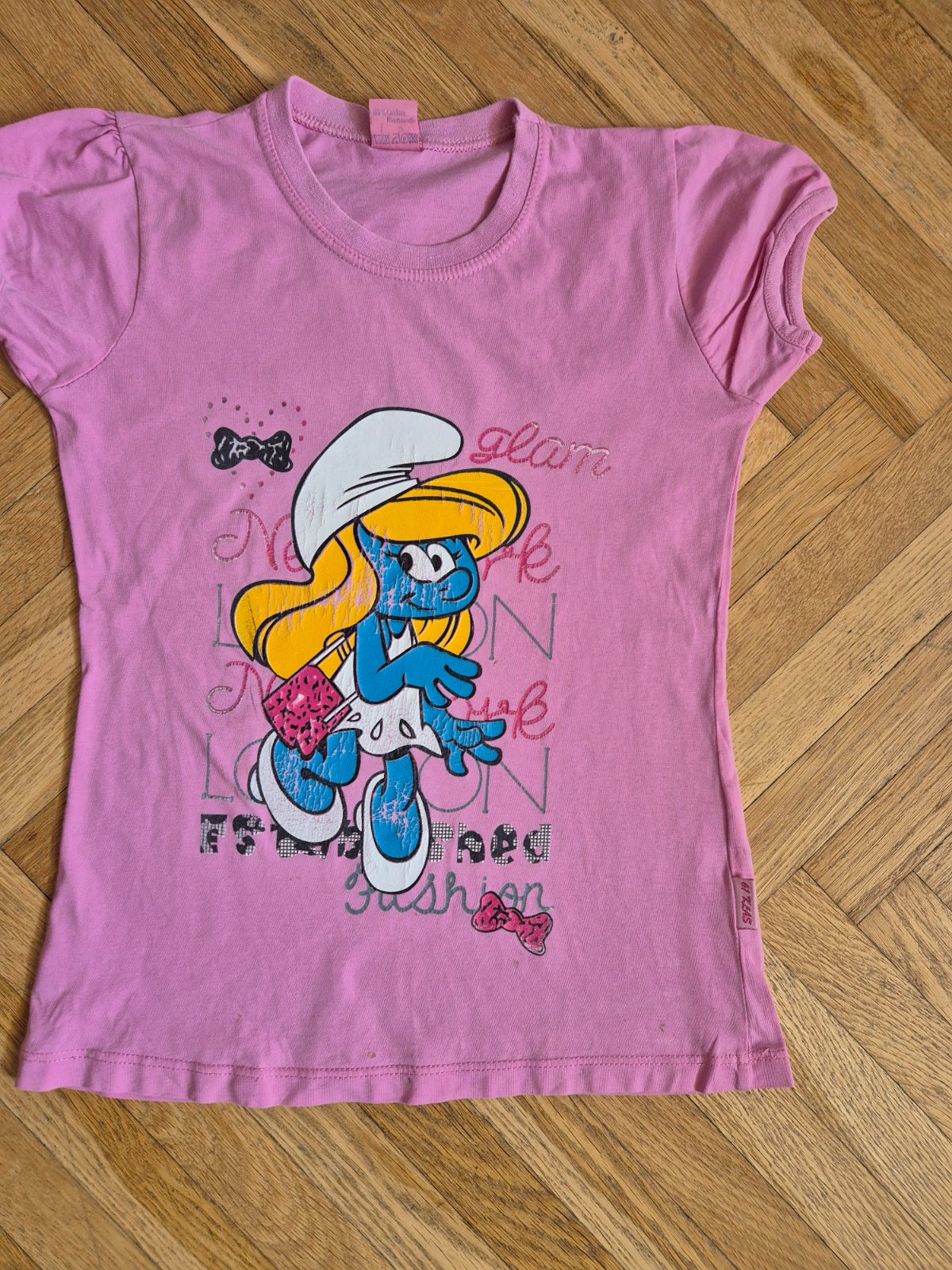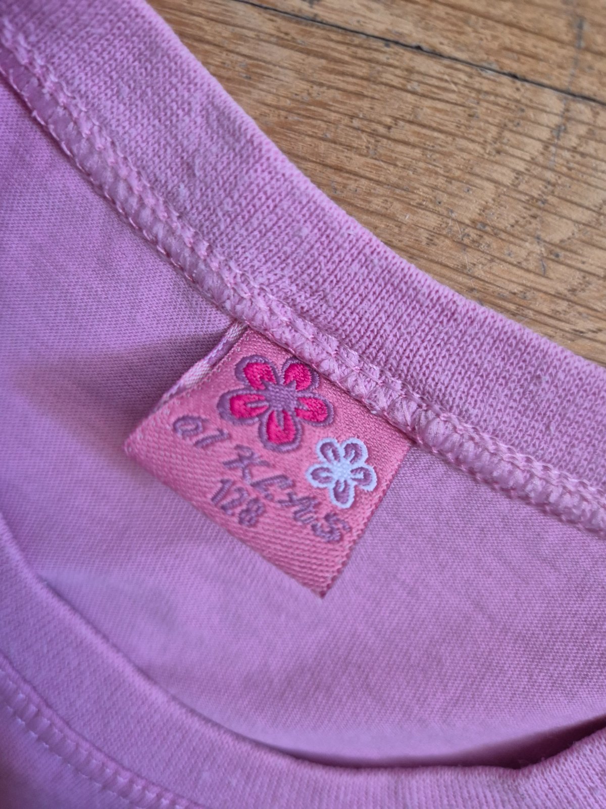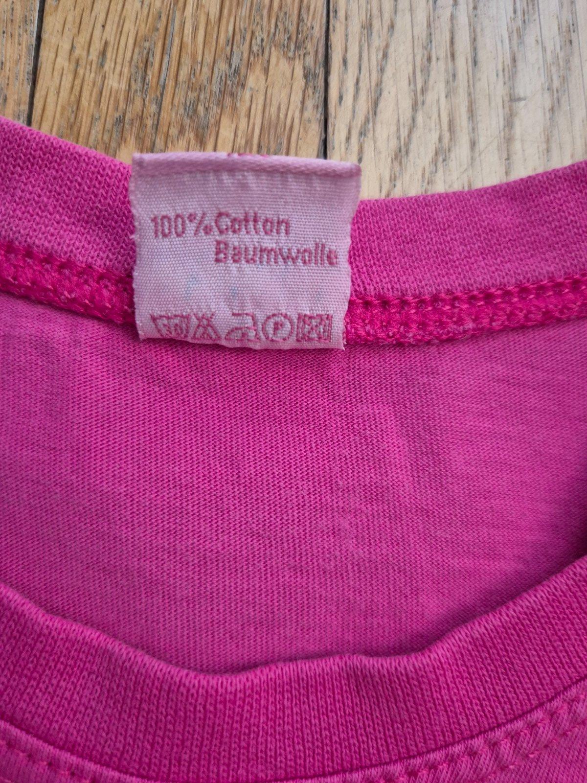 Vel 128, na donošení, světle růžové ma popraskaný obrázek a flíčky od pampelišky na spodním okraji (dávám zdarma)