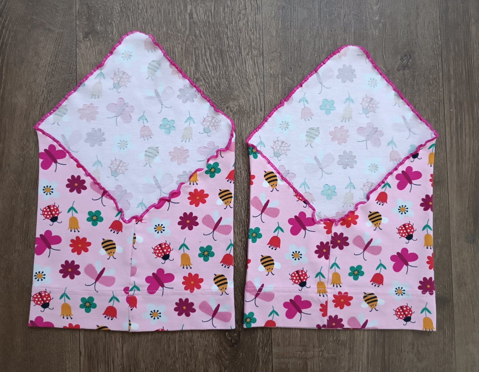 Prodám dva stejné dívčí bavlněné šátečky s motivem včeliček, berušek, motýlků a kytiček. Velikost 4 (45-48 cm), pružné, nošené okolo 2 let, 96% bavlna, 4% elastan, česká výroba. Hezký stav, cena za kus.