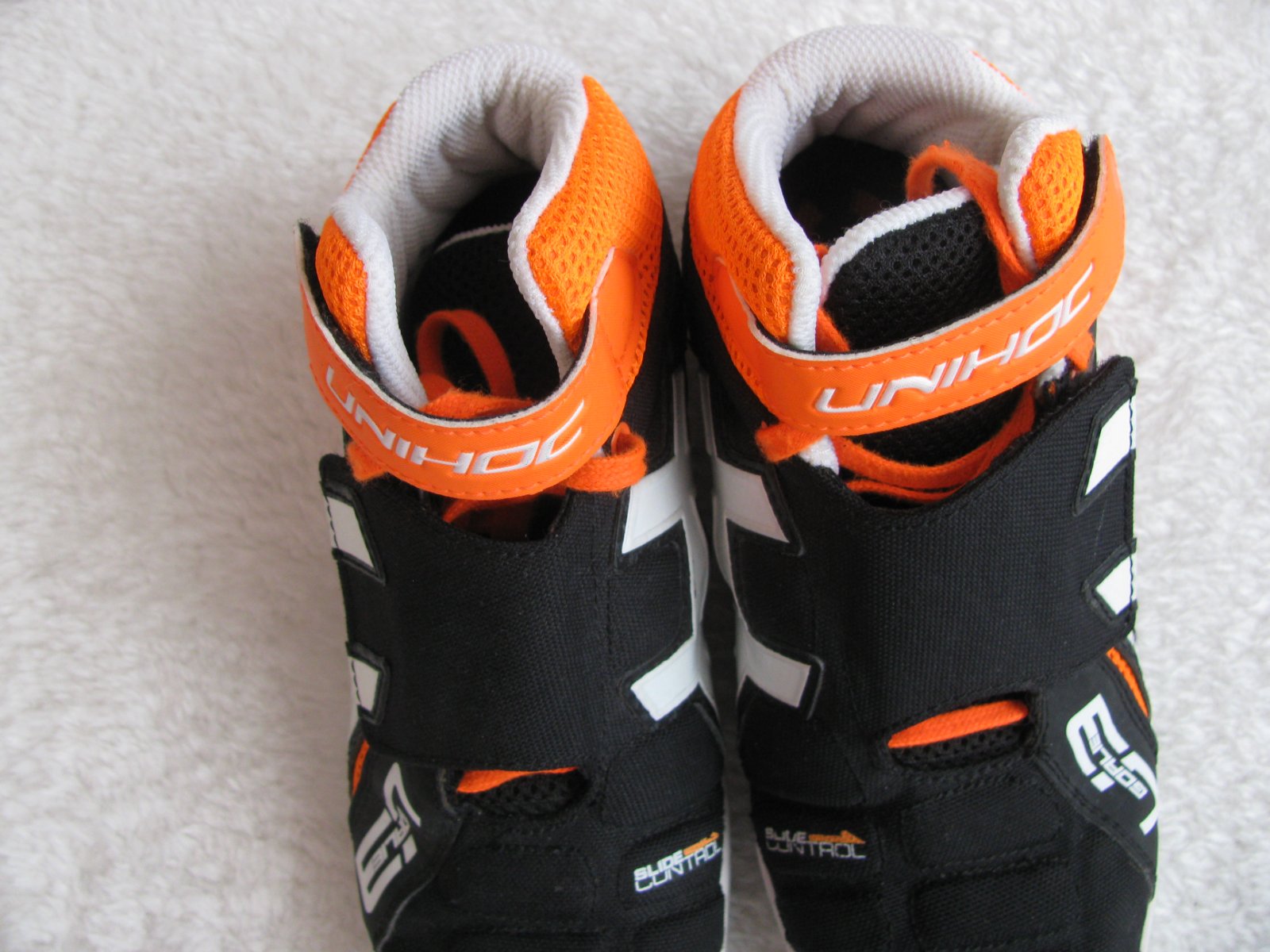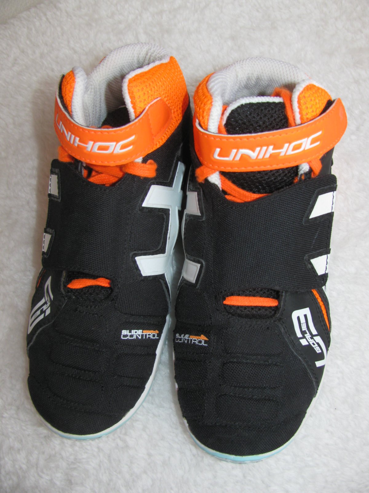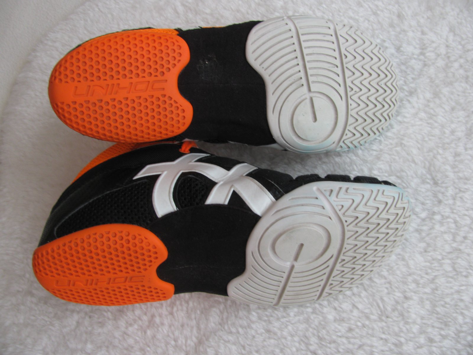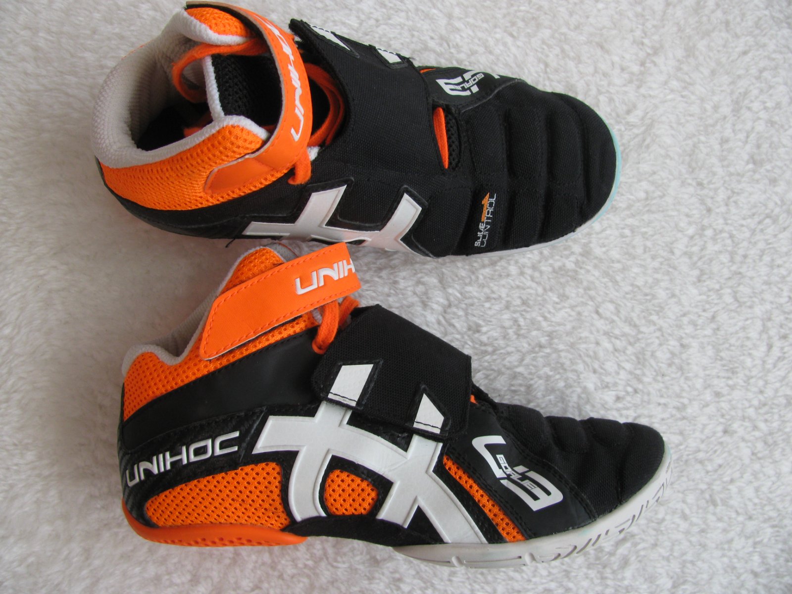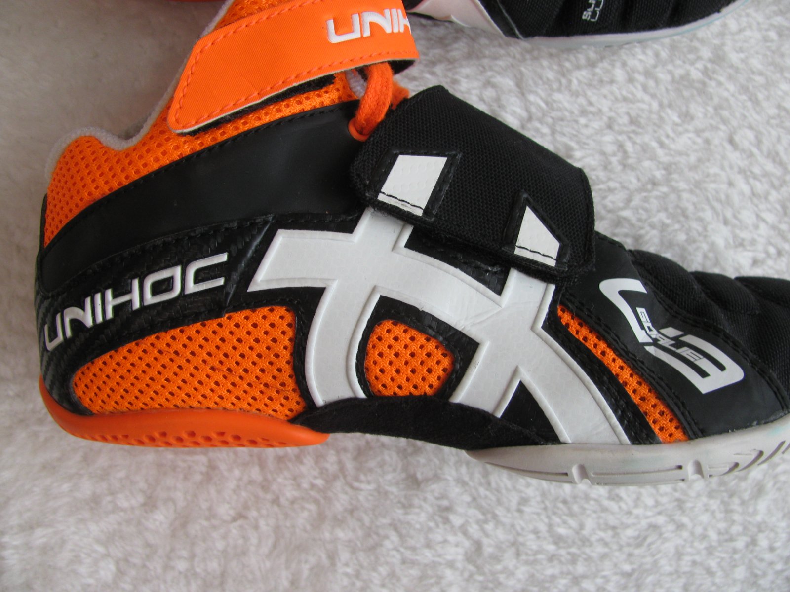 Krásná sportovní obuv na florbal, zavaz. na tkaničky + suché zipy, měkká neporušená stélka,. Lehký otěr na vnější straně jedné boty-viz foto, špičky lehce namodralé, jinak top stav bez vady. Toho času už nejsou na trhu. PC velmi vysoká.
