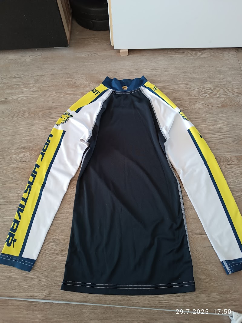 Černý elastický sportovní dres, s vypolstrovanými lokty, logo, 100% polyester. Značka SALLER Velikost M Rozměry dél.od ramene zadní a přední díl -73cm,70cm,,,hruď-2x50cm,,boky-2x52cm,,,dél.rukávu...