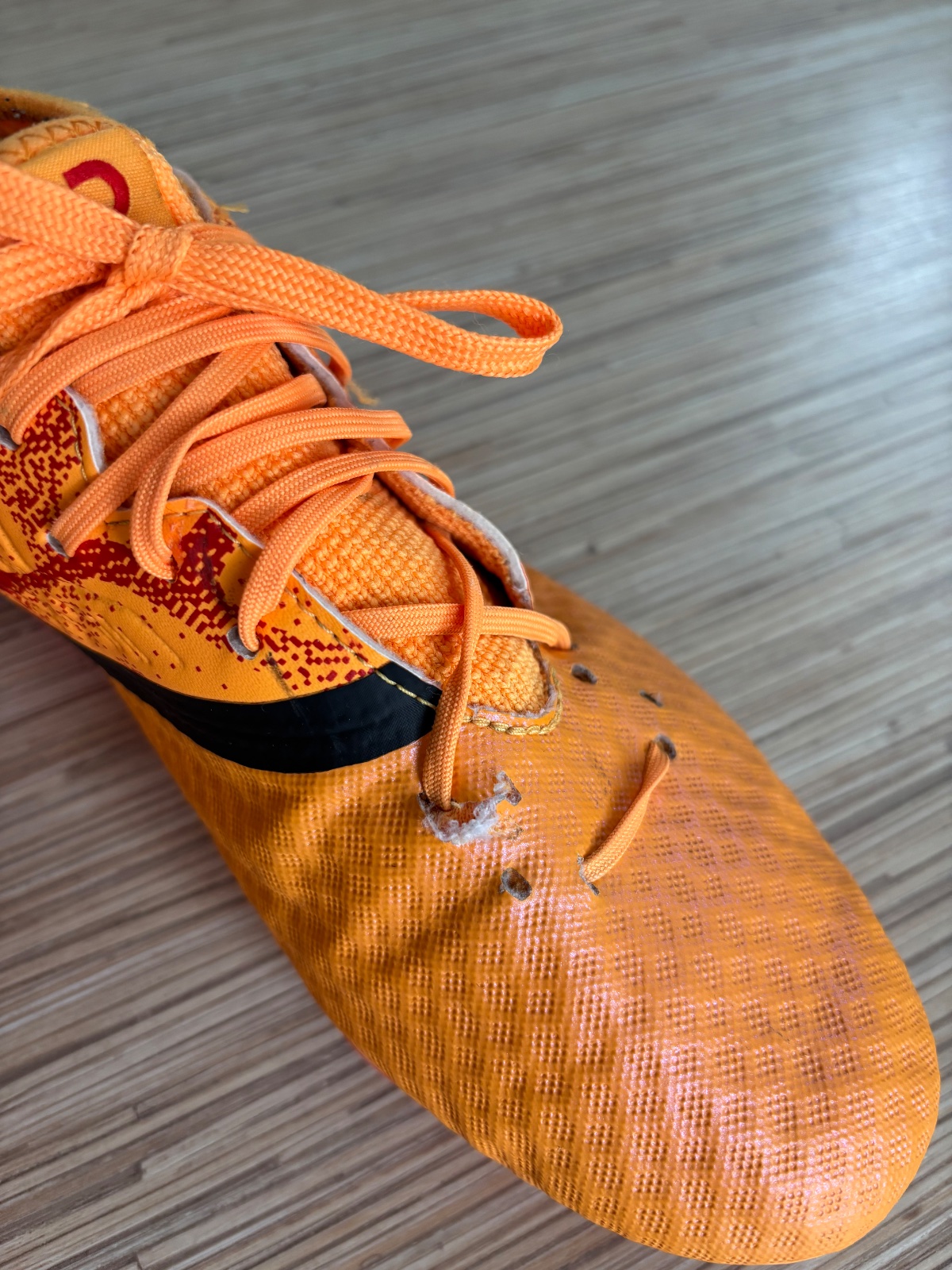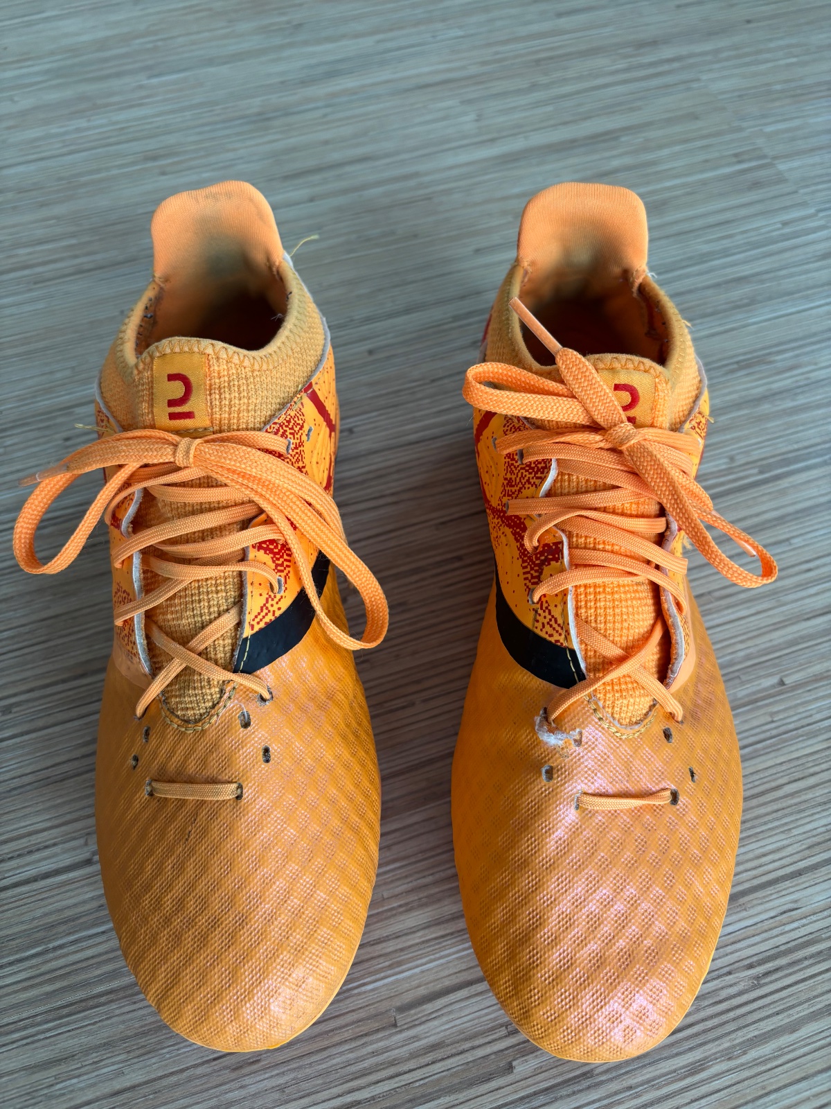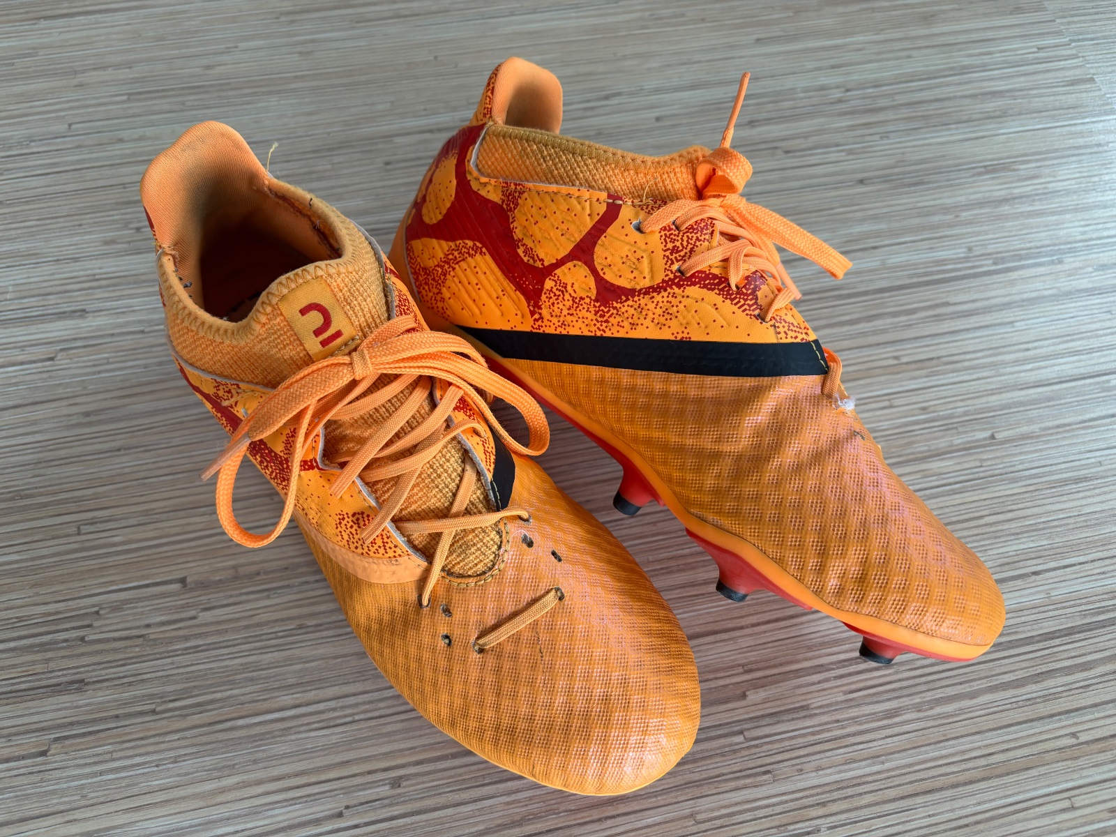 Kupované v Decathlonu. Zachovalý stav. Délka stélky 24,5cm. Na levé kopačce natržená vrchní vrstva viz. foto. Nošení ničemu nevadí. Zohledněno v ceně.