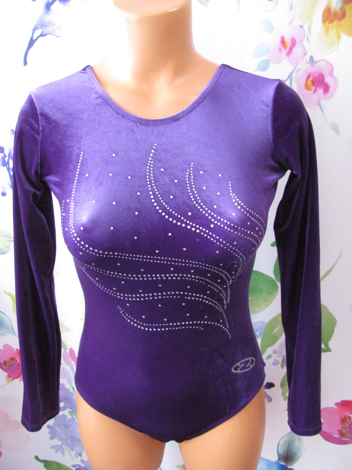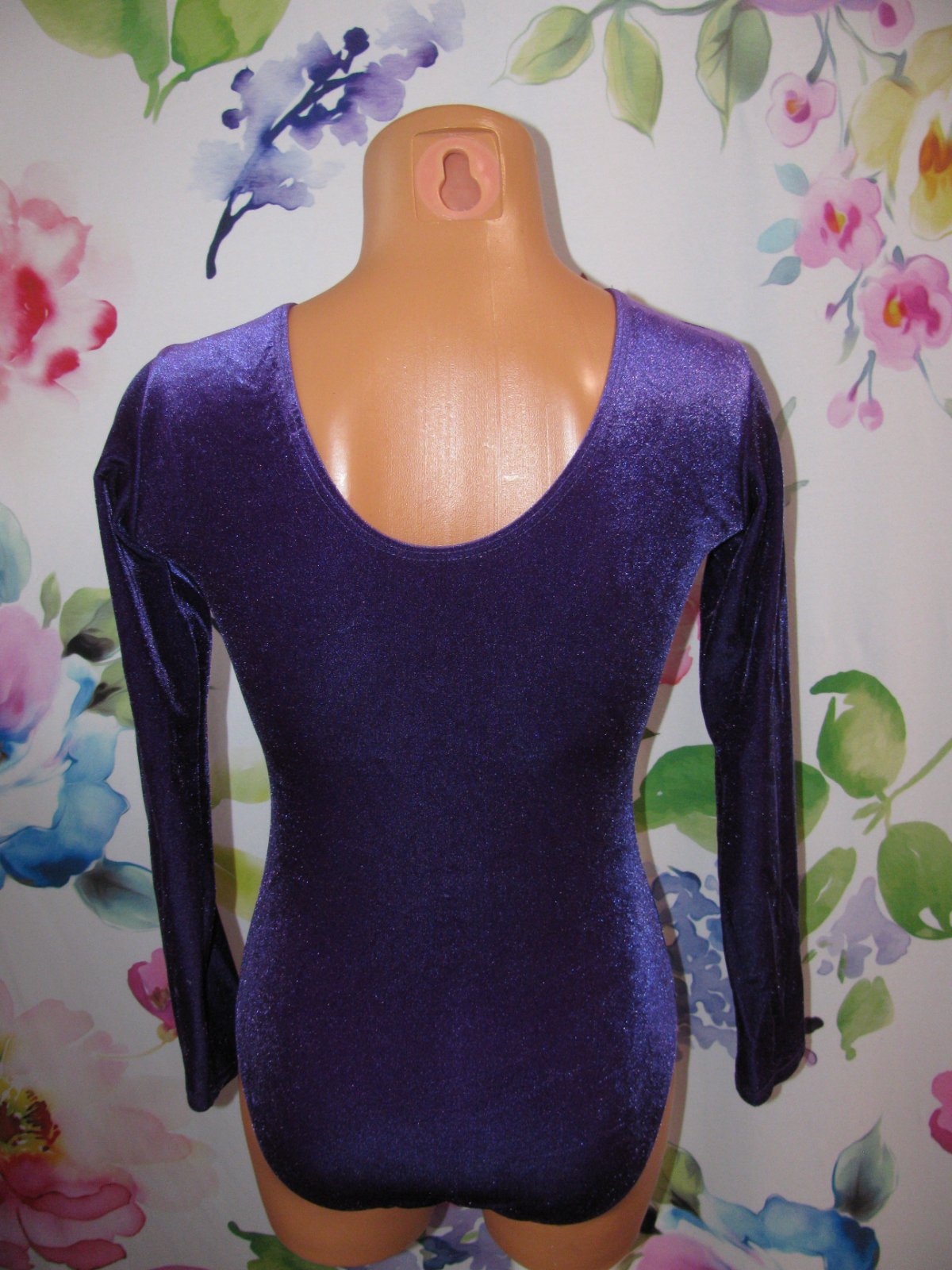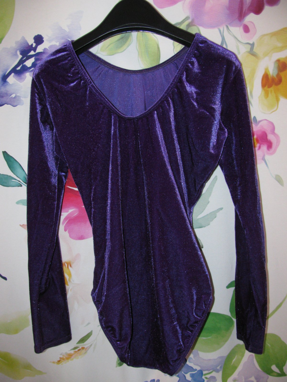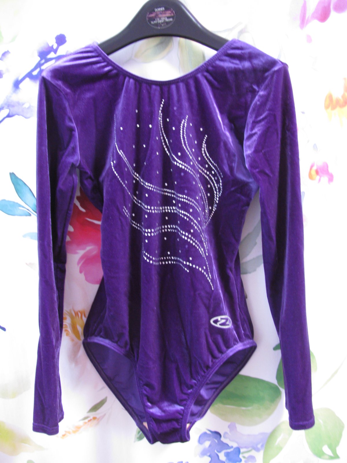 Krásný fialový, velurový dres, s lesklými kamínkami, pajetkami, logo, čisté v mezinoží, 85% polyamid, 15% lycra. Tři velmi slabé flíčky na spodním rukávu, jinak bez vady krásný stav.