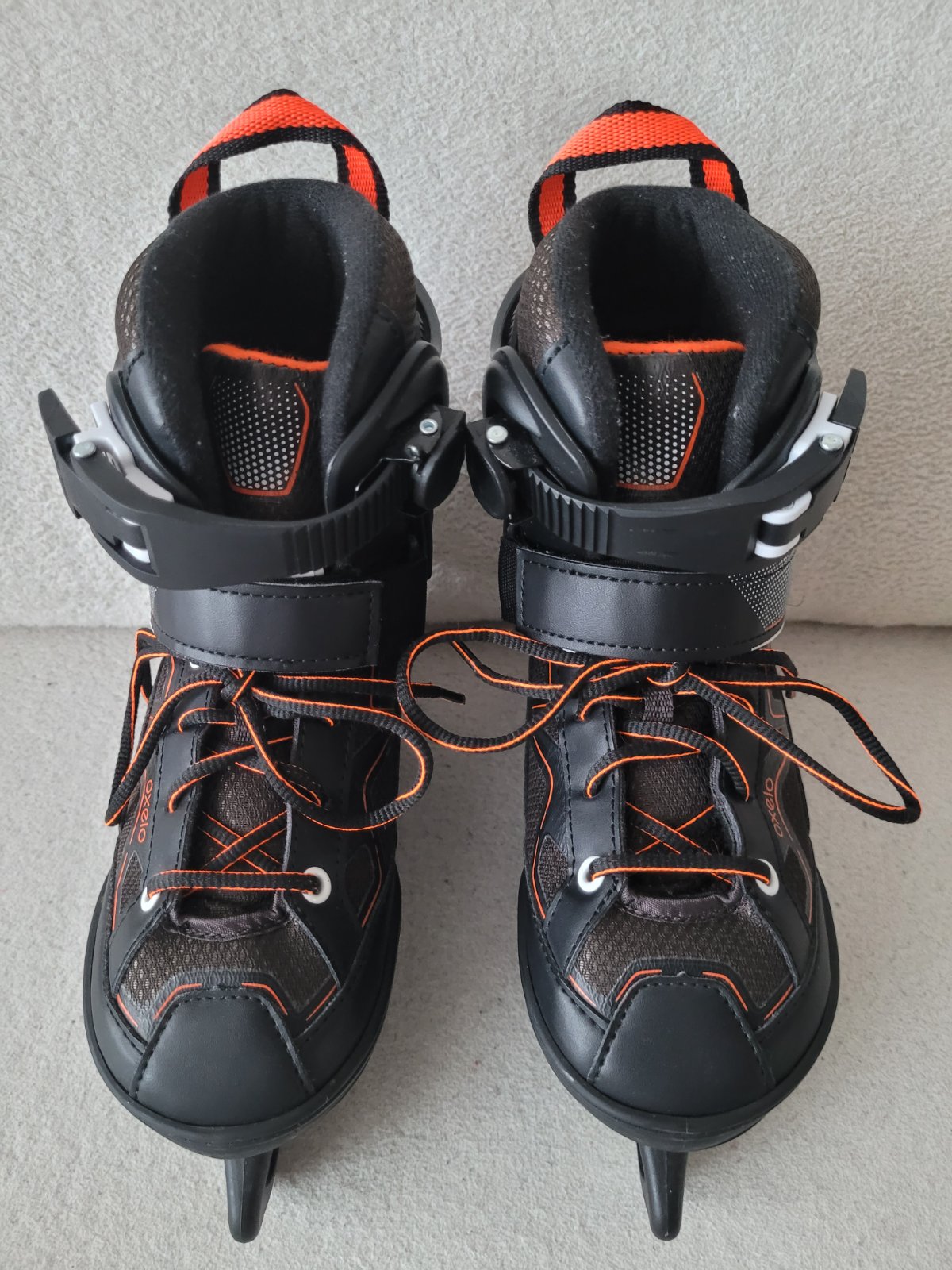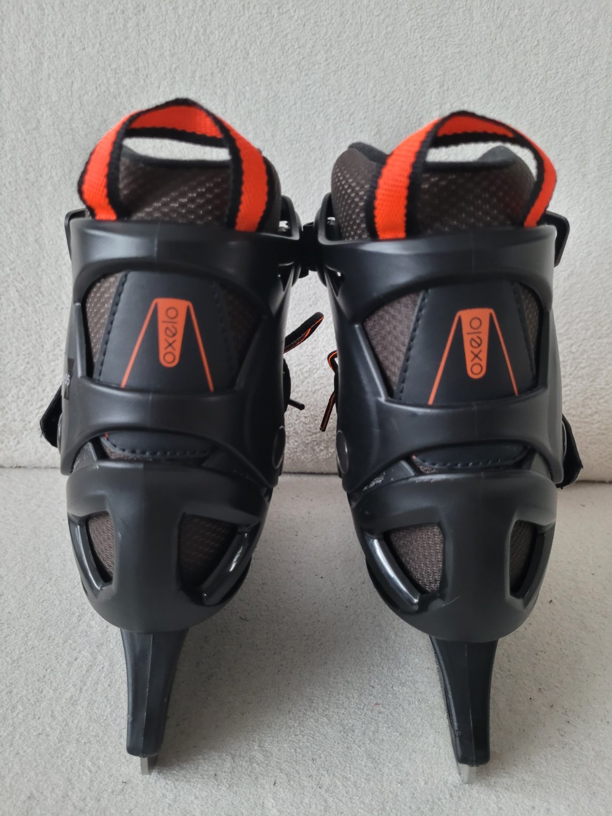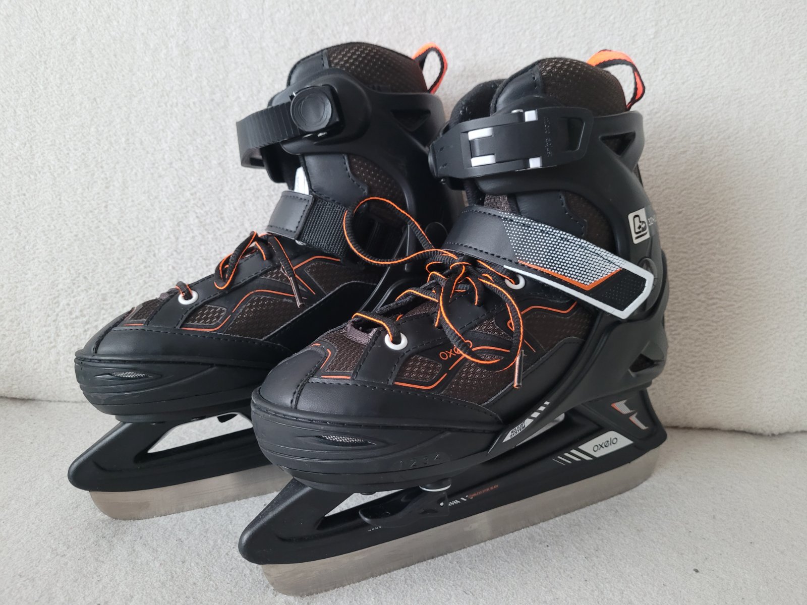 Rostoucí brusle na led zn.Oxelo (z Decathlonu) černé barvy s oranžovými detaily, zapínání na suchý zip, přesku a zavazování, poutko na nošení/snadnější obouvání, chrániče nožů na transport součástí.