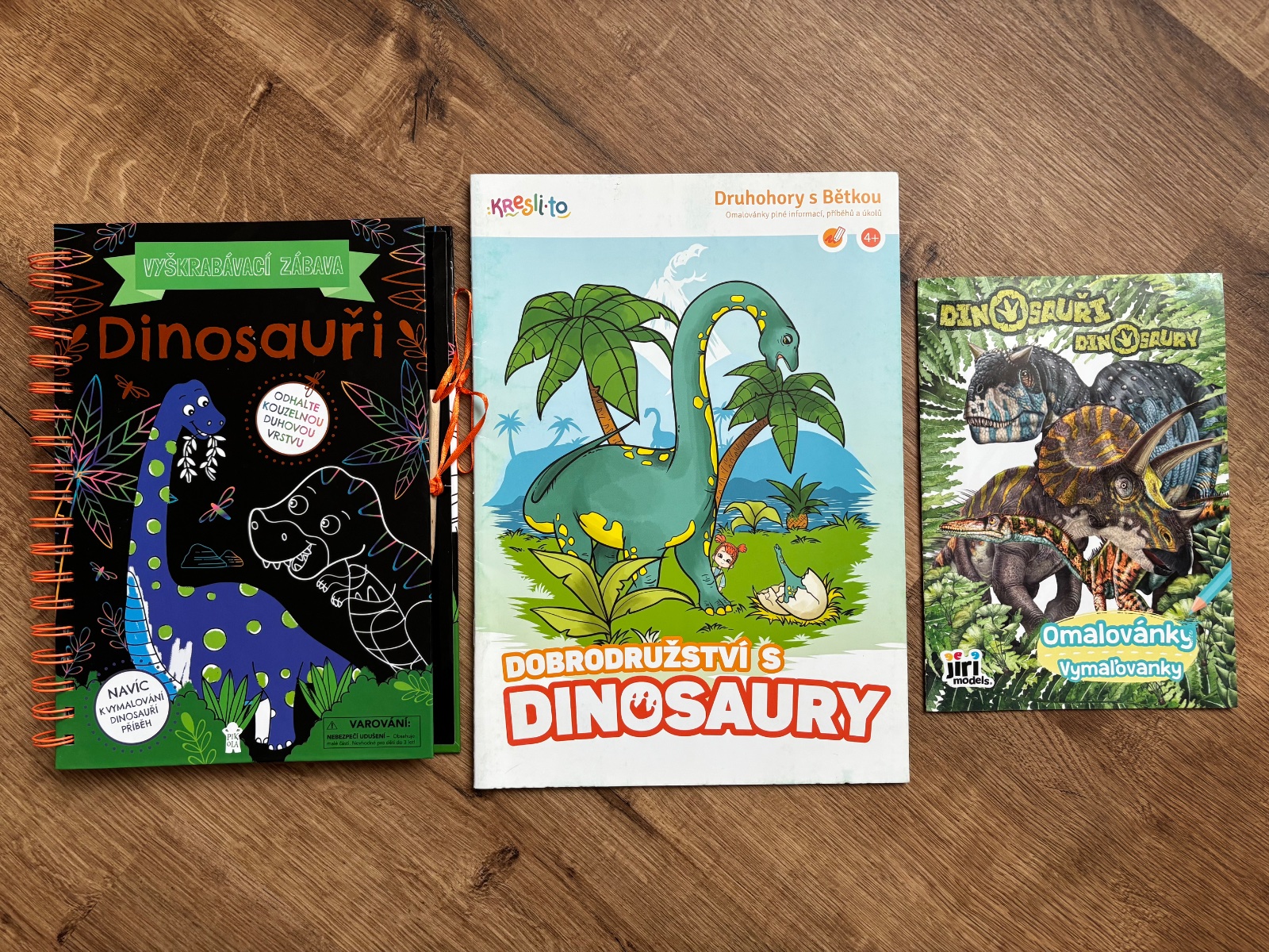 Dále nový časopis s dinosaury, kde jsou úkoly a omalovánky - zde také není nic vyplněno ani vybarveno.