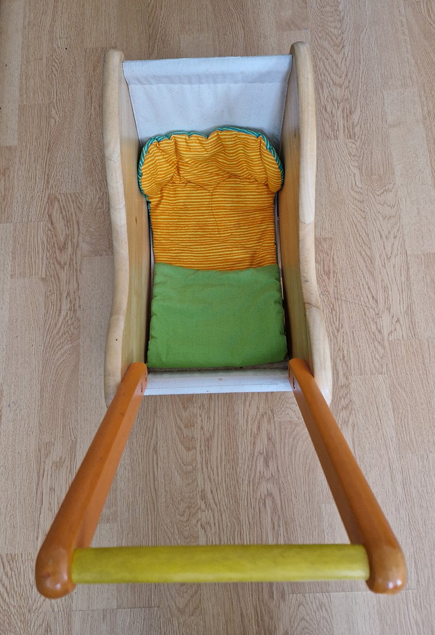 Prodám dřevěný kočárek na panenku - miminko. Masivní dřevo, spodní část látková + peřinka. Šířka 43 cm, výška s madlem 46 cm. Cena 300 Kč. Osobní předání Praha.