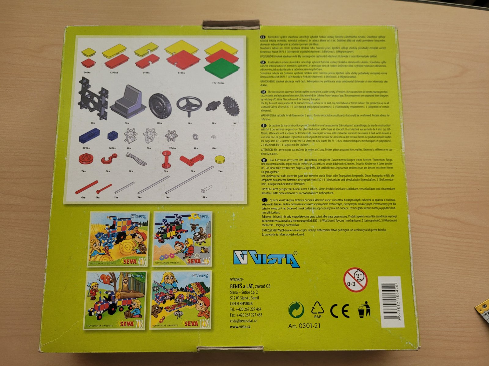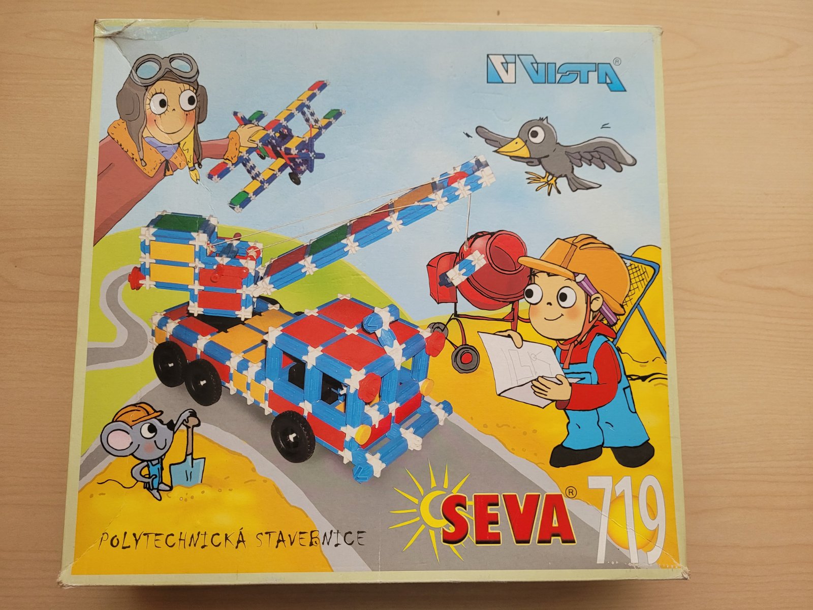 Polytechnická stavebnice SEVA 719 obsahuje 719 dílků, ze které sestavíte velký autojeřáb, nebo letadlo (dvojplošník). Tím ale nic nekončí, stavebnice SEVA jsou kompatibilní, fantazii se tedy meze nekladou. Ryze česká tavebnice SEVA rozvíjí kreativitu, technické myšlení i manuální zručnost. Je určena dětem od 4 let. Vyhovuje evropské normě EN71 o bezpečnosti hraček, její kvalita je pravidelně kontrolována, neobsahuje nebezpečné ftaláty.