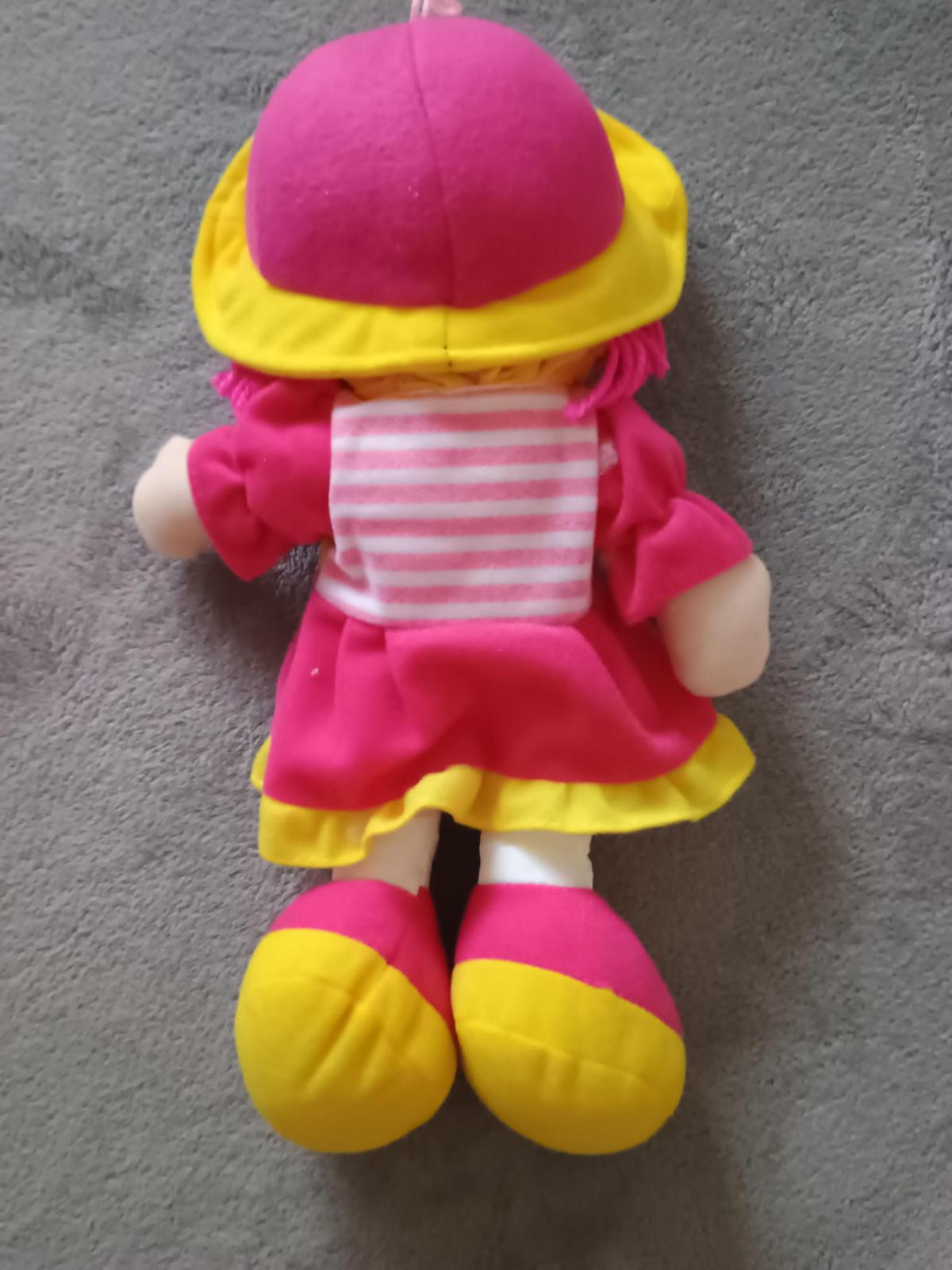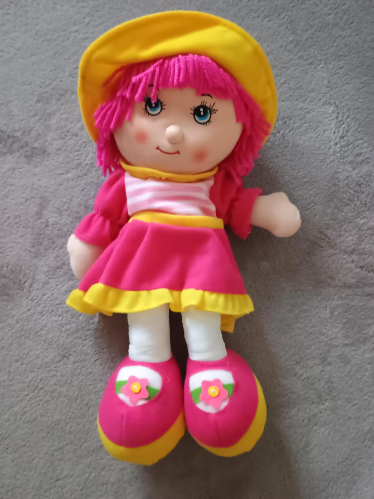Měkká látková panenka, hezký a příjemný vzhled. Dcera měla podobnou, velmi se osvědčila, celý den i noc byla s ní, hezky se drží, lze prát, při spaní nedojde k úhoně ani panenka ani dítě. Tato je úplně nová. Velikost panenky je 35 cm.