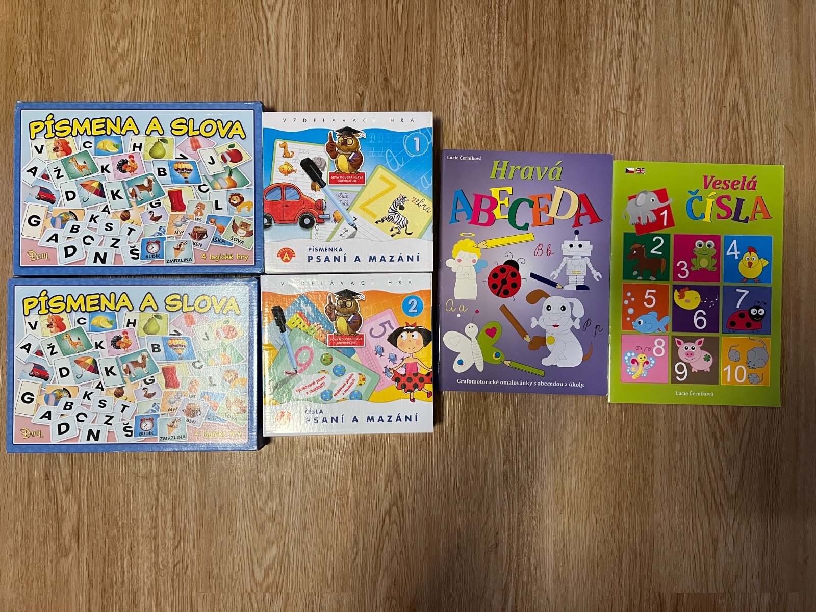 Sešity Hravá abeceda – z větší části již vyplněno, ale najdou se i prázdné stránky. Veselá čísla – zcela nový, nepoužitý