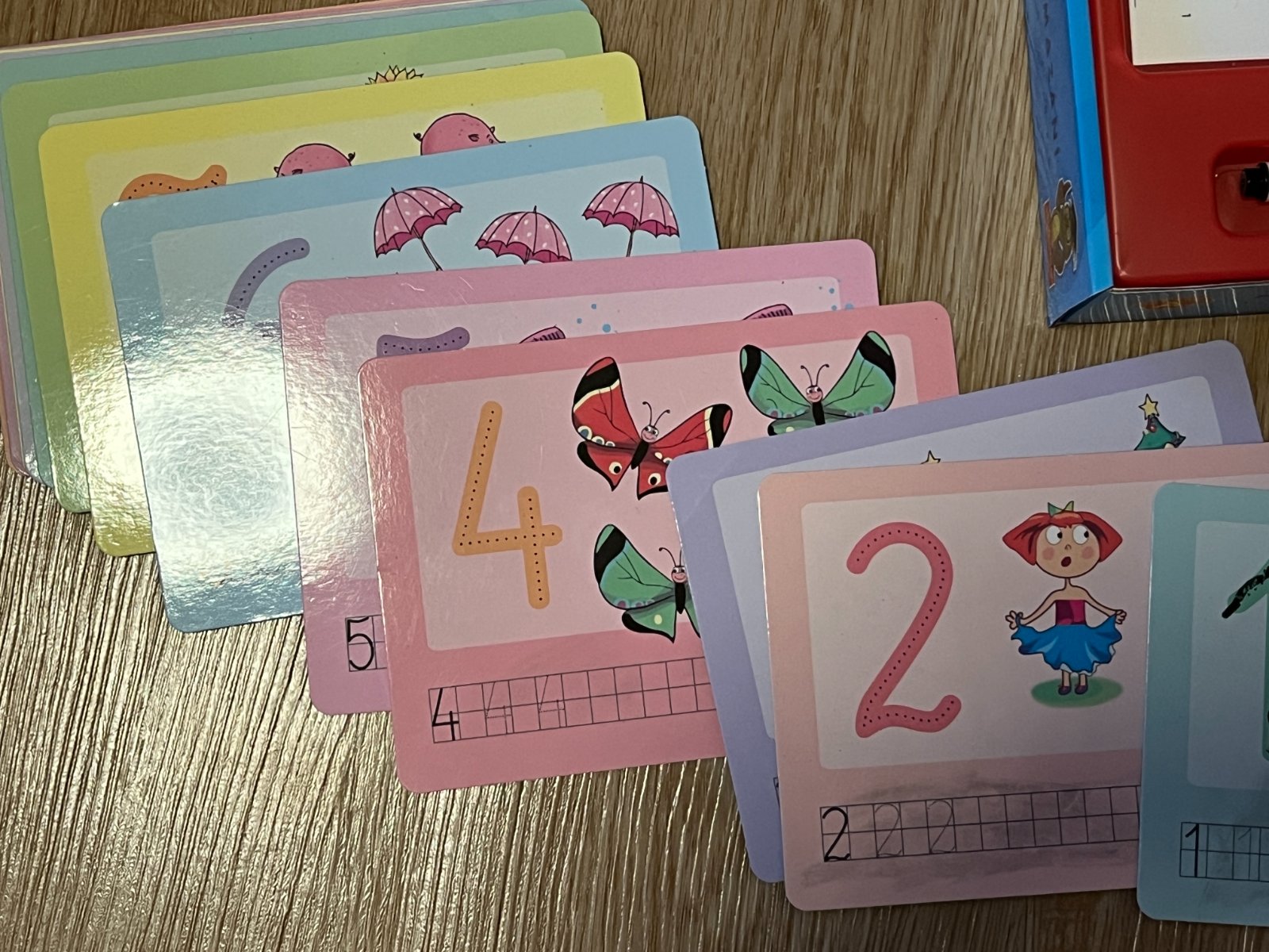 Vzdělávací hry – psaní a mazání – obsahují každá 14 oboustranných karet s předepsanými písmenky/čísly. Kartičky jsou používané, lze ale opakovaně použít. Nutno dokoupit fix s koncovkou na mazání. Dobrý stav, žádná kartička nechybí.