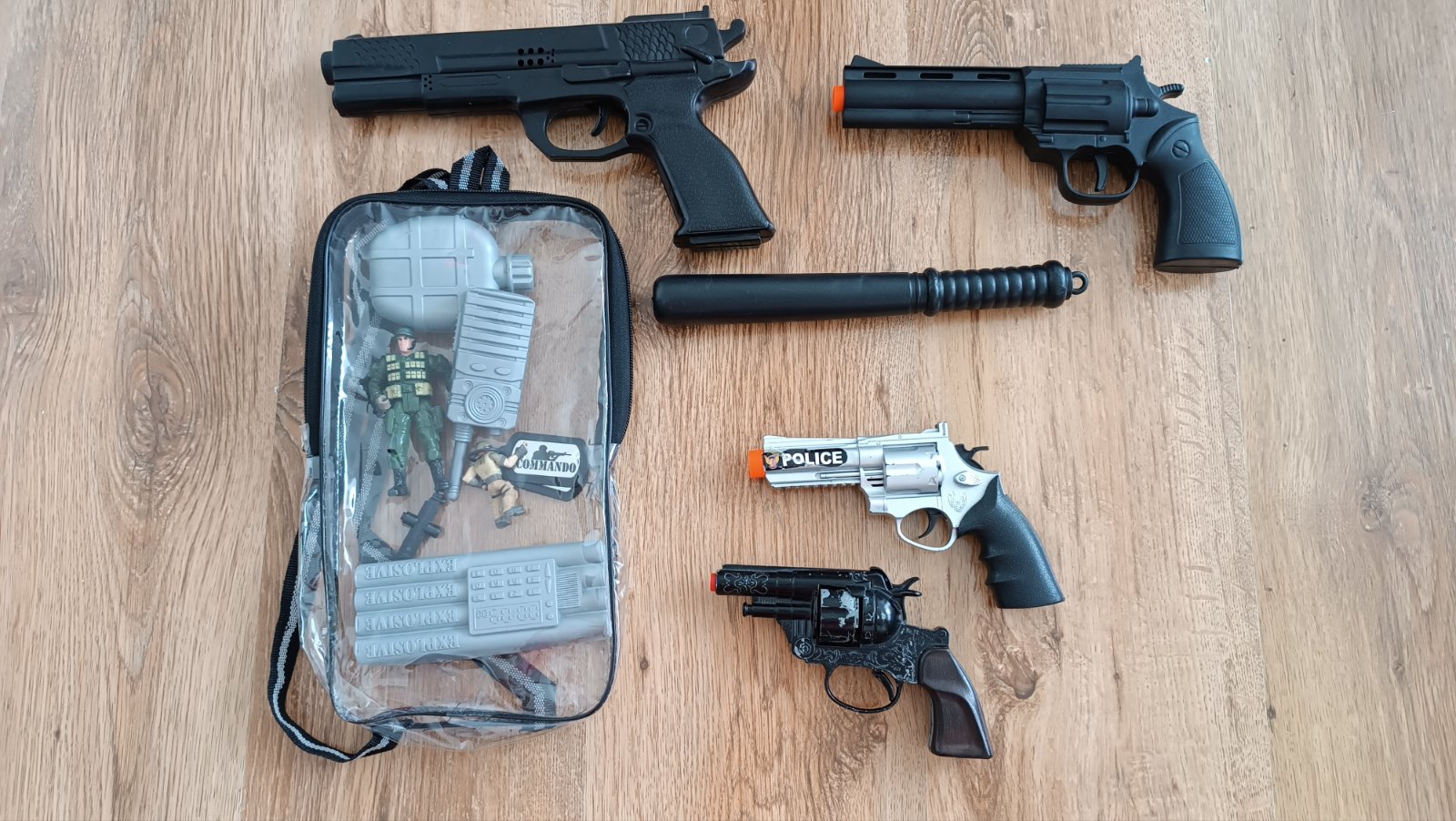 První plastová pistole nahoře na první fotce vydává zvuky. Je to mechanika. Druhá plastová se dá zmáčknout kohoutek, ten jen pruží. Policejní je plastová a mačká se kohoutek a úderník se hýbe. Nemusí se natahovat. Dole na fotce kovová pistole na kapsle. Ale kohoutek je rozbitý. Kohoutek a úderník fungují jen když je namířená hlaveň k zemi.