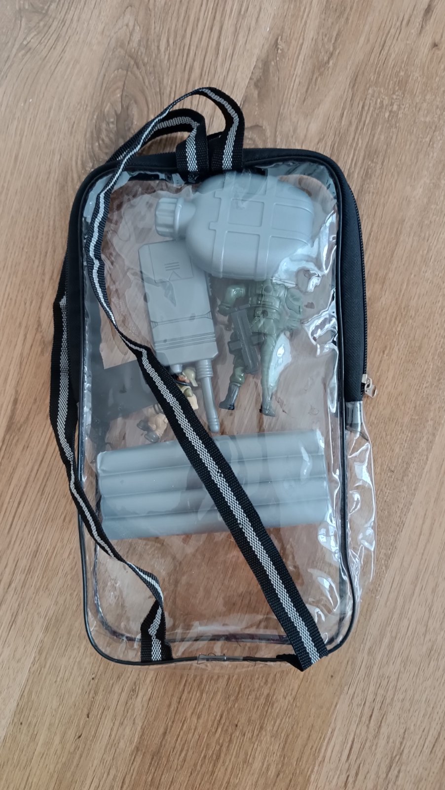 Malý batůžek je na zip. Obsah: Dva vojáčci. Malý hýbe rukama, větší všemi končetinami a hlavou. Dále tu jsou dvě známky, vysílačka, výbušnina a láhev. Vše plastové.