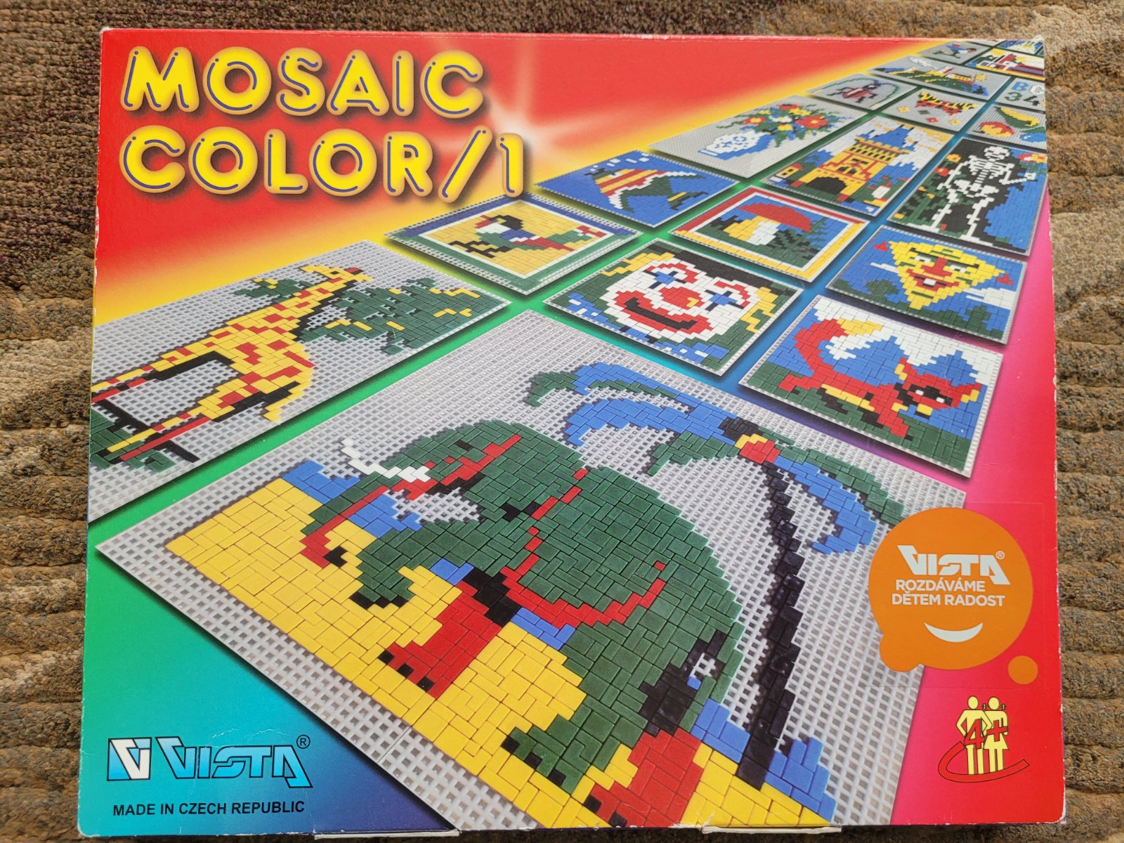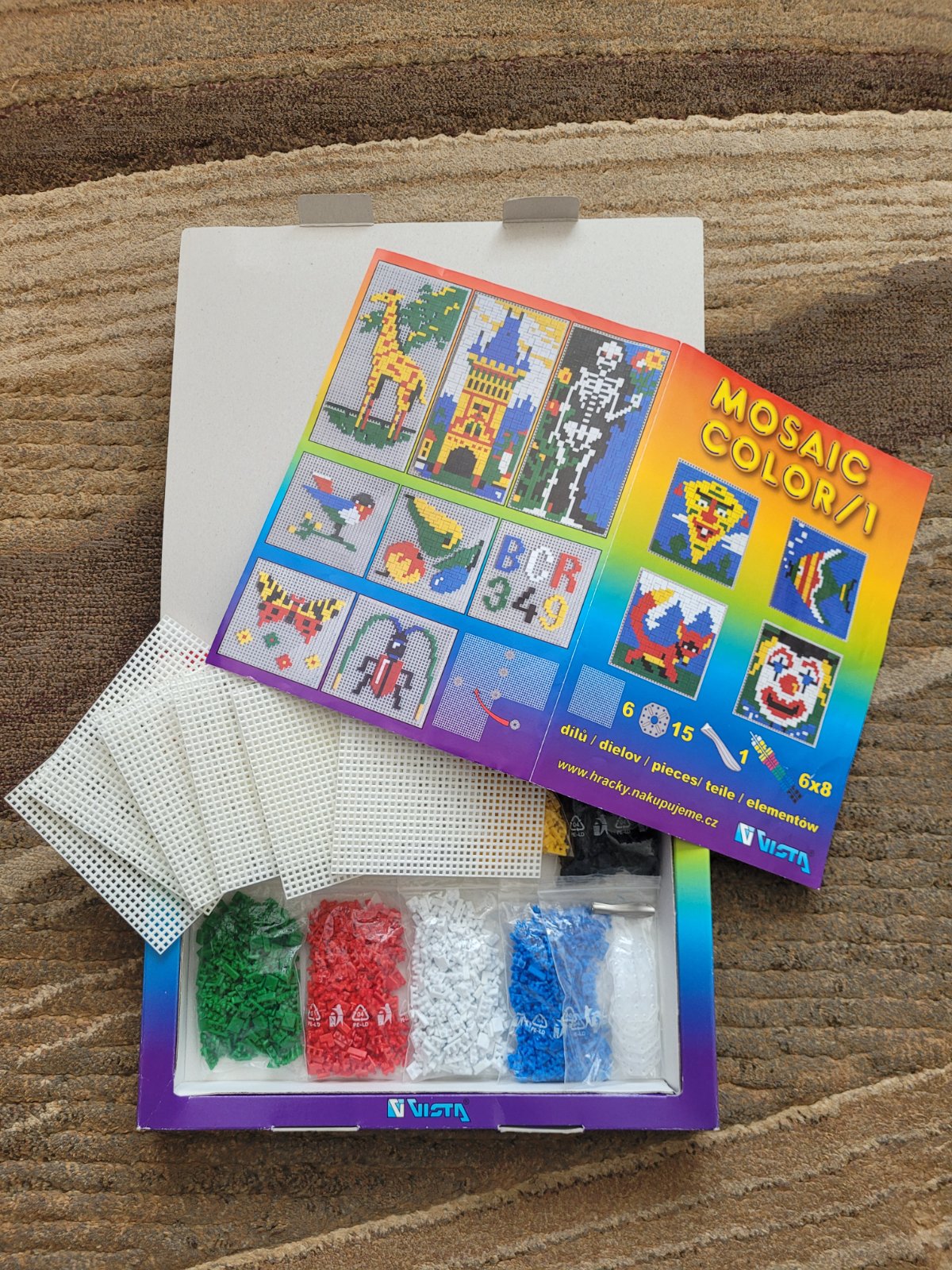 Stavebnice mozaikového typu "Mosaic Color Vista/1" od značky Vista pro děti od 4 let. Základem je plastová mřížka, do které se vmačkávají dílky podle fantazie nebo předlohy. Plastové mřížky jdou spojovat, a tak vytvořit i větší plátno. Dílky jsou v 6 základních barvách (žlutá, červená, modrá, zelená, bílá a černá). Součástí je velké množství dílků od každé barvy, 6 mřížek, spojovací dílky, pacička na vyndání dílků z mřížky a inspirativní předlohy. Je to kreativní hračka, děti si procvičí jemnou motoriku, rozvíjí svou tvořivost a představivost. Jedná se o ryze českou stavebnici vyrobenou v ČR, neobsahuje nebezpečné ftaláty.
