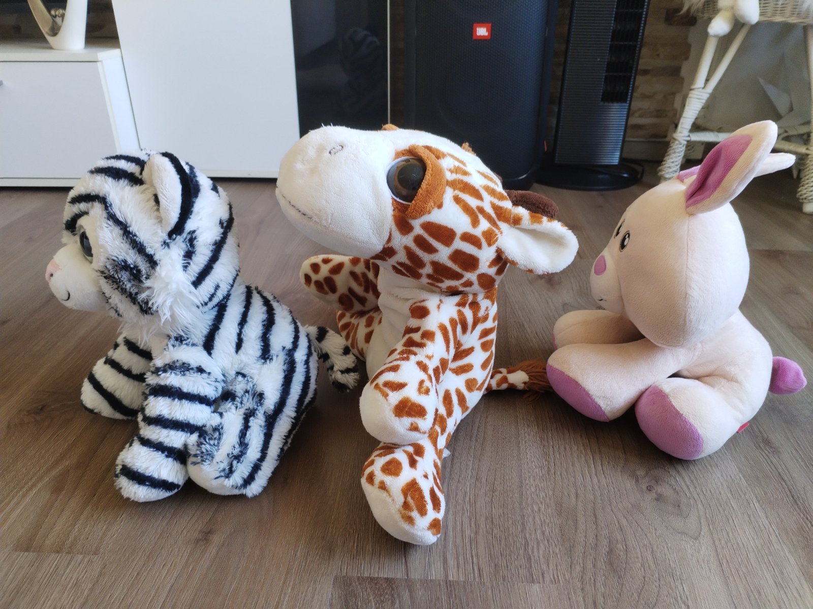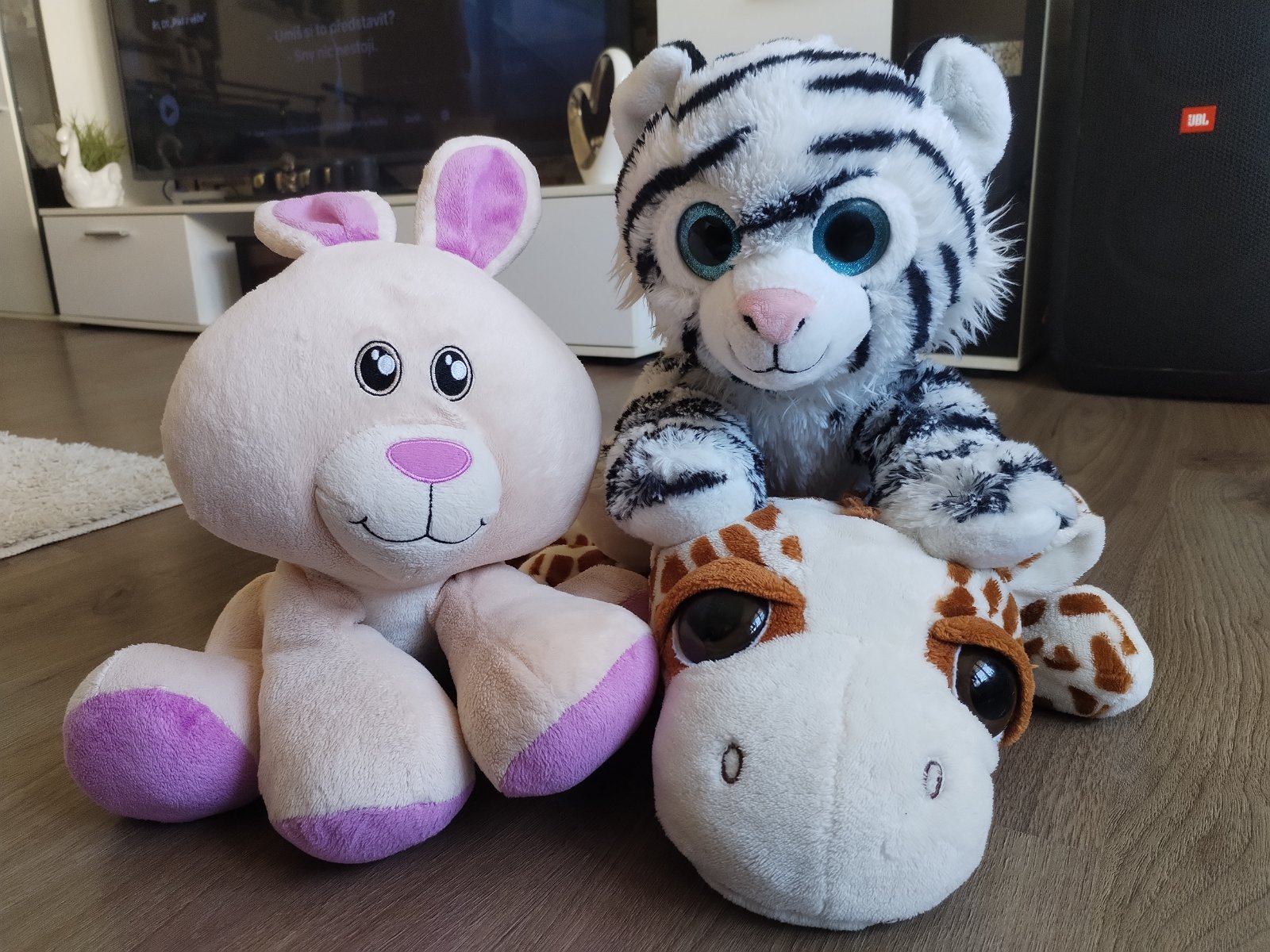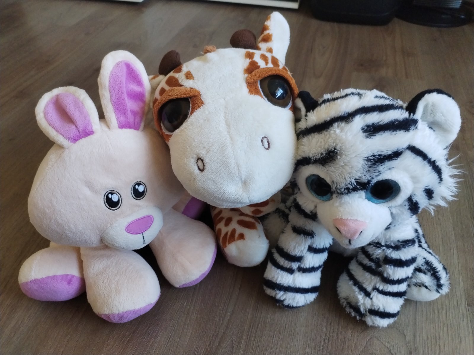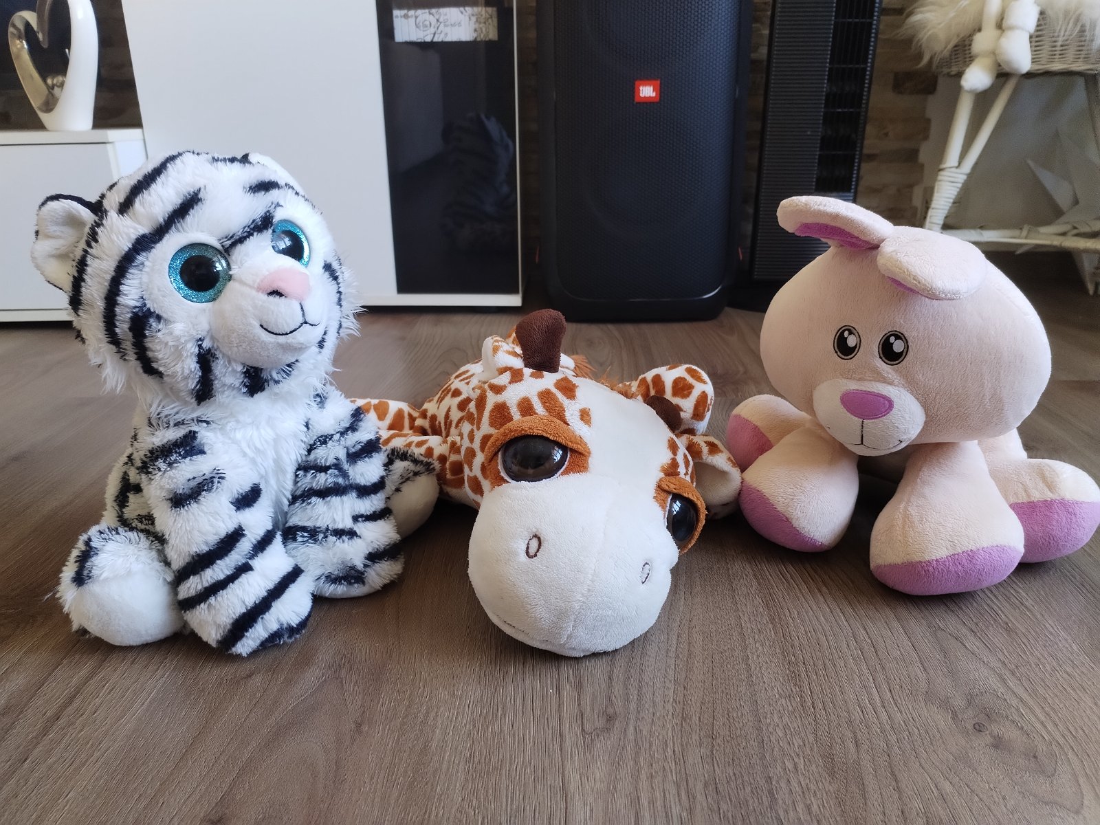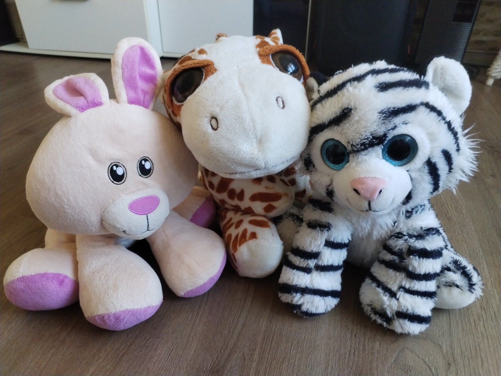 Krásní velcí plyšoví kamarádi Tygřík + Žirafka + Zajíček, hraní, neponičení, z čisté nekuřácké domácnosti, vypraní, voňaví, minimálně hraní, velikánskou radost udělají dál, prodej pouze společně, cena komplet 200 Kč