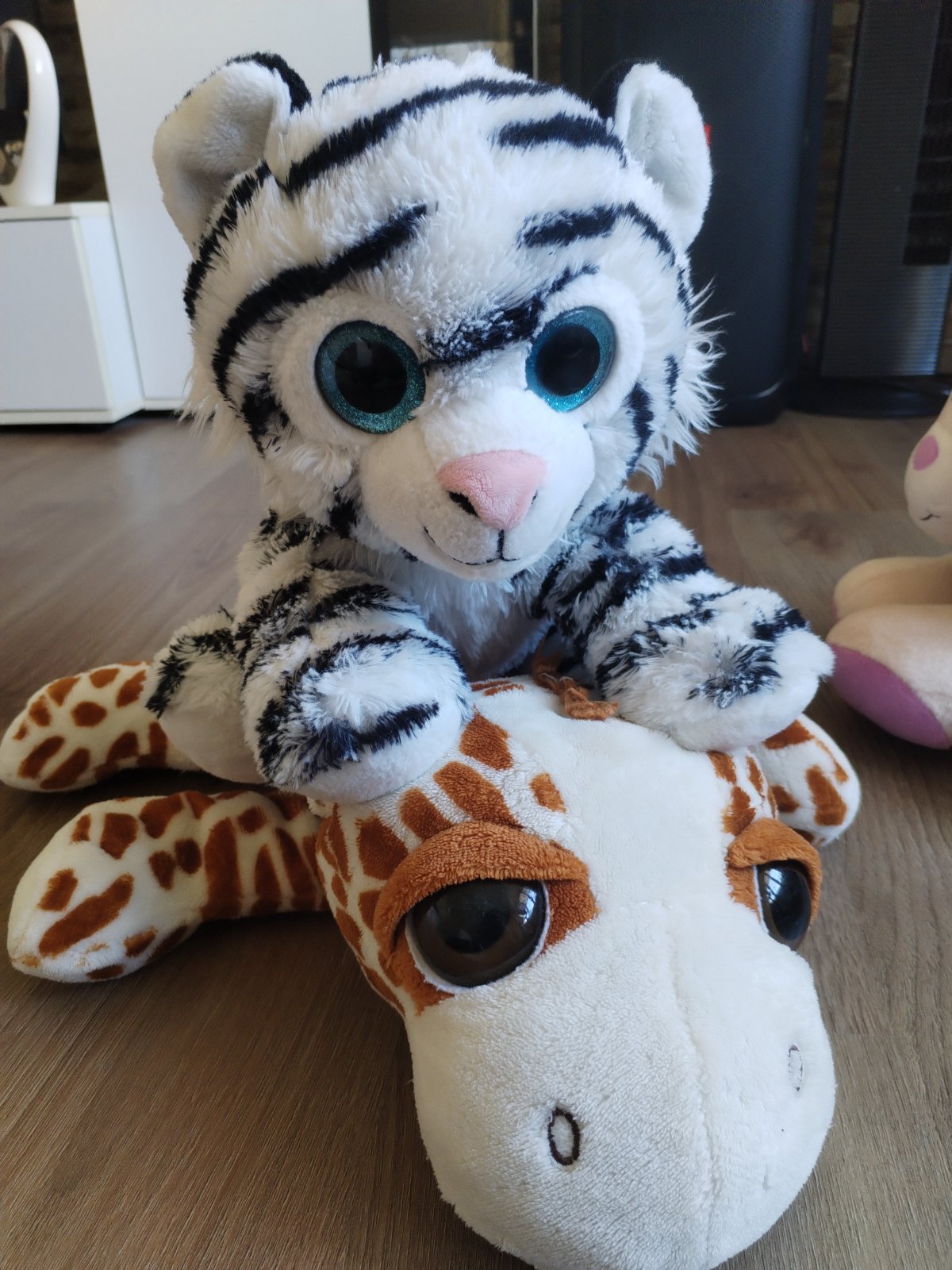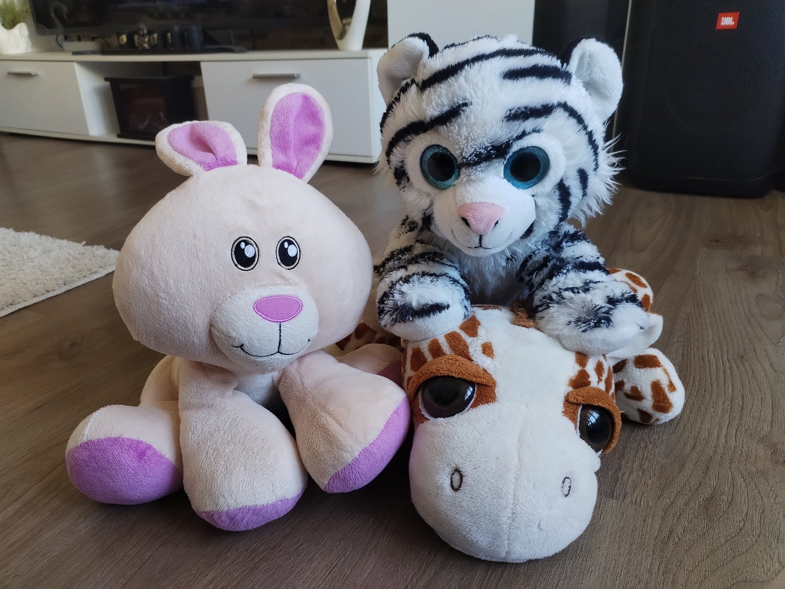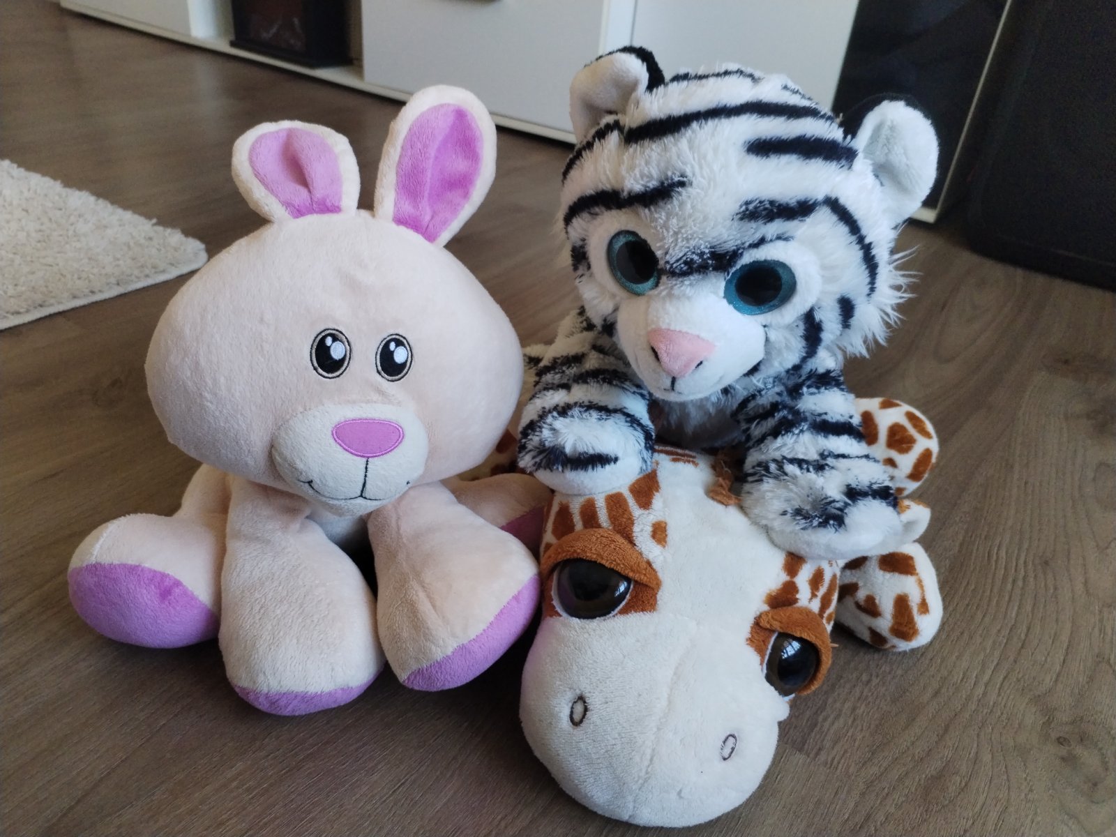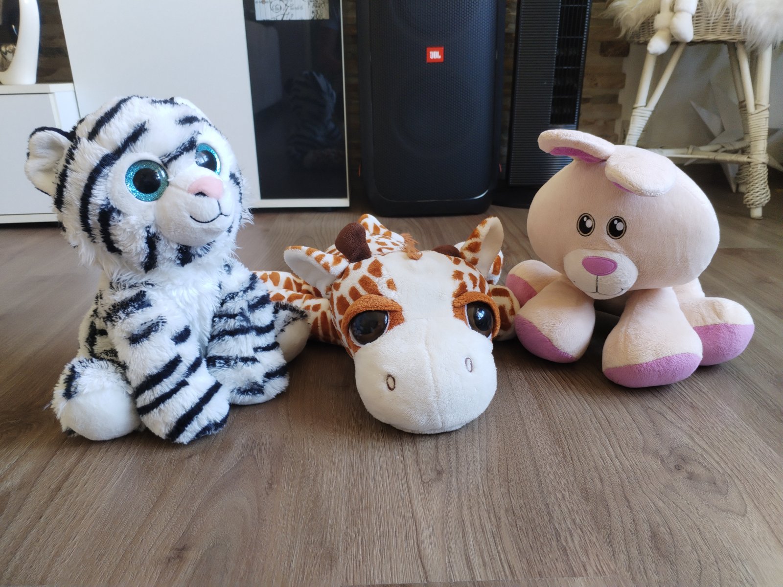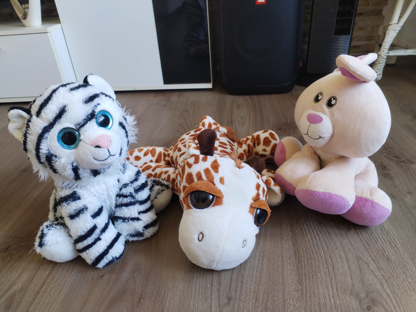 Krásní velcí plyšoví kamarádi Tygřík + Žirafka + Zajíček, hraní, neponičení, z čisté nekuřácké domácnosti, vypraní, voňaví, minimálně hraní, velikánskou radost udělají dál, prodej pouze společně, cena komplet 200 Kč