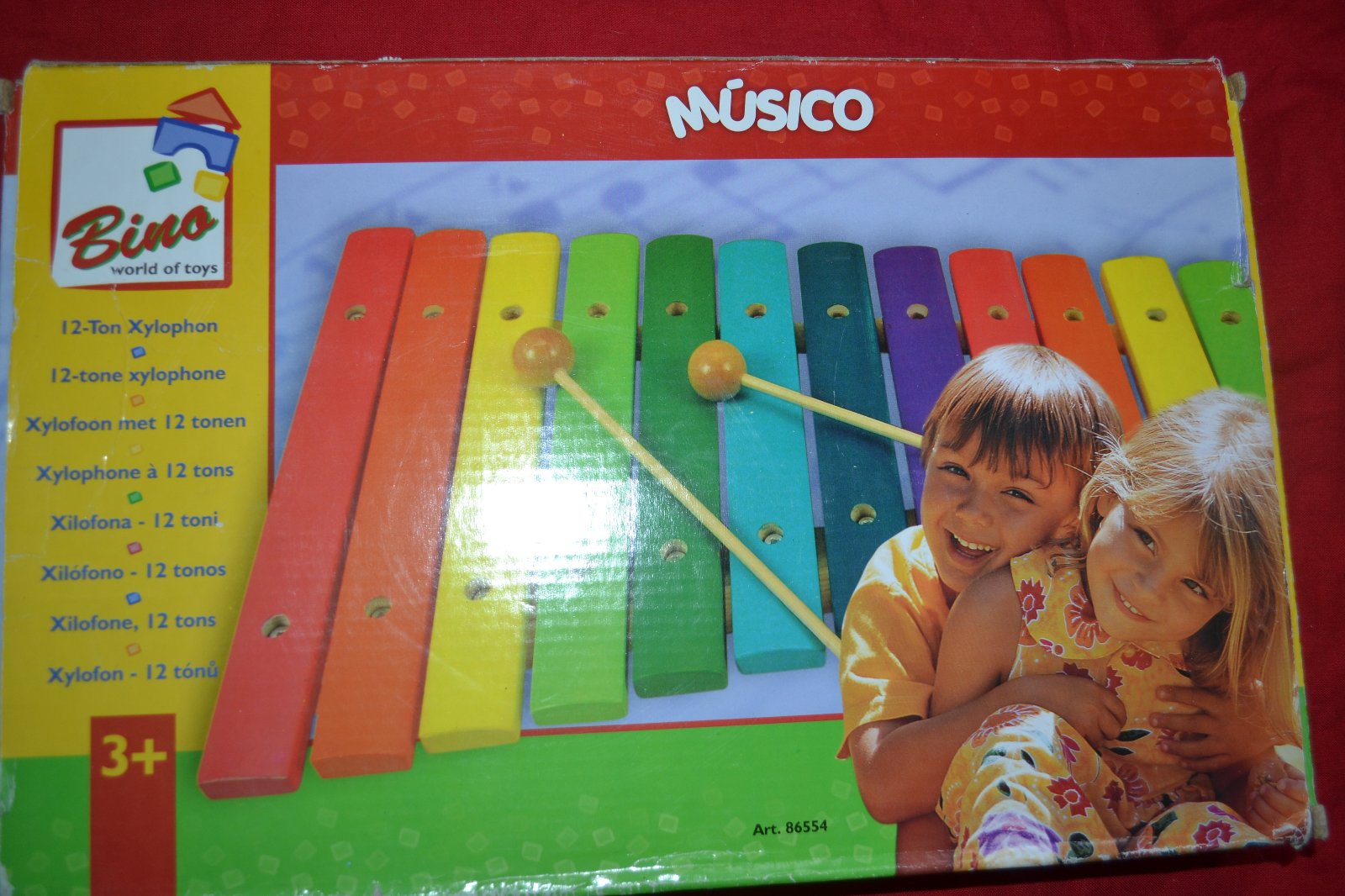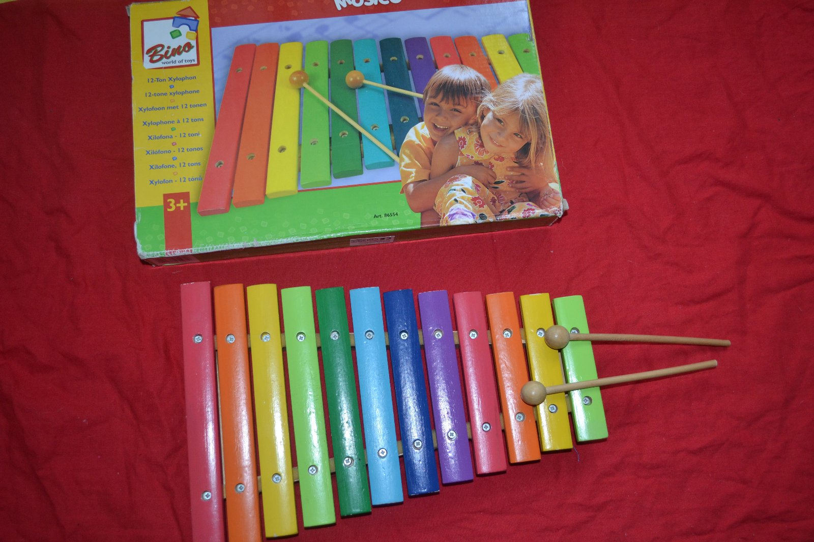 výborný dětský dřevěný xylofon s paličkami zn.Bino ,německý výrobce, 12 tónů , dřevěný pestrobarevný hudební nástroj se dvěma paličkami a velmi příjemným zvukem. Děti si na něj můžou zahrát své první písničky a rozvíjet svou hudební fantazii