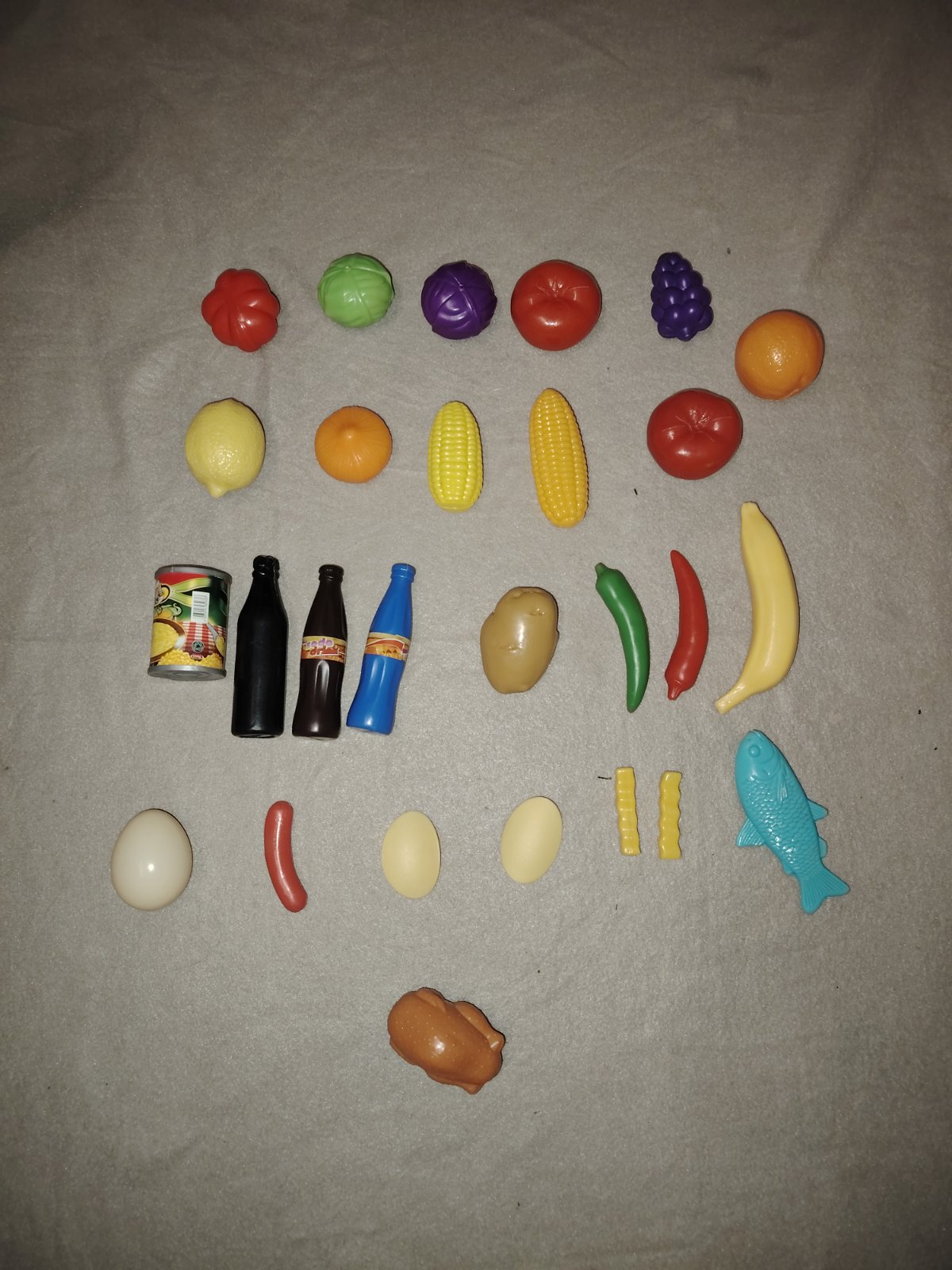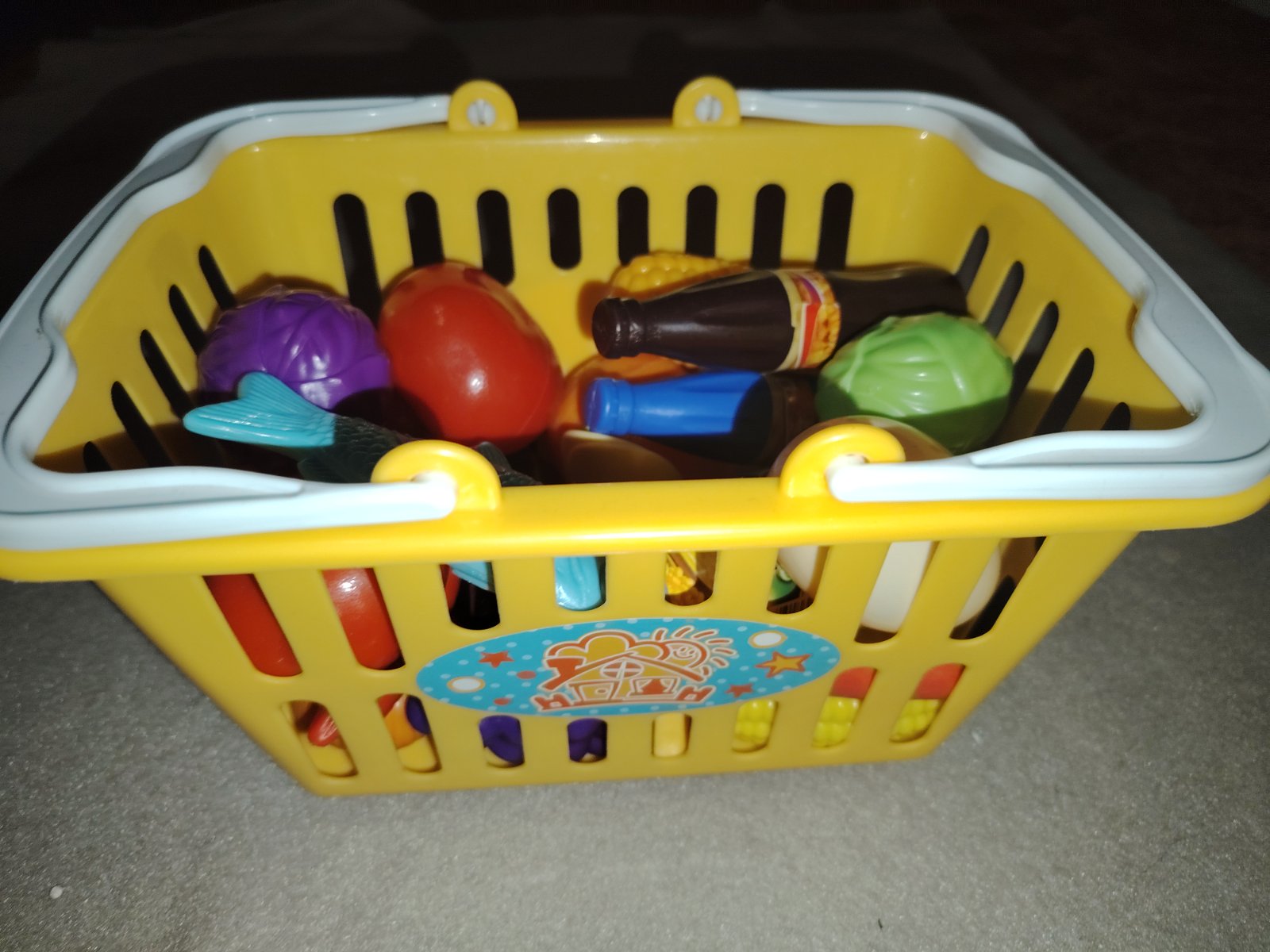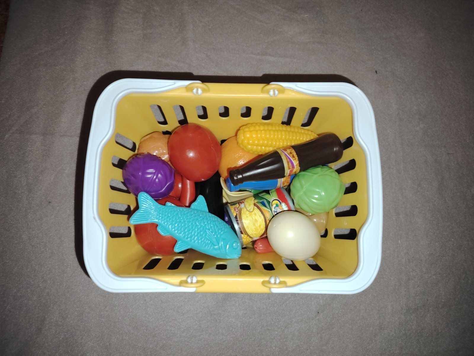 Dětský nákupní košík se sadou plastových potravin na hraní. Tyto hračky jsou oblíbeným doplňkem k dětským kuchyňkám nebo pro hru na obchod. Žlutý plastový košík s bílými rukojeťmi obsahuje různé makety potravin, jako je zelenina (např. salát, fialové zelí), ovoce (rajče) a lahvičky s nápoji (imitace koly nebo džusu). Osobní odběr Praha 9 – metro Střížkov nebo přes zásilkovnu (+ poštovné dle ceníku).