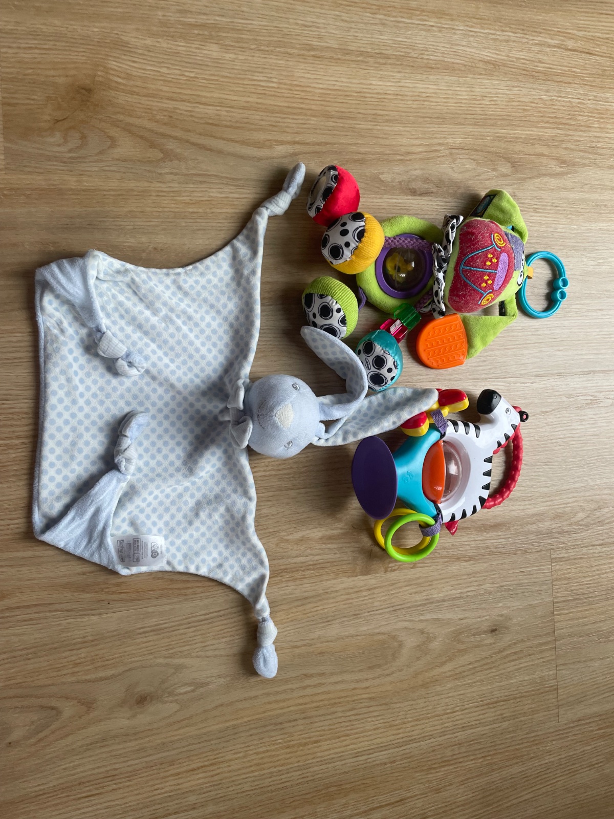 Prodám tři hračky vhodné pro miminko - jemňoučký měkký králíček ňuchňák na spinkání, Fisher Price koník zebra/černobílá na první vidění s přísavkou na přidělání/ a má v sobě spoustu prvků na motoriku /točící břicho, chrastítko motýl, na úchop držadlo a kroužky/. Závěsný pejsek se šustícími oušky a kousátky, na tlapce zrcátko, korále na další noze a točící břicho. Vše 120kc osobní odběr v Ústí nad Labem nebo odešlu.