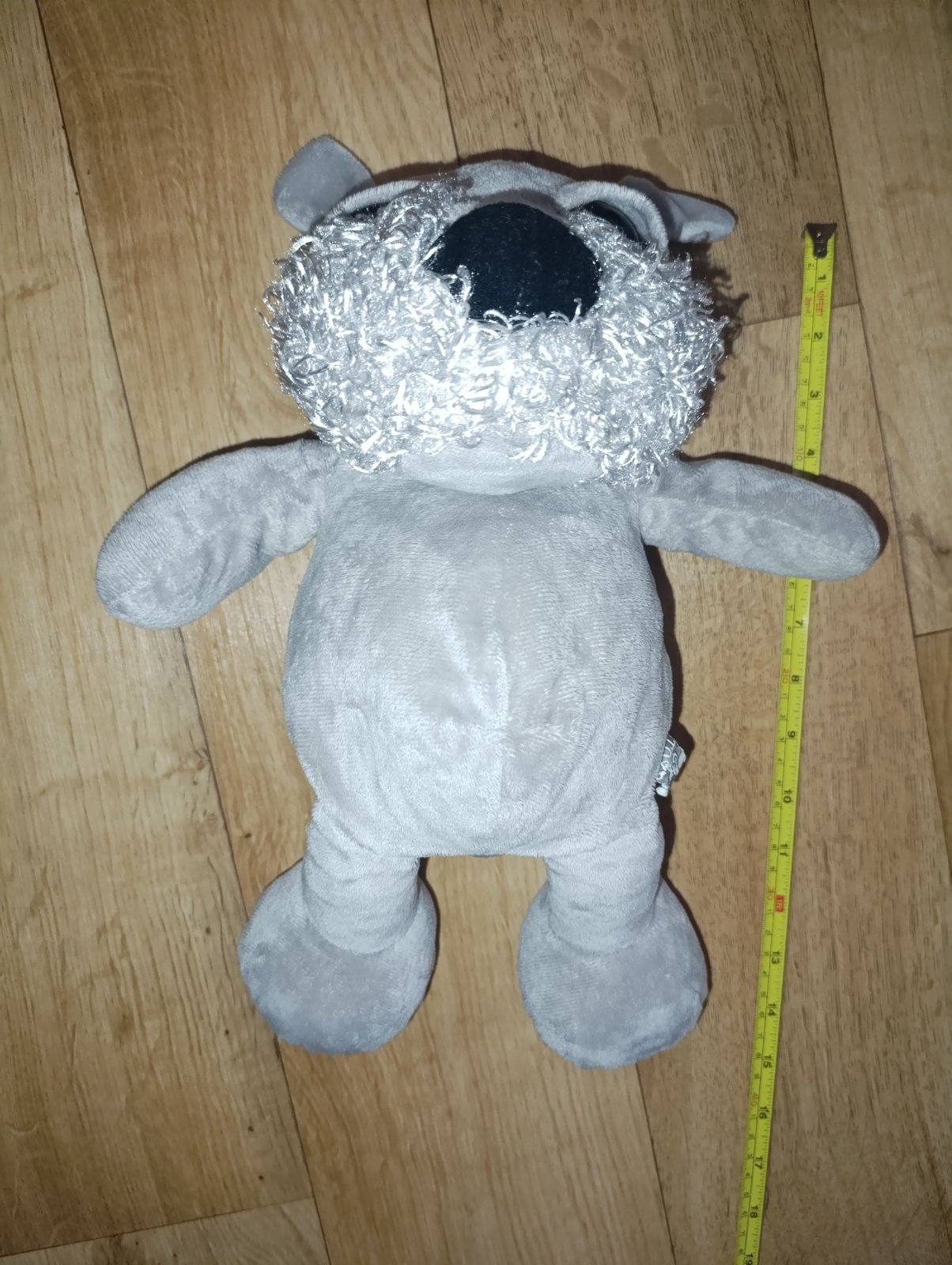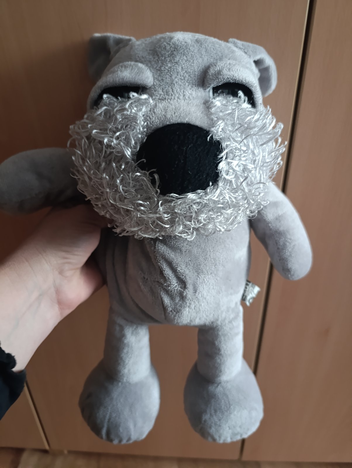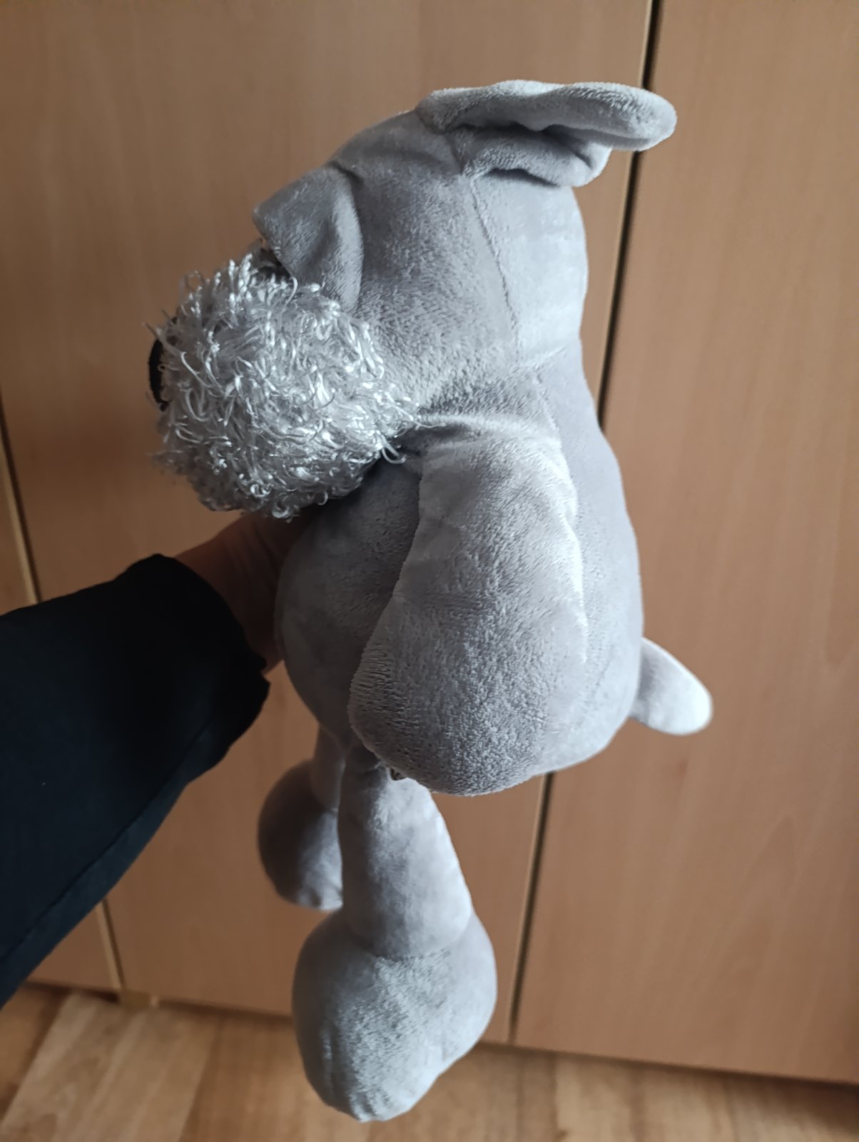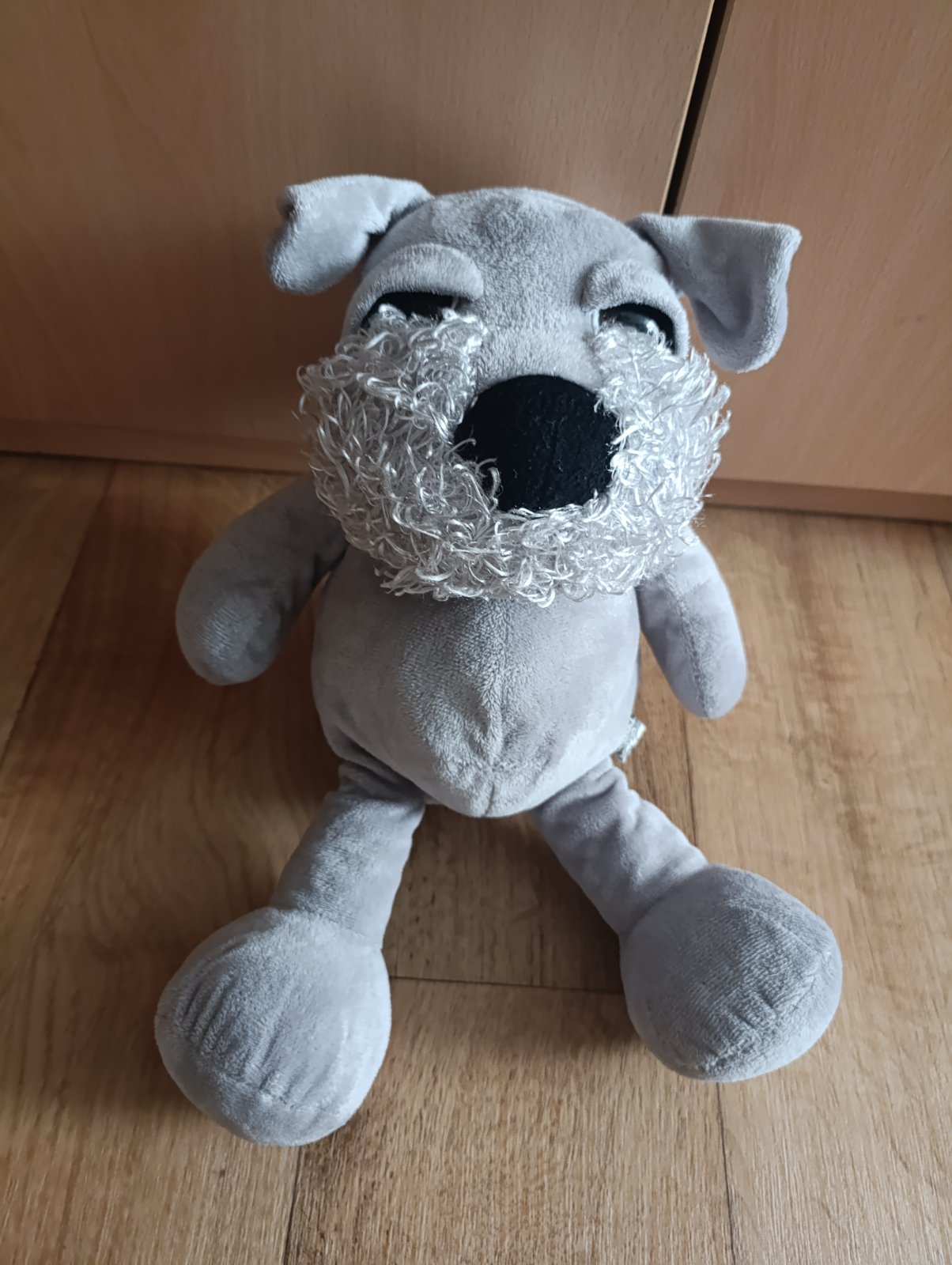 Plyšák šedý pes jako nový.. Ca 35cm při položení v nataženém stavu..