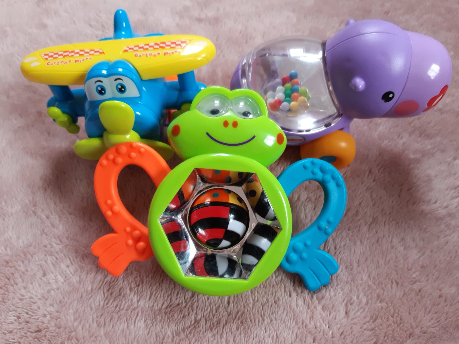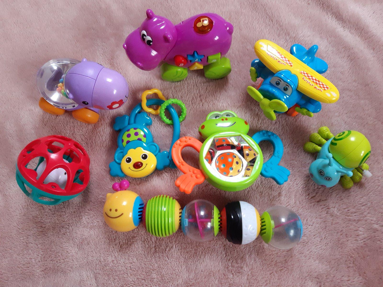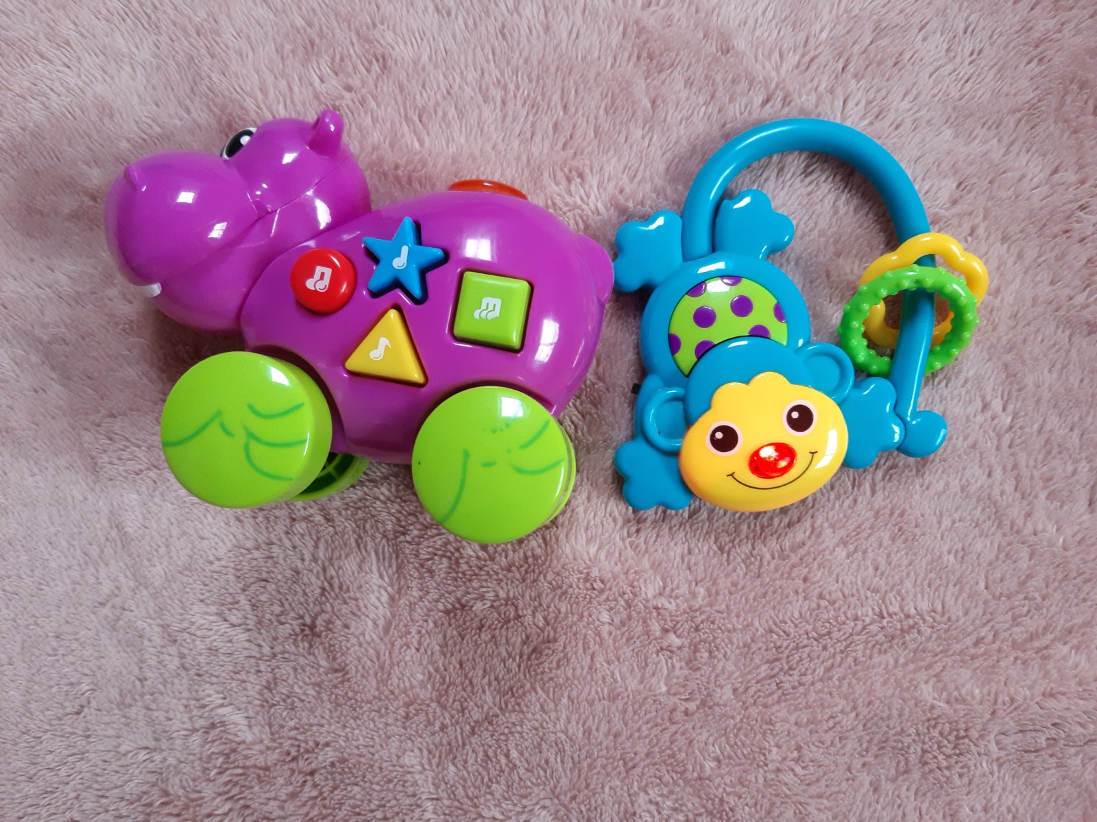 Mix plastových hraček.Hroch a opička blikající a hrají melodie. Housenka rozkládací na kuličky. Hrošik s letadlem má kolečka. Běžně opotřebení.