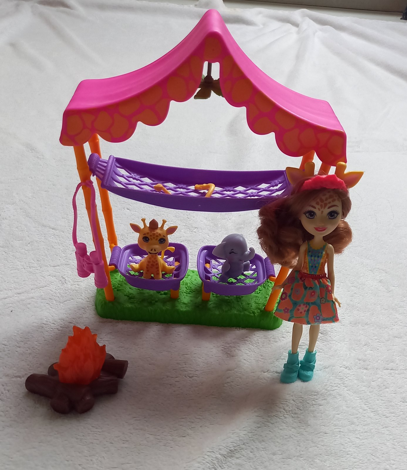 Enchantimals – panenka, se zvířátky, houpačkou a ohýnkem, krásný stav