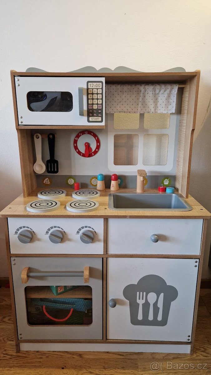 Kvalitní dřevěná konstrukce zajišťuje stabilitu a bezpečnost při hraní. Kuchyňka Derrson Maddie je vybavena sporákem s plotýnkami, mikrovlnnou troubou, dřezem a poličkami pro přehledné uložení doplňků. Je ideální pro děti od tří let.