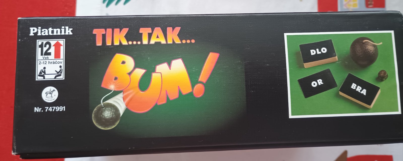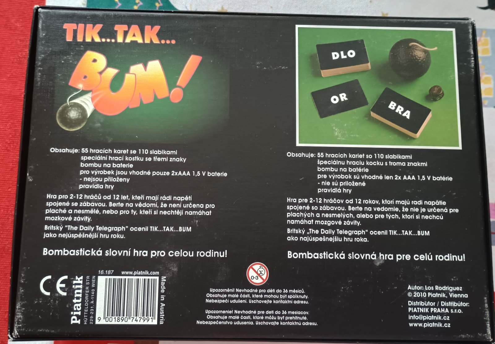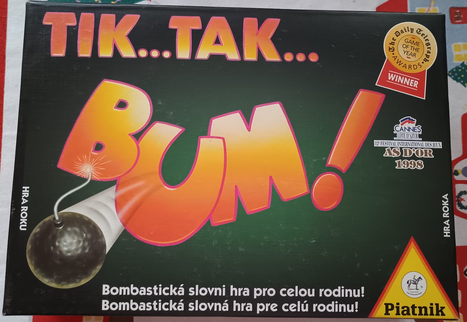 Napětí, smích a exploze kreativity! Tik Tak Bum je svižná a napínavá hra se slovy a elektronickou bombou, která odpočítává čas a vybuchuje v náhodném okamžiku. Úkolem hráčů je vymýšlet slova obsahující zadanou slabiku – než bomba „vybouchne“! Skvělá hra na párty, rodinné večery i jazyková cvičení, která vás dostane do varu.Pro koho je hra určena