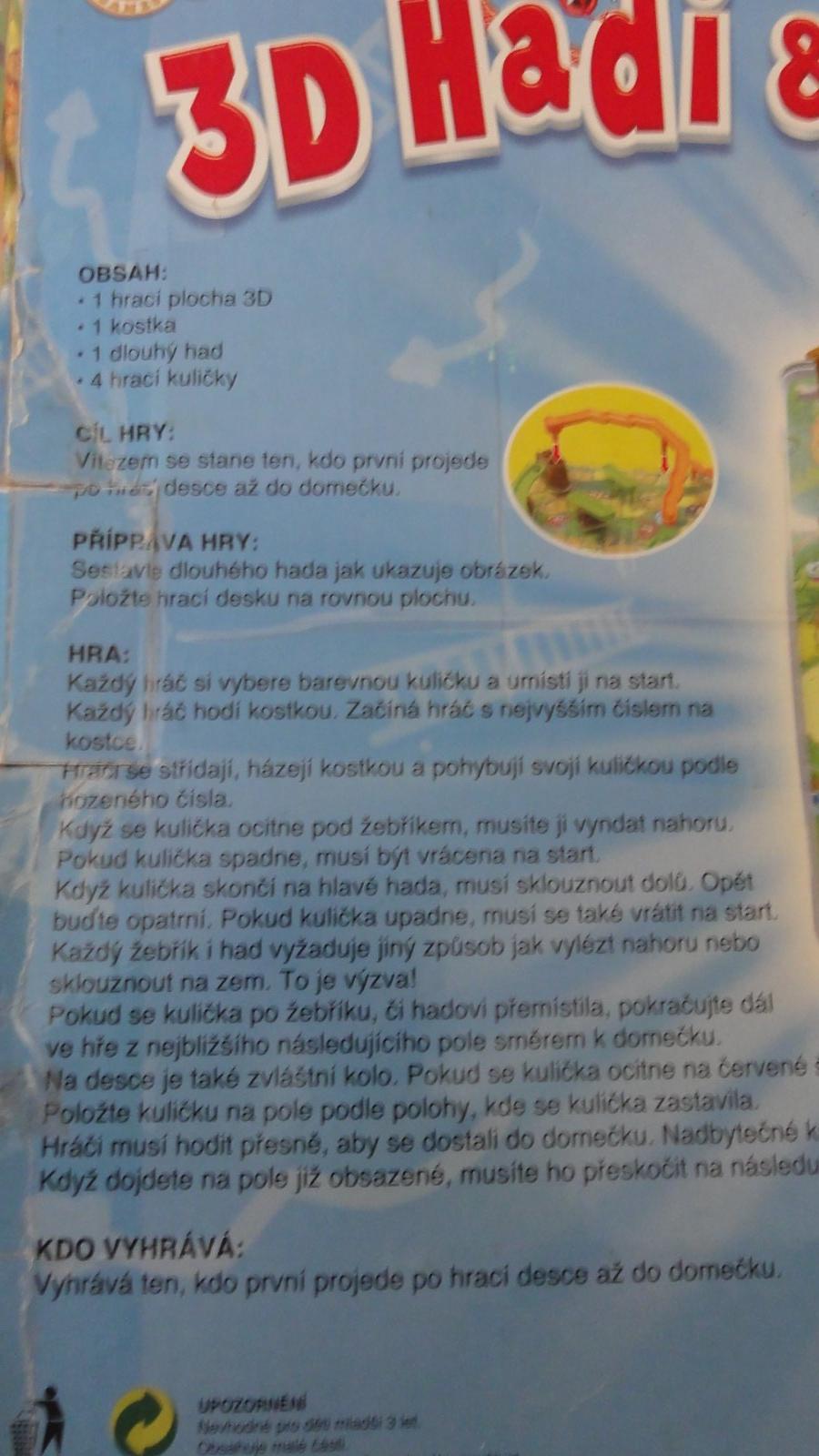 Sestavíte dlouhého hada, položíte hrací desku na rovnou plochu a hra může začít! Vyhrává ten, kdo první projde po hrací desce až do domečku. Obsah krabice: 1 hrací plocha 3D, 1 kostka, 1 dlouhý had, 4 hrací kuličky. Doporučeno pro děti od 4 let.