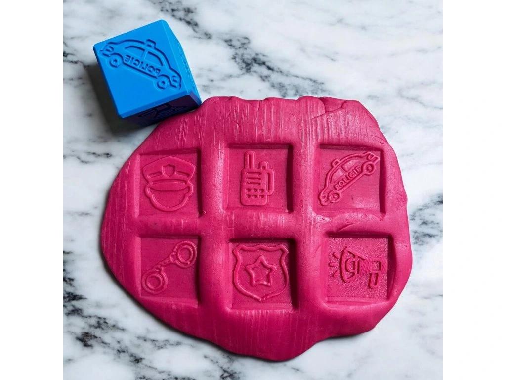 Otiskávací kostka je vhodná jako doplněk k plastelíně, kinetickému písku a k podobným hmotám.