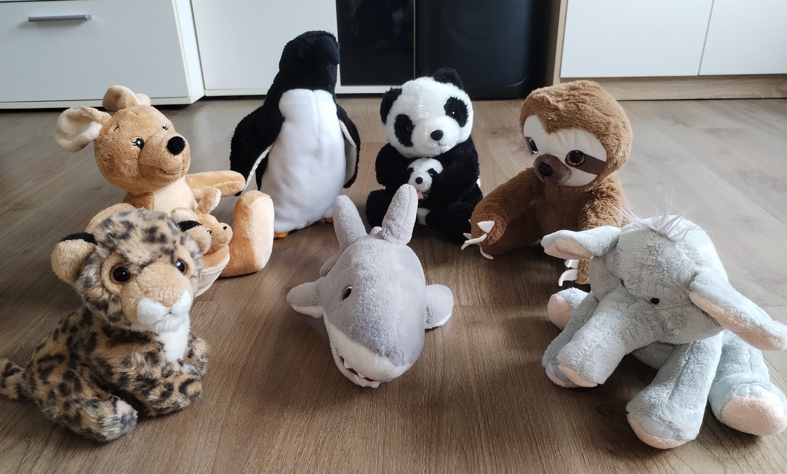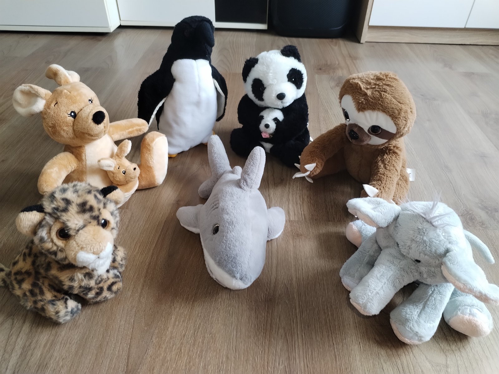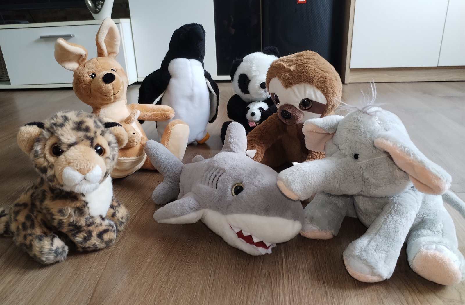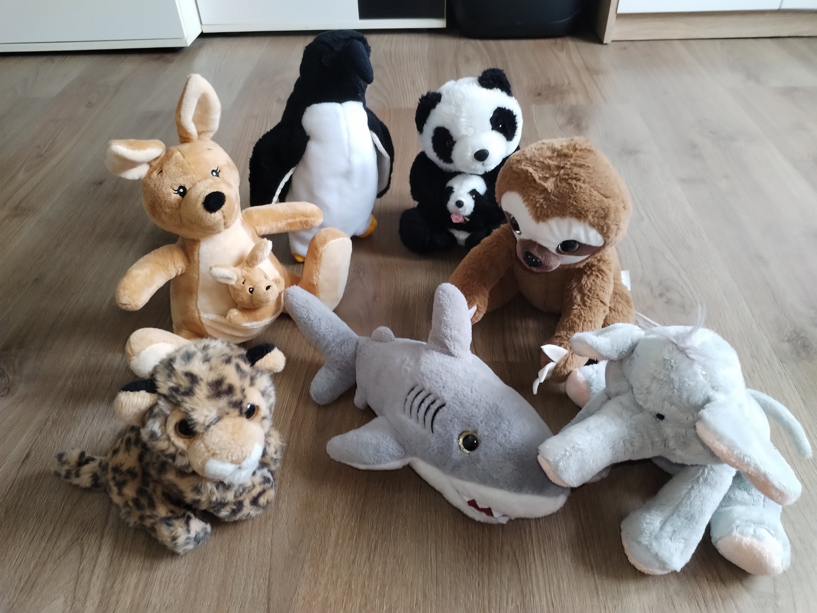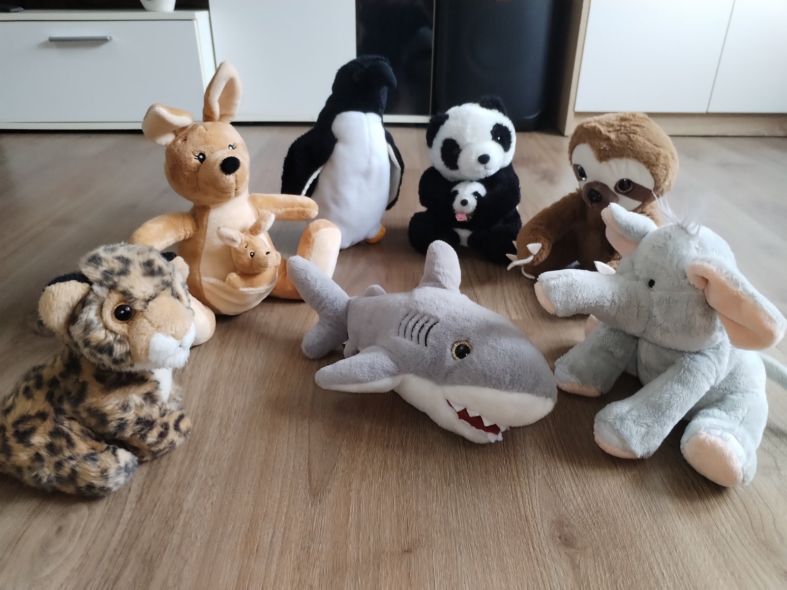 Nabízím plyšová exotická zvířátka: tučňák, lenochod, slon, klokan s mládětem, panda s mládětem, žralok, levhart v top stavu, z čisté nekuřácké domácnosti.