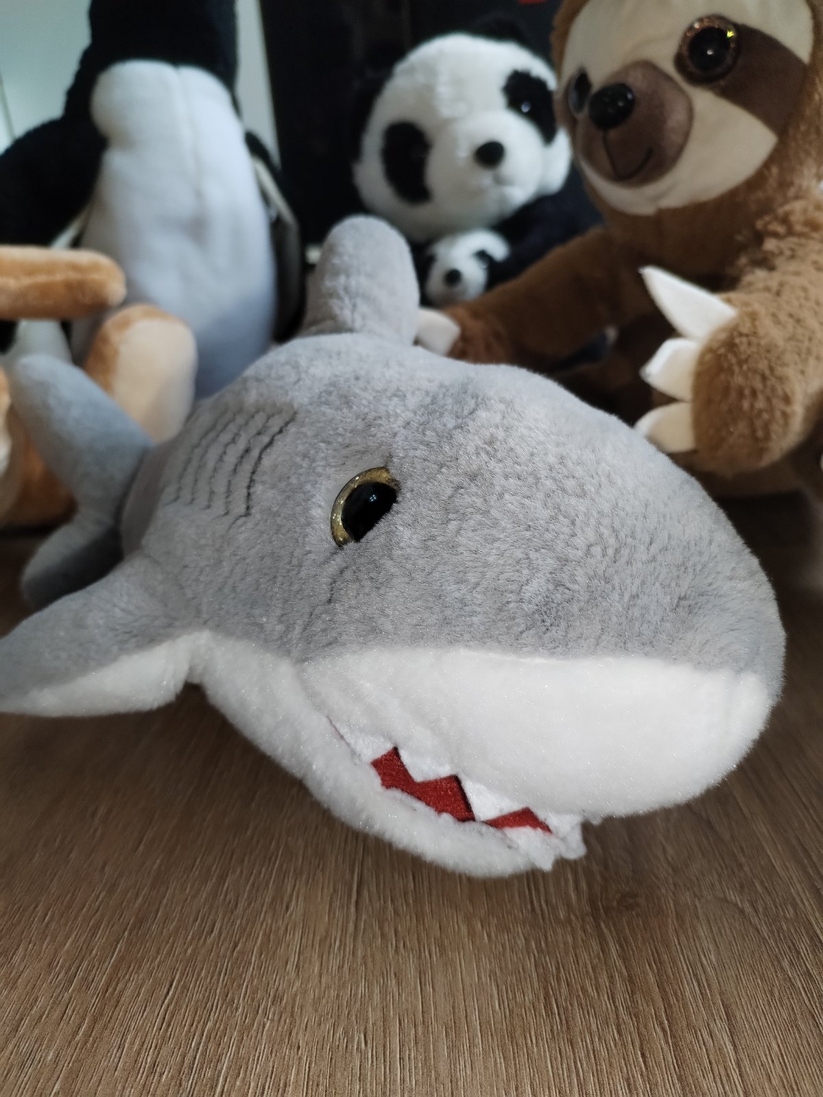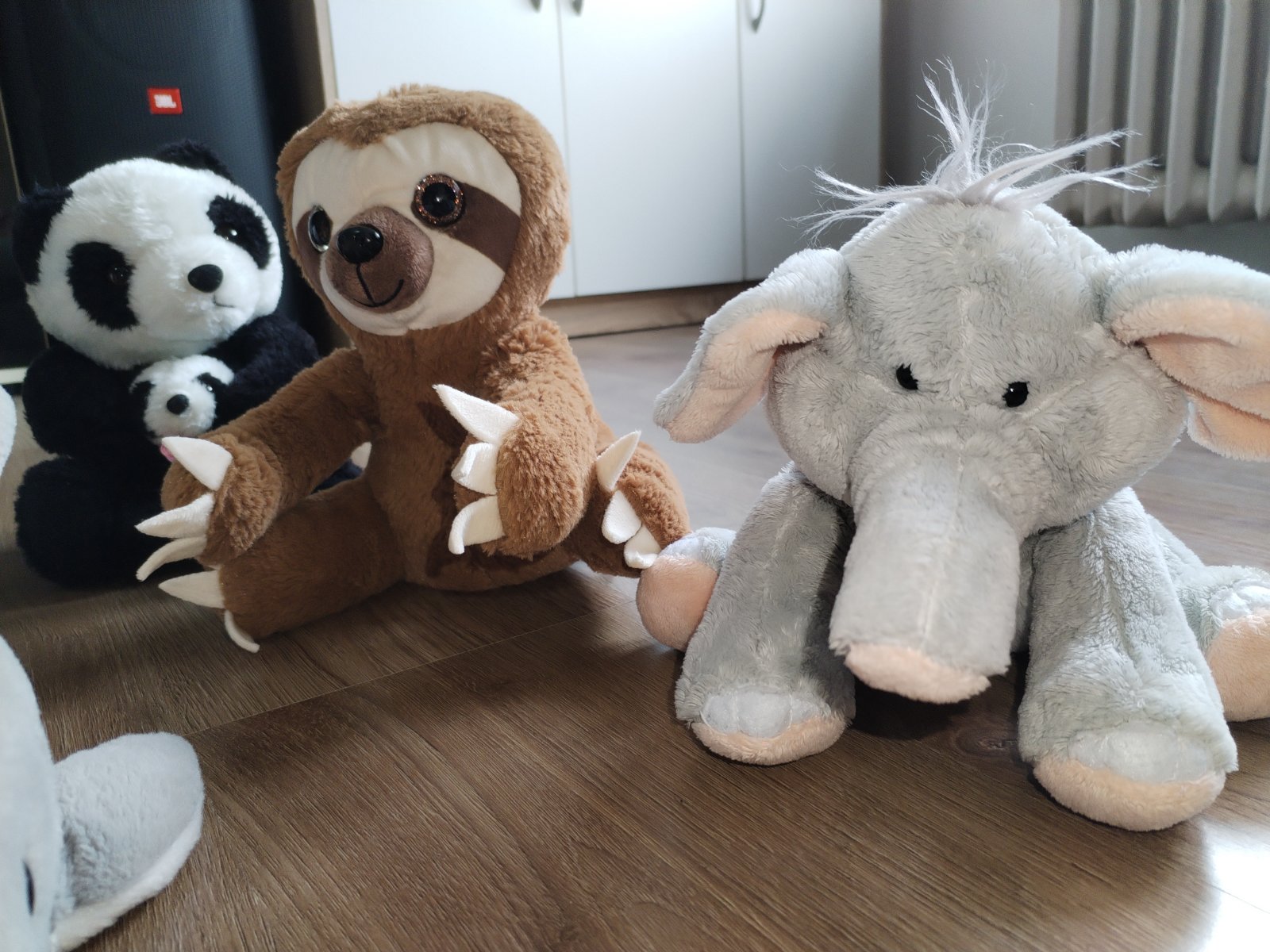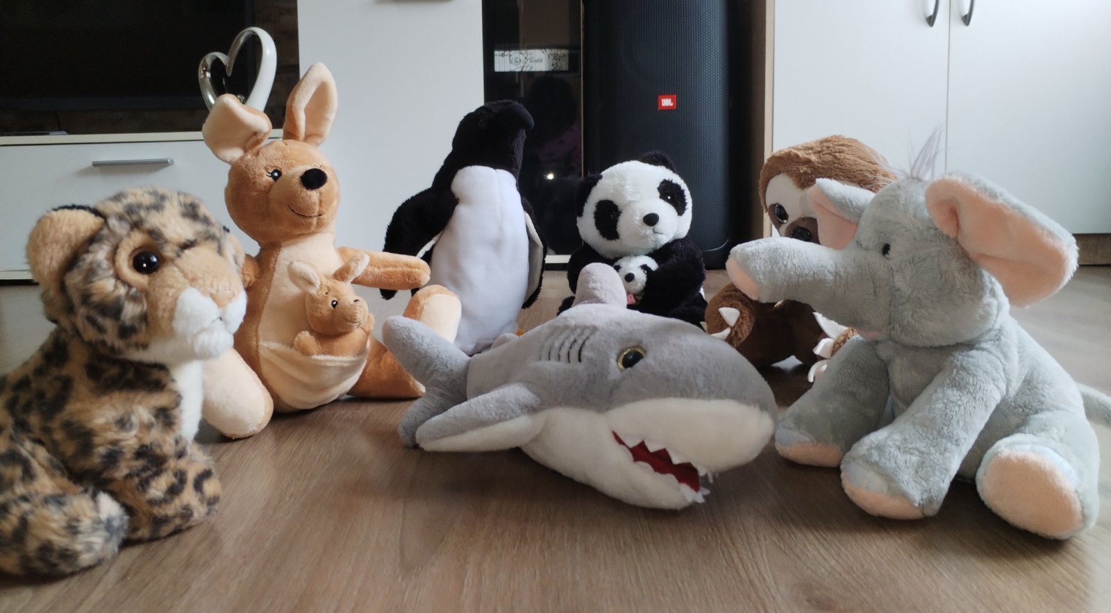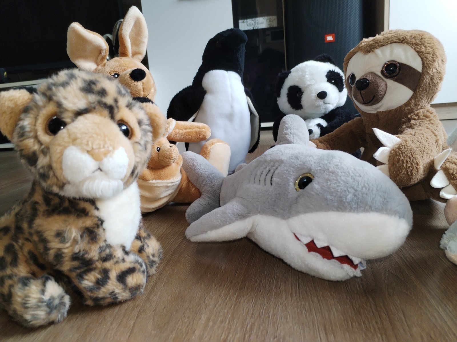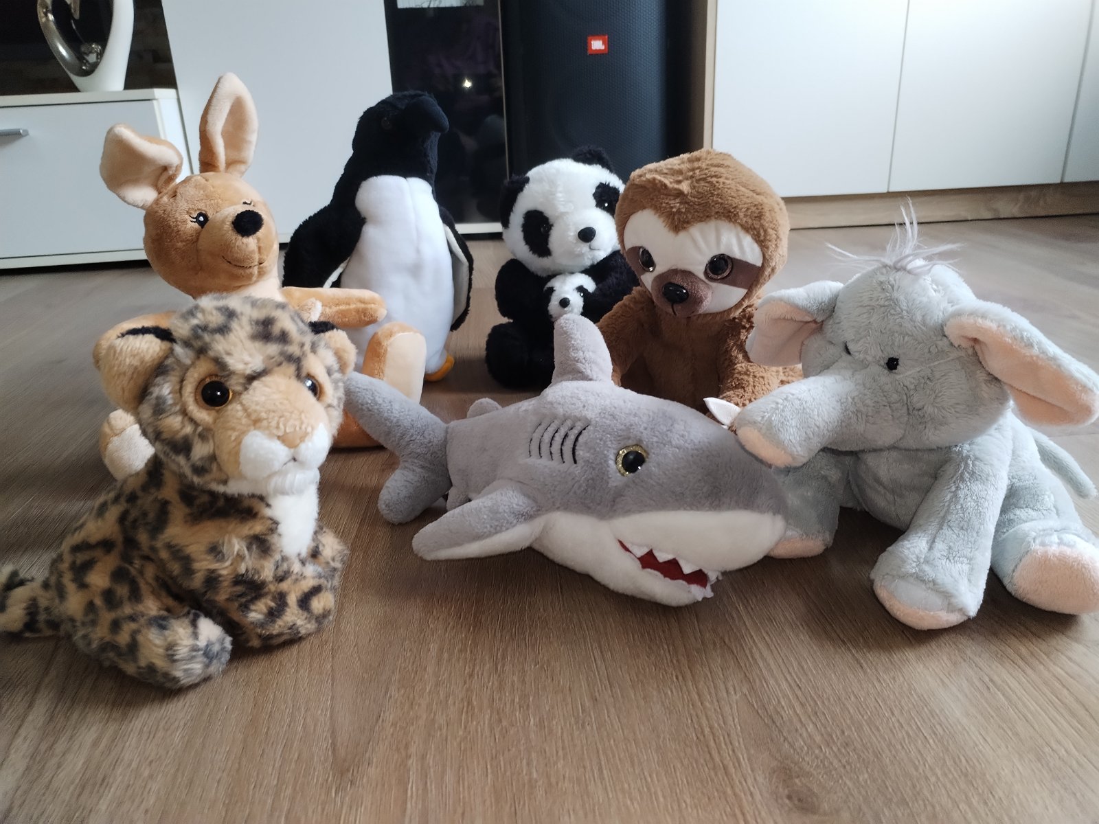 Nabízím plyšová exotická zvířátka: tučňák, lenochod, slon, klokan s mládětem, panda s mládětem, žralok, levhart v top stavu, z čisté nekuřácké domácnosti.