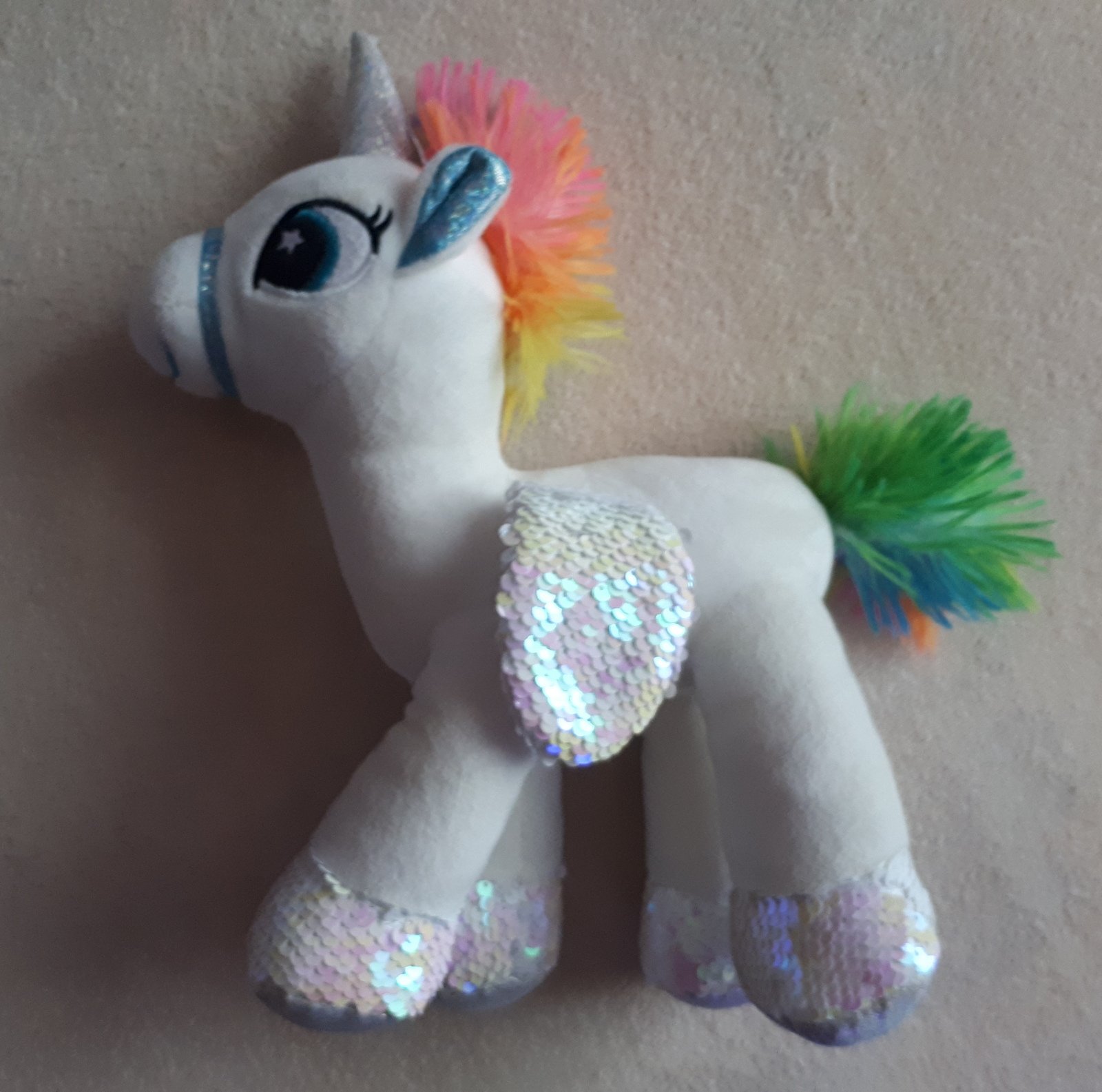 Růžový plyšáček (25cm), bílý plyšáček s měnícími flitry na křídlech a nožkách (30cm) a polštářek s měnícími flitry (30cm)