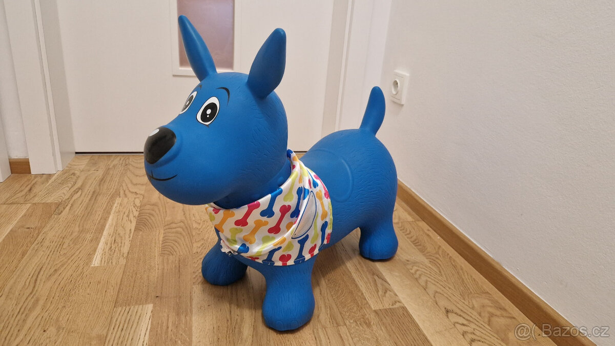Nafukovací skákací pes pro děti ergonomického tvaru. Nejmenším dětem pomůže při jejich prvních krůčcích. Když dítě získá při chůzi jistotu, začne objevovat kouzlo skákání. Uši slouží jako držadla. Kolem krku můžete pejskovi uvázat šátek s popisovací jmenovkou, aby si dítě svého pejska mohlo pojmenovat. Vyroben z odolného materiálu vhodného pro použití doma i venku. Součástí výrobku je i nafukovací pumpička. Rozměry: 58×48×27 cm. Nosnost 35 kg. Vhodné pro děti od 10 měsíců.