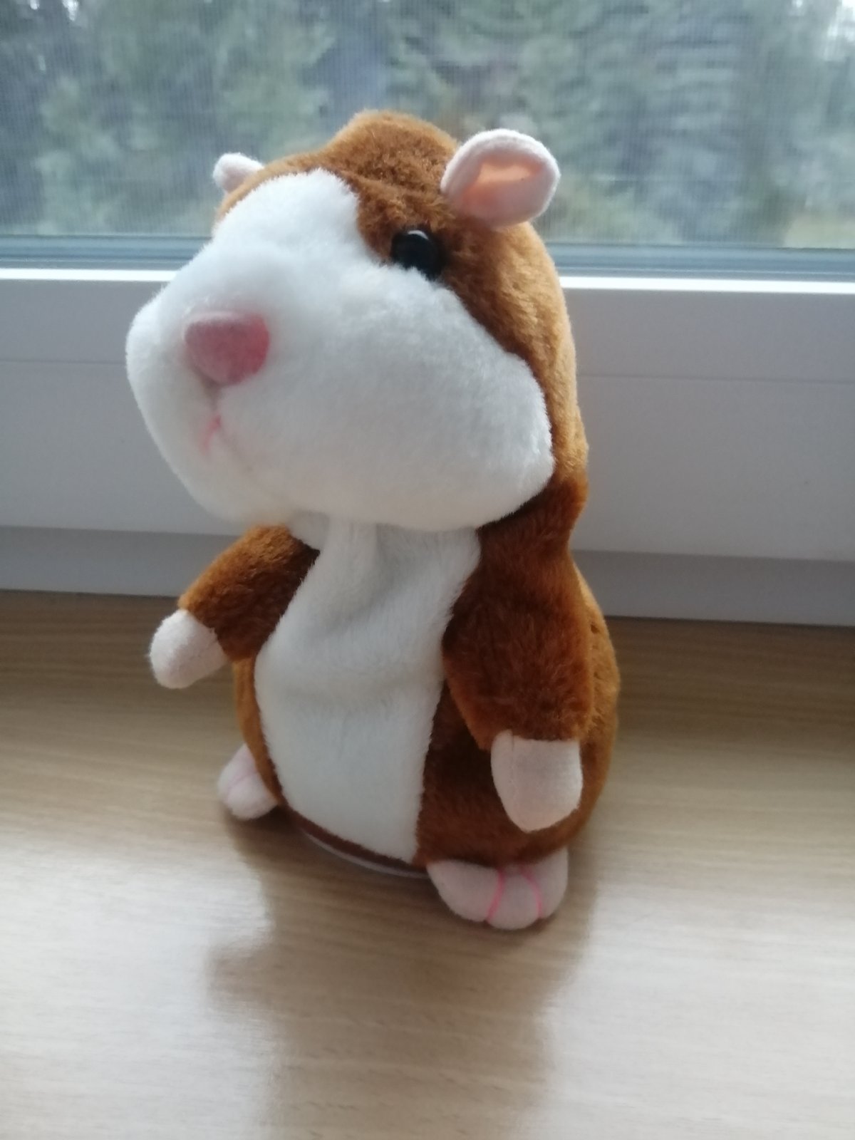 Prodám mluvícího křečka, opakuje slova a věty, na baterie, výška cca 17 cm, bez vad.