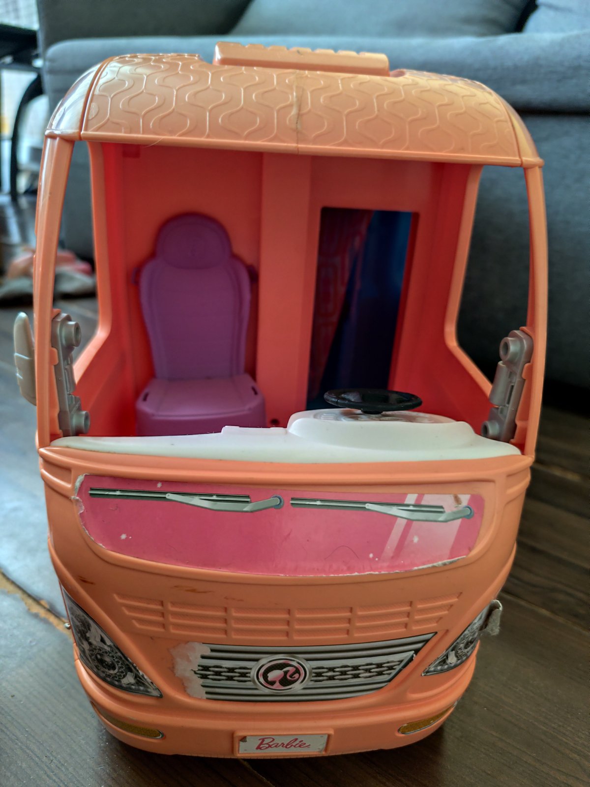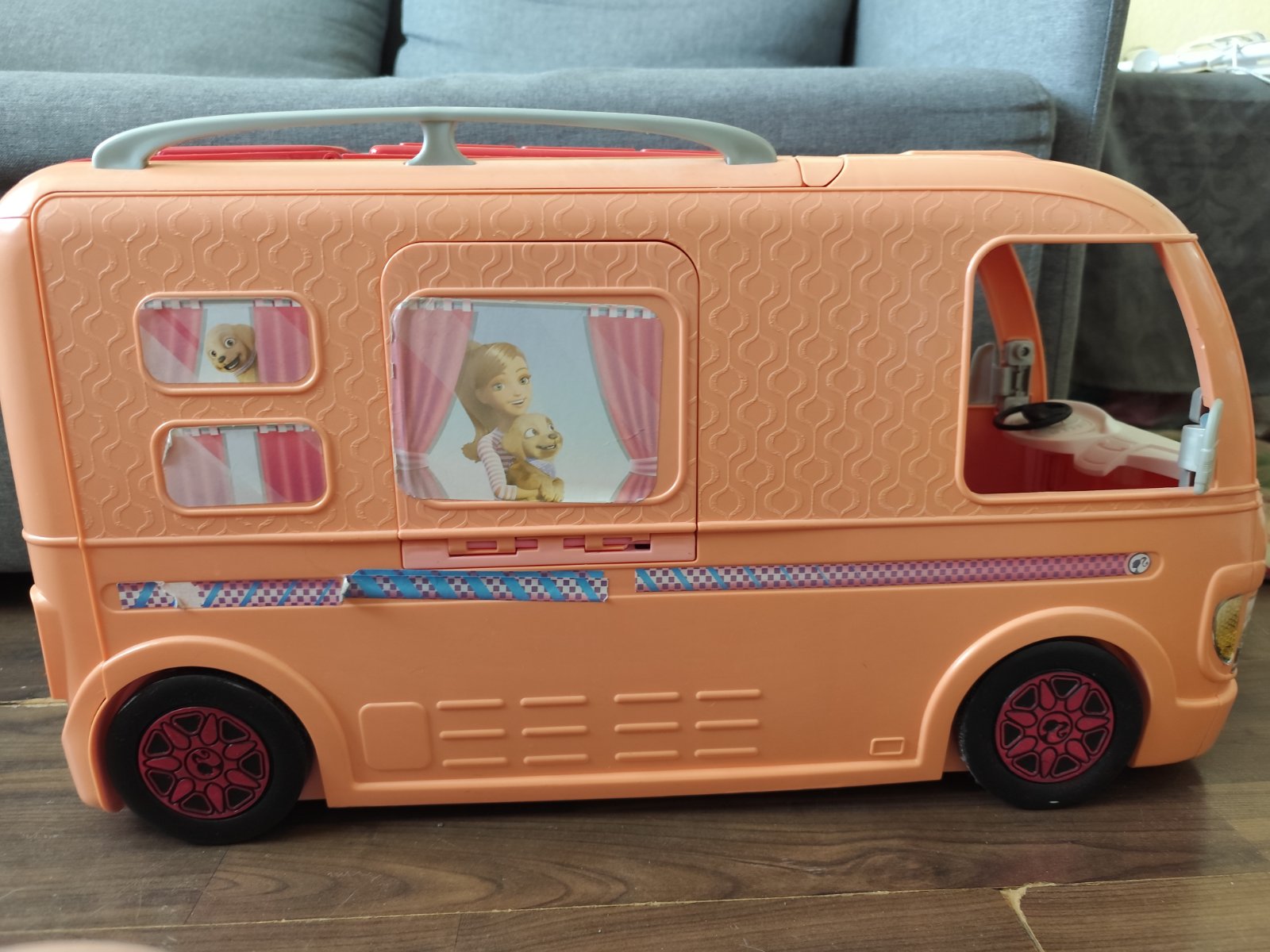 na setrvačník, vhodné pro nejmenší, otočením holčičky jde rozložit, vlásky a přední sklo trošku ošoupaná barva, velikost 13,5x9,5x11cm