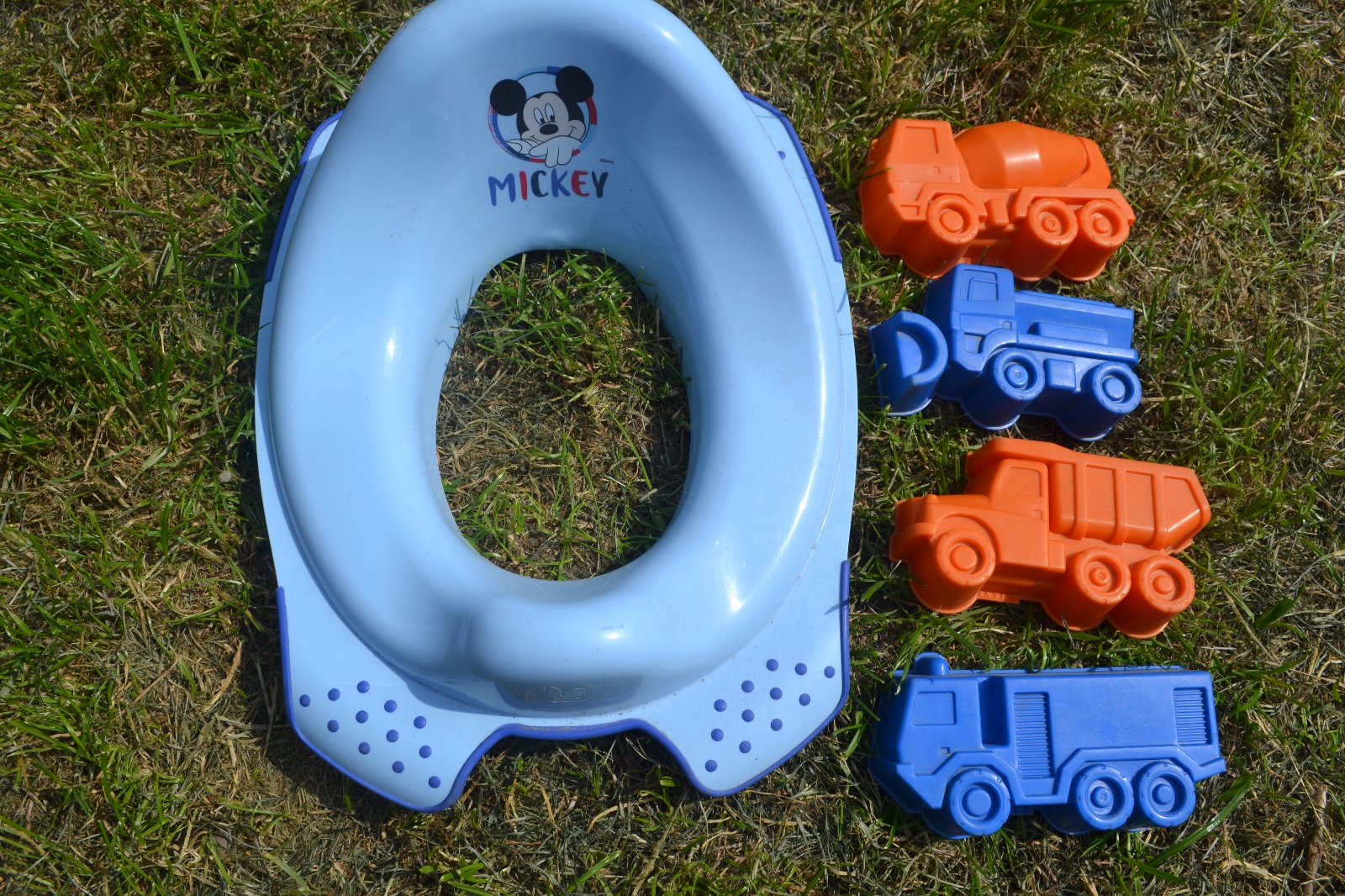 bábovky na písek auta a redukce na WC-dětské sedátko na toaletu, pevné, minimálně použité, kvalitní