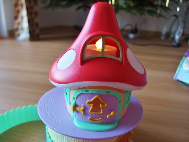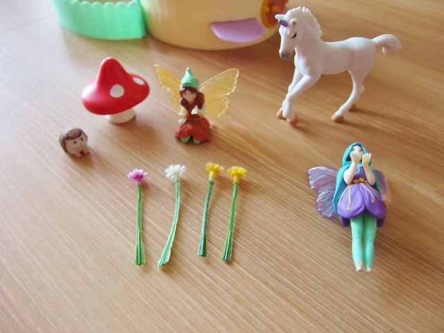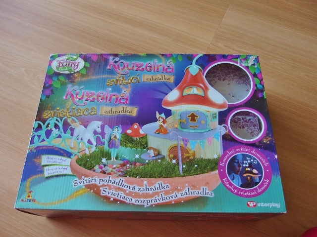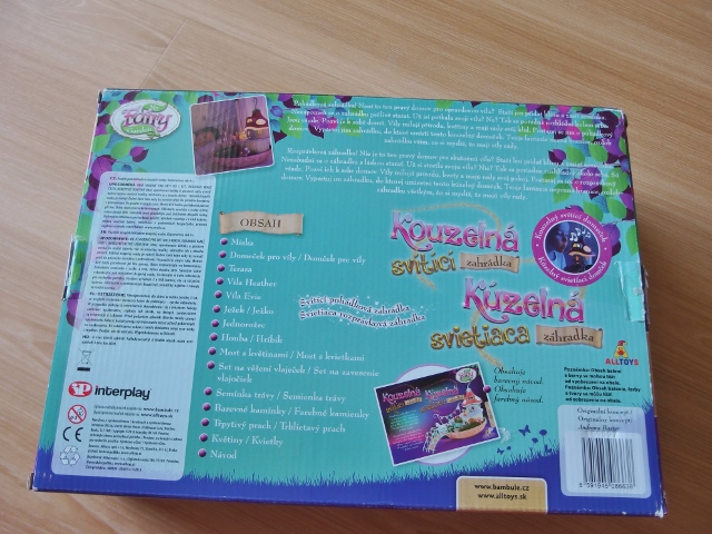 Do misky přidáte hlínu, zasadíte semínka a pak vytvoříte domov pro vílu. Dcerka si hrála se sadou samostatně bez zasazené trávy v hlíně. Některé části nepoužité - kamínky, semínka, papírové vlajky, třpytkové hvězdičky v lahvičce, šnůrka na vlajky. Plastové části na první pohled jsou v top stavu až jako nové. Pouze u domečku chybí horní šťopka. Když se do okénka domečku foukne, rozsvítí se svíčka a ozve se cinkavý zvuk. Dalším fouknutím zhasne. Velká víla stála na podstavci, který je odlomený.
