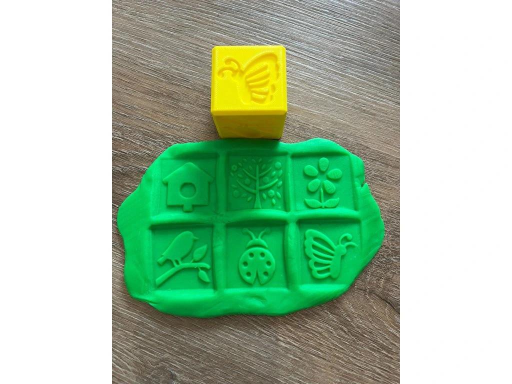 Otiskávací kostka je vhodná jako doplněk k plastelíně, kinetickému písku a k podobným hmotám.