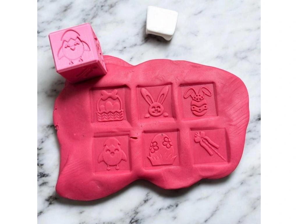 Otiskávací kostka je vhodná jako doplněk k plastelíně, kinetickému písku a k podobným hmotám.