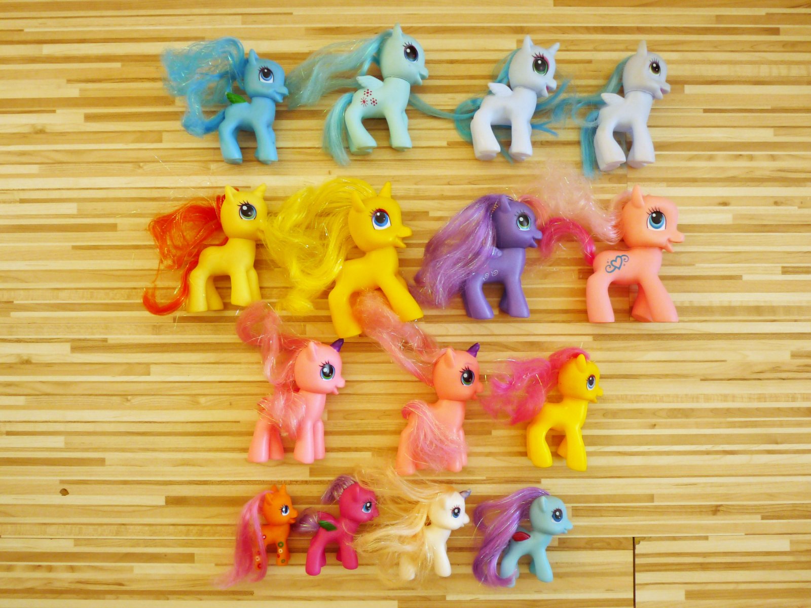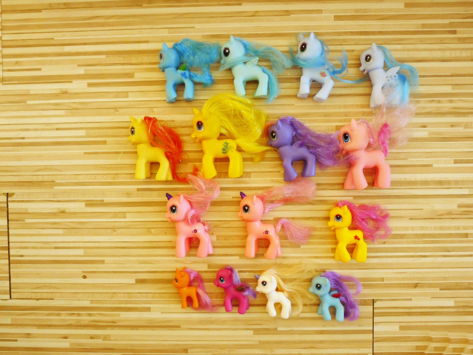 Poníci na hraní 15 ks. Jedná se o neoriginální poníky různých značek. Jsou hraní, takže občas mají nějakou kosmetickou vadu - ošoupanou malbu, chybějící pramínek vlasů, zastřižené vlasy, občas mají někde čmáranec. Jsou ale všichni umytí, učesaní a připravení na další hraní :-)