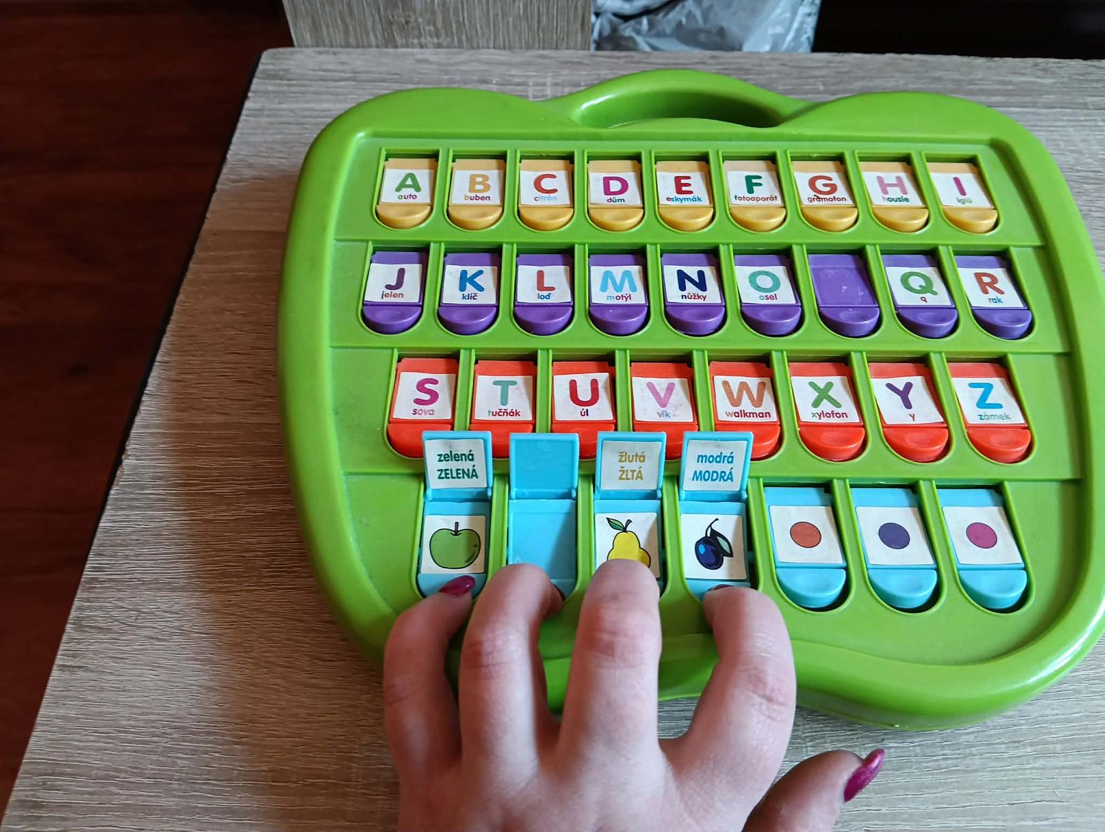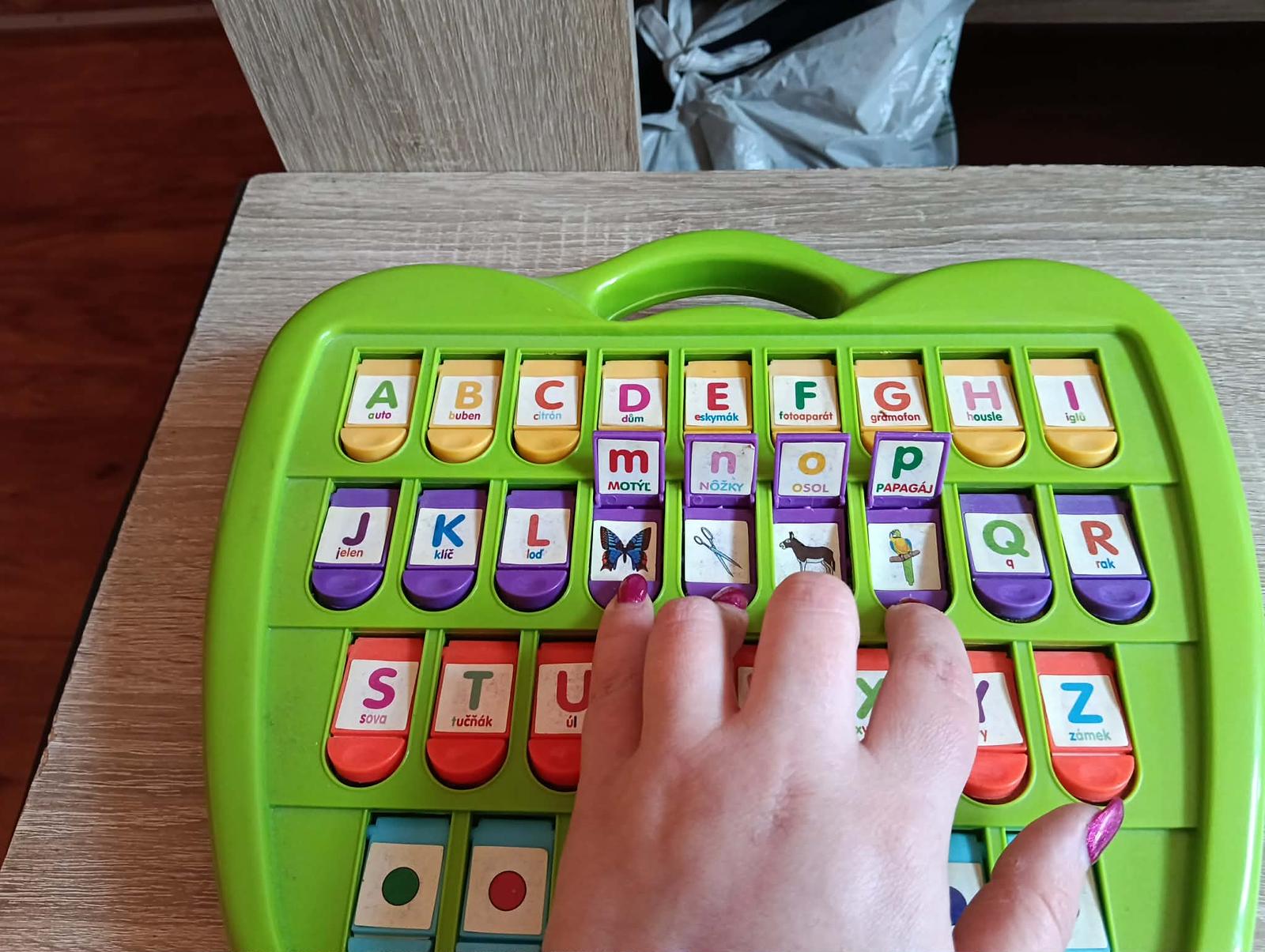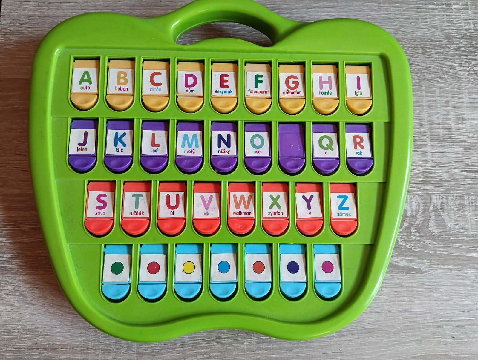 Obsahuje českou abecedu, obrázky a barevná tlačítka. Dítě si může posouváním tlačítek procvičovat písmena, slova i barvy. Hračka má praktické madlo, takže se dobře přenáší.