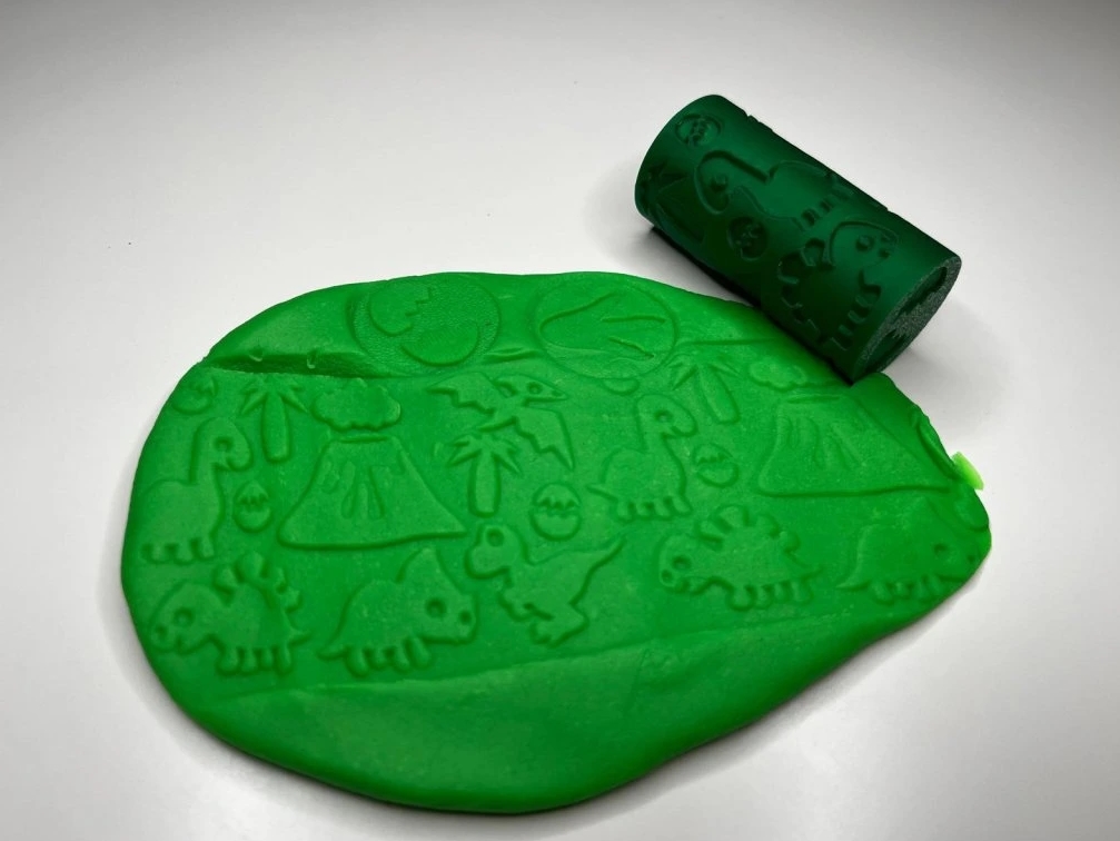 Otiskávací váleček je vhodný jako doplněk k plastelíně, kinetickému písku a k podobným hmotám.