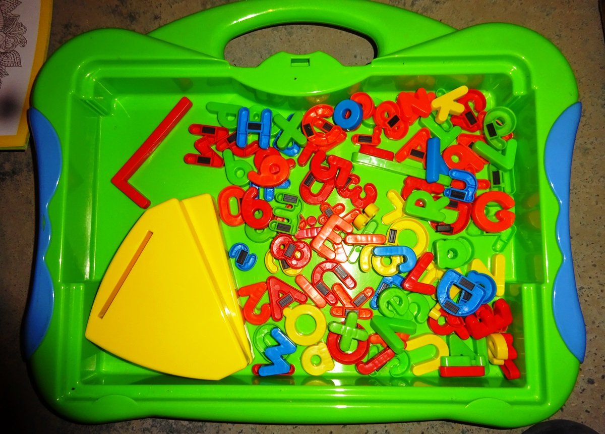 Mám 3 sady: 2 jsou se spodní příhrádkou na písmenka a čísla jako kufřík, K té sadě vpravo patří ještě písmenka co jsou jen vyfocená zvlášt,zapoměla jsem je tam vložit tak dofoceno. Třetí sada je tabulka + písmenka bez kufříku na fotce společně. Cena za sadu 100,-