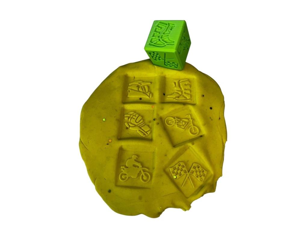 Otiskávací kostka je vhodná jako doplněk k plastelíně, kinetickému písku a k podobným hmotám.