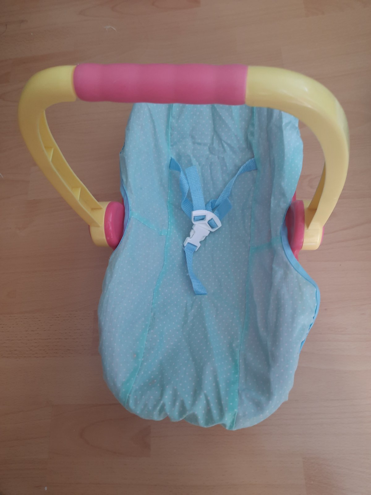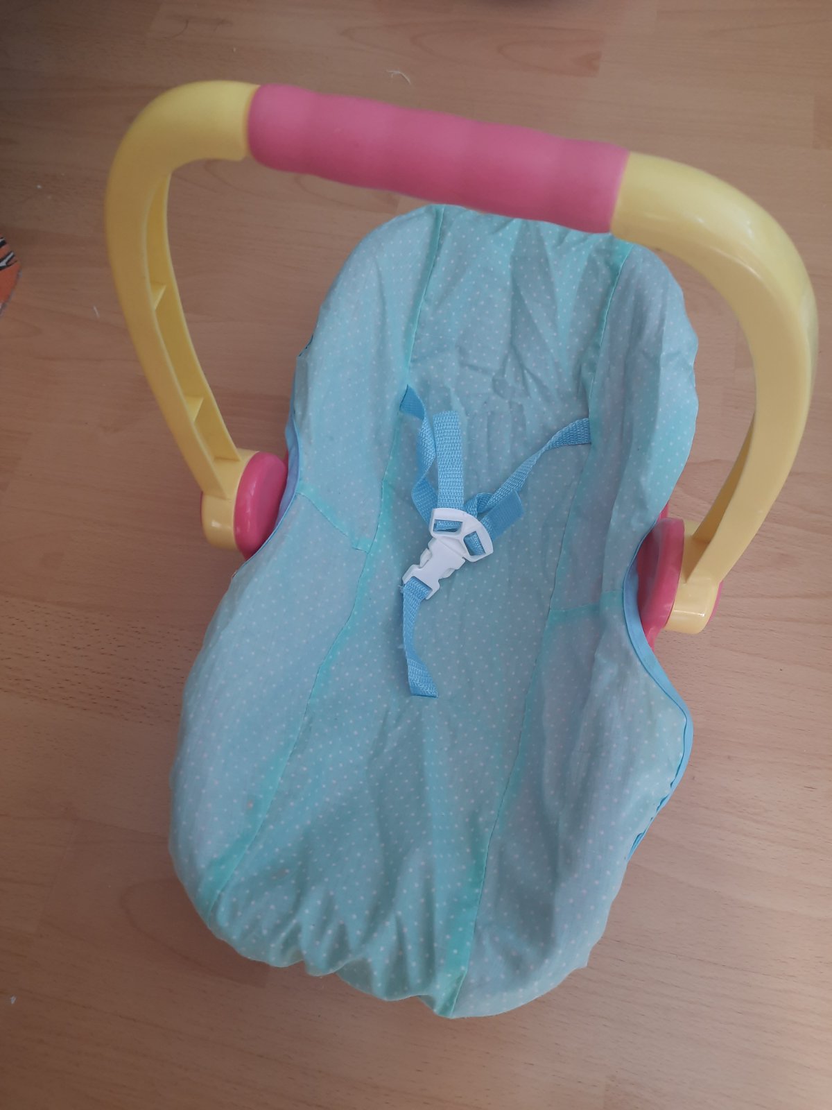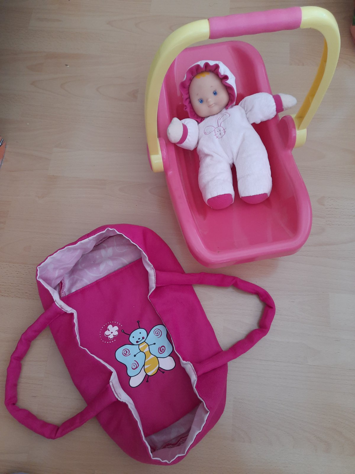 Plastová autosedačka, nosící taška, látková panenka. Hrané, známky použití, ale ještě poslouží. Možné předání v Plzni