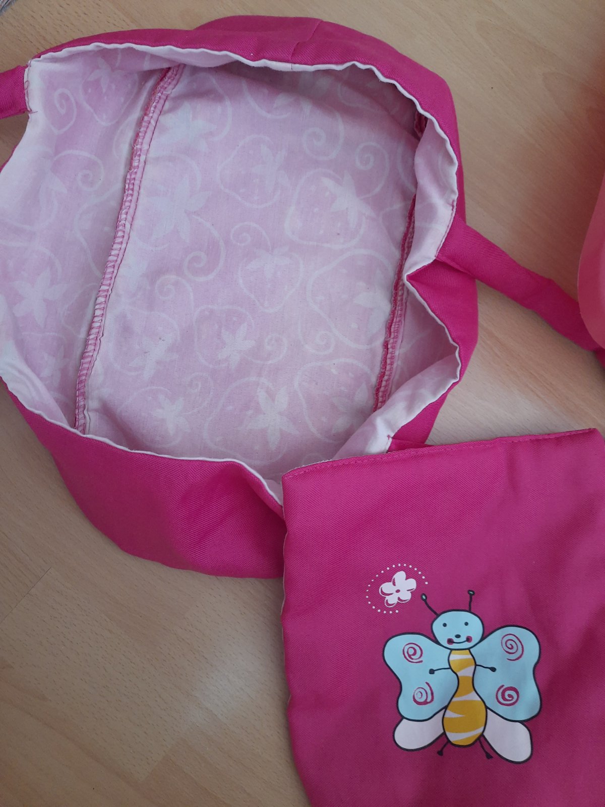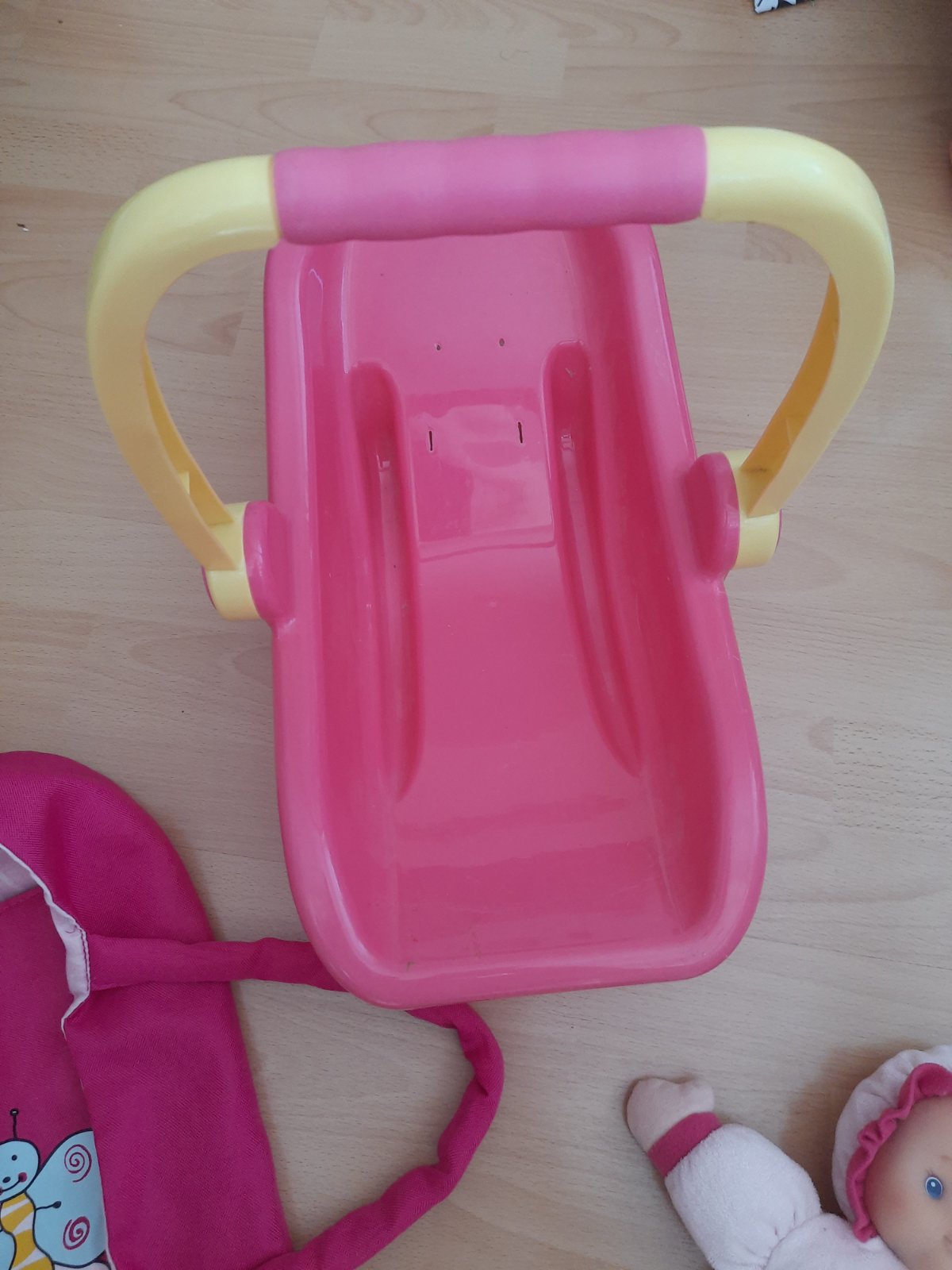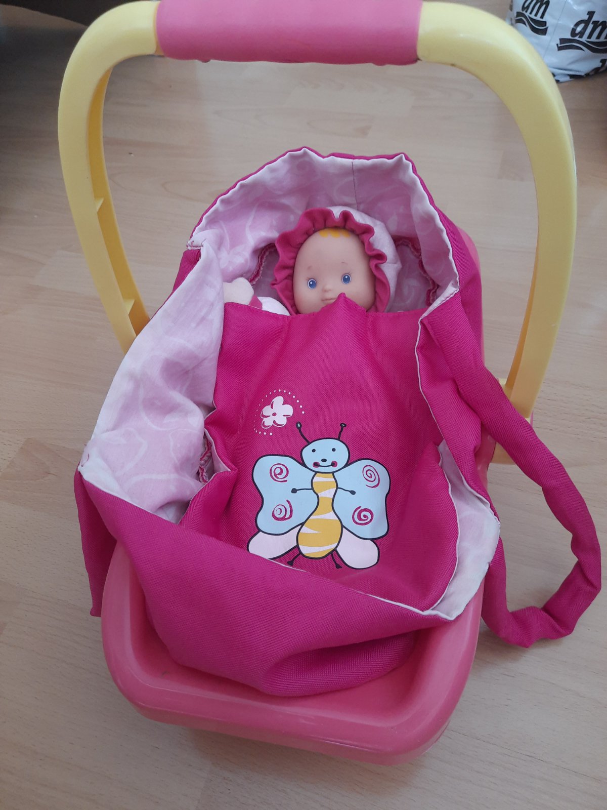 Plastová autosedačka, nosící taška, látková panenka. Hrané, známky použití, ale ještě poslouží. Možné předání v Plzni