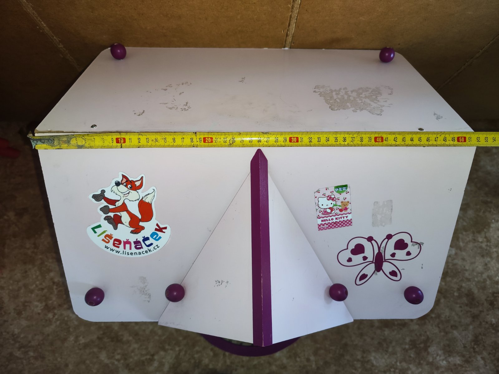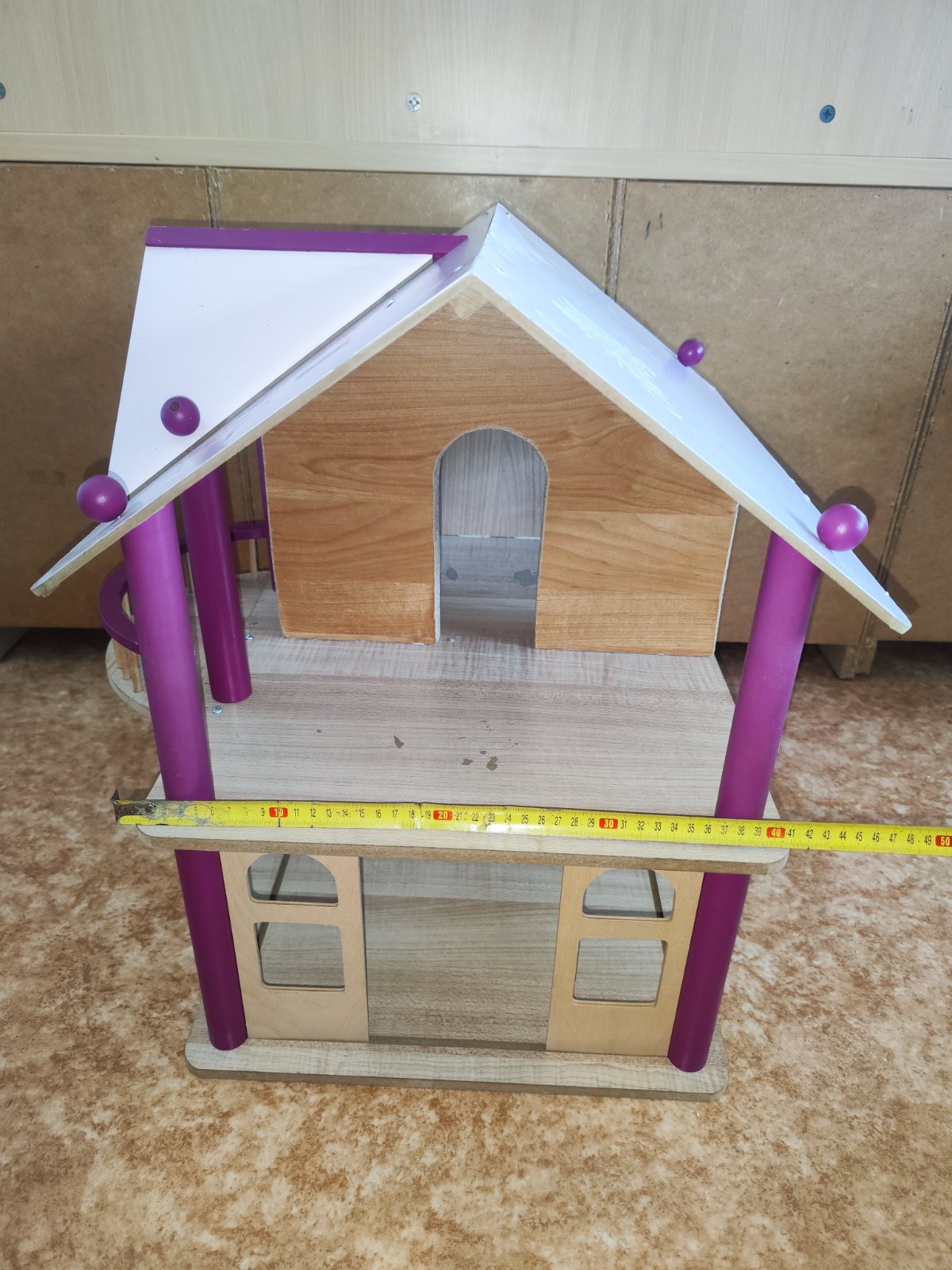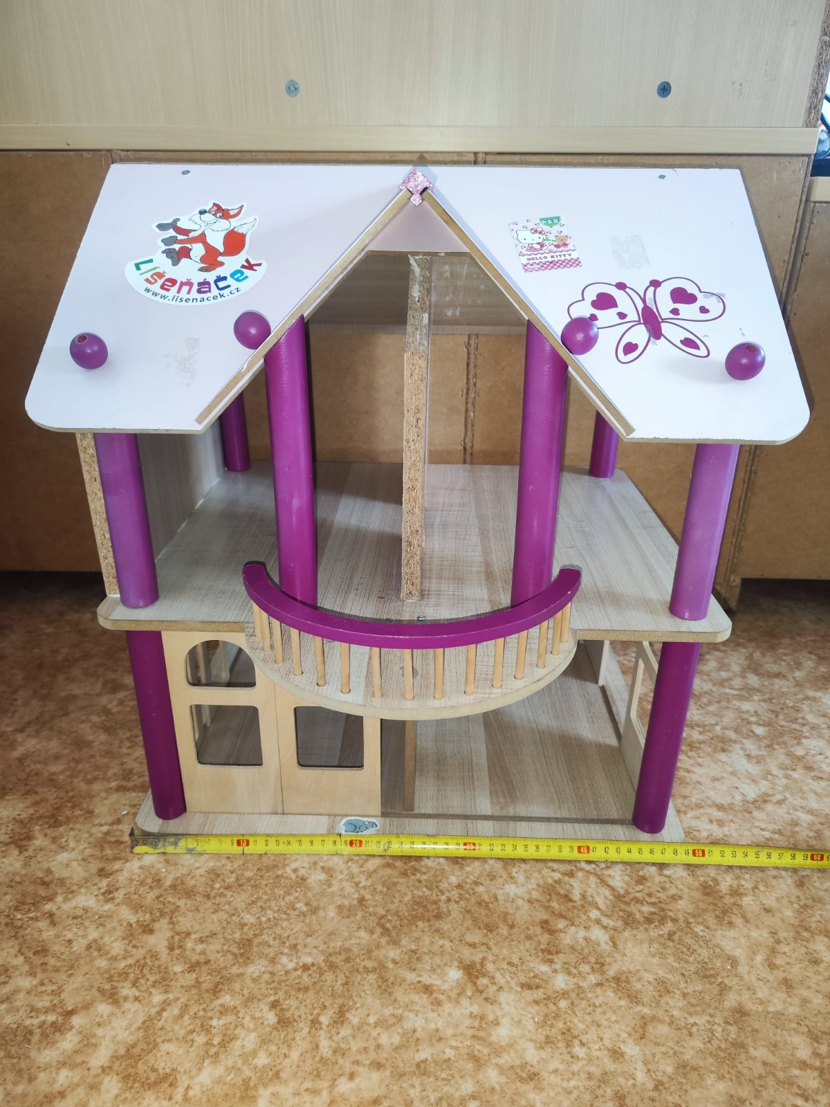 Prodám dvoupatrový dřevěný domeček pro panenky s fialovými sloupy, balkónem. Součástí je sada barevného plastového nábytku. Dům je konstrukčně pevný, ale vhodný na renovaci – nový nátěr. Rozměry domečku – cca 55 x 49 x 41 cm. Sada nábytku obsahuje celkem 24 kusů – např. postel, vanu, toaletu, umyvadlo, skříně, komody, kuchyňskou linku, stůl, židle, křeslo, krb, lampa, hodiny, tác s jídlem… Cena 500 Kč, v Brně možné osobní předání.