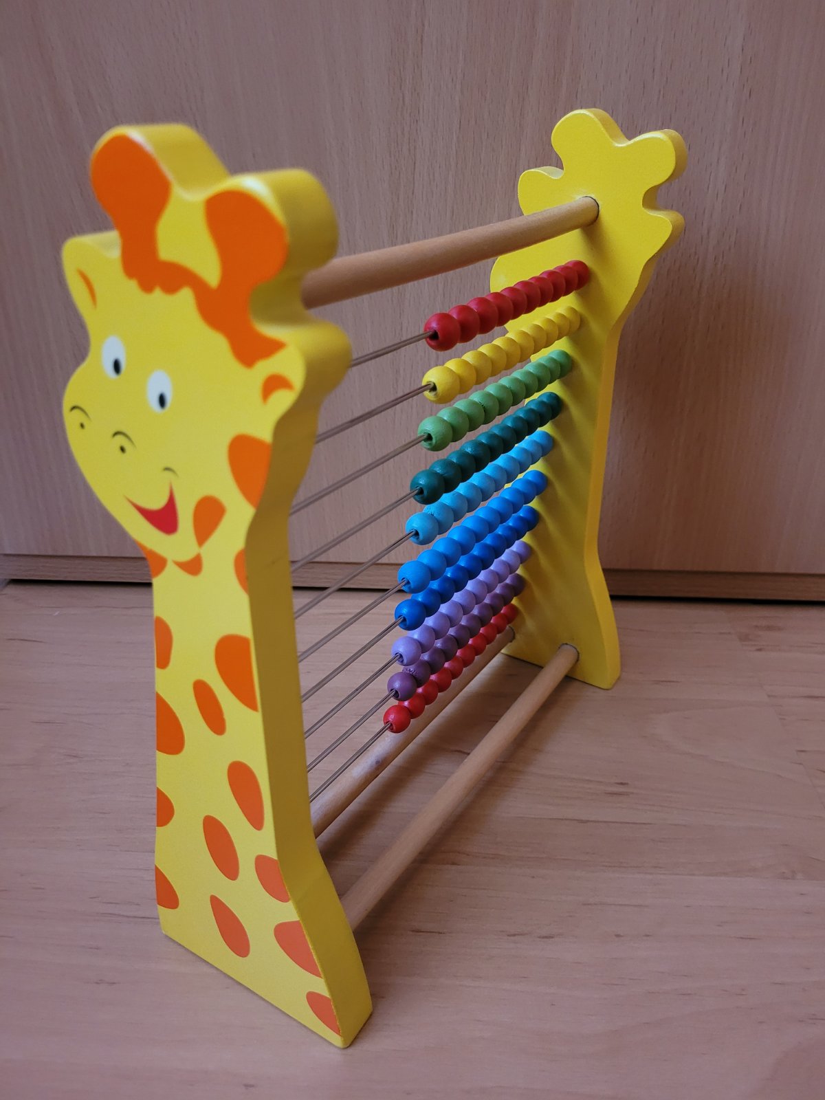 Dřevěné počítadlo se žirafou značky Woody s dřevěnými kuličkami v duhových barvách.