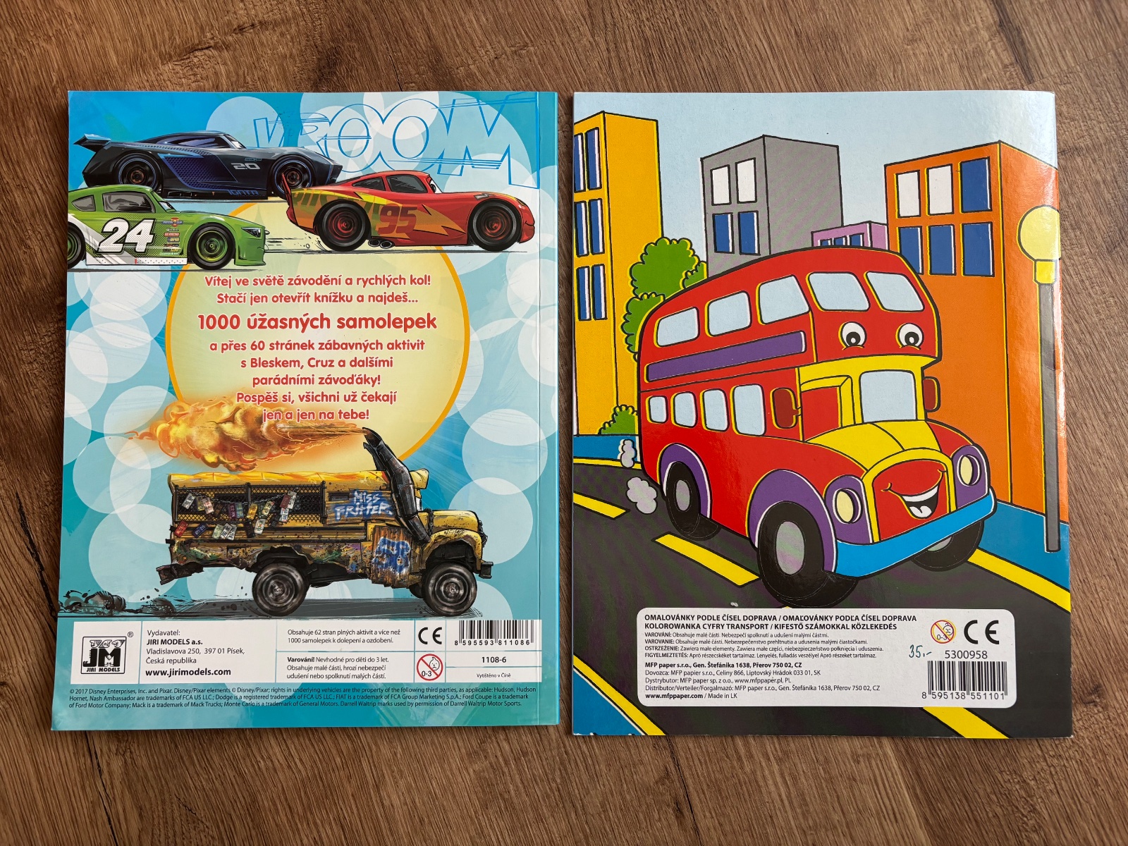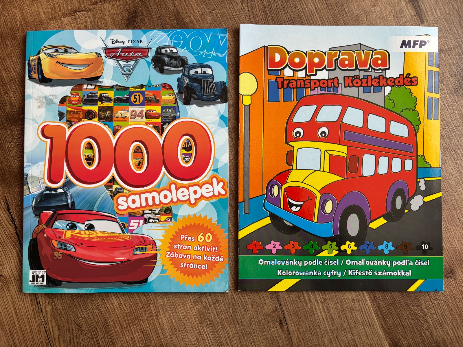 Nové nepoužité časopisy - jeden s Bleskem McQueenem, kde je více než 1000 nálepek, úkoly, bludiště a omalovánky. A druhý časopis jsou omalovánky - vybarvování podle čísel. Oboje nové, nepoužité.